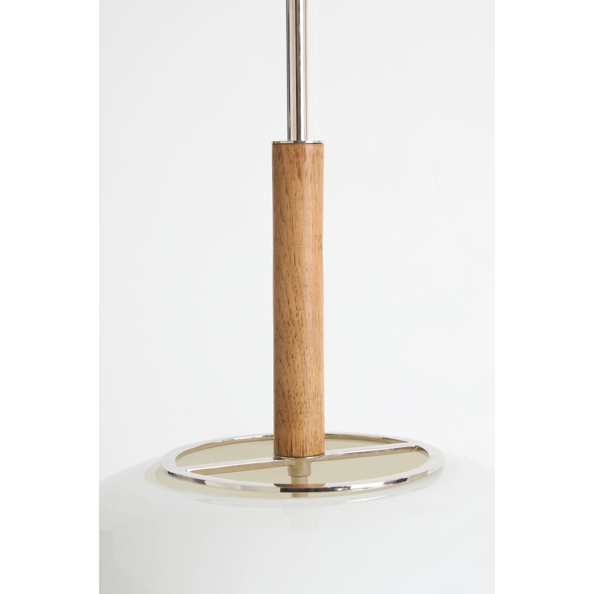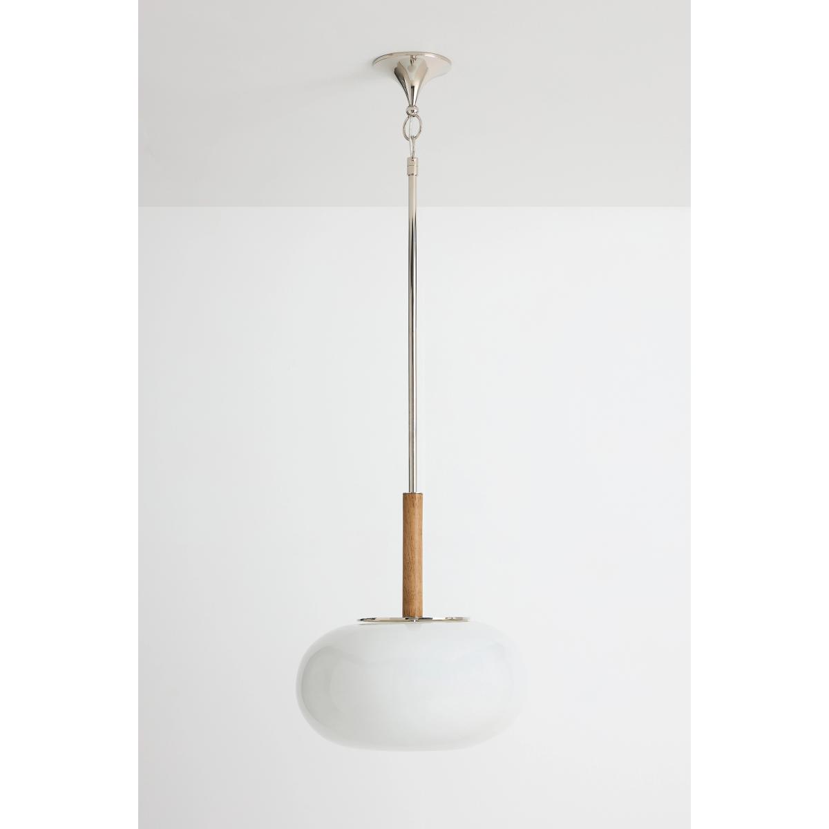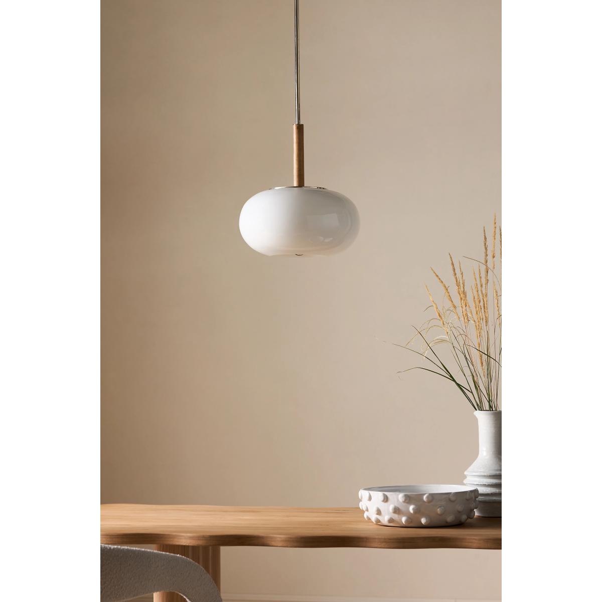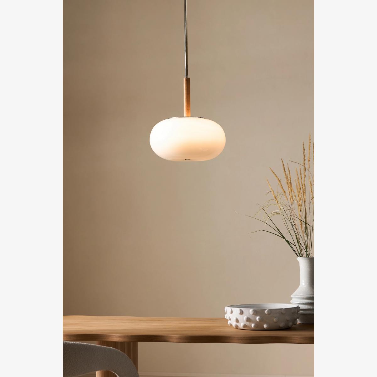 The Dora Glass Semi-Flush Mount Pendant combines contemporary style with timeless elegance, featuring a sleek glass shade that casts a warm, inviting glow while seamlessly complementing any décor. *This item is CE listed, meaning it has been tested and approved to meet the government-regulated safety standards for the UK. Use with electrical outlets of 230v or lower, as anything higher can cause fire or injury. If you're purchasing this item for use outside of the United Kingdom, employ the adapter and voltage converter suited for your country* * Damp-rated * Steel, glass, oak wood, nickel * Hardwired; professional installation recommended * Can be installed on a sloped ceiling * Includes canopy and pole kit * Adjustable hanging height * Two light sockets * CE listed * Imported