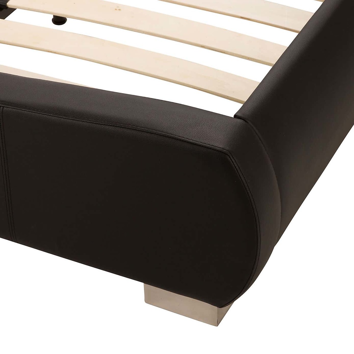 Impress your loved one with the Dorado Black Faux Leather Bed Frame, a seriously stylish bed frame with gorgeous black faux leather upholstery. This bed frame features a curved headboard and attractive foot end that will make it look superb in any setting. The sprung slatted base offers more support in addition to helping improve mattress longevity. Sleek chrome feet give you a perfect finishing touch.