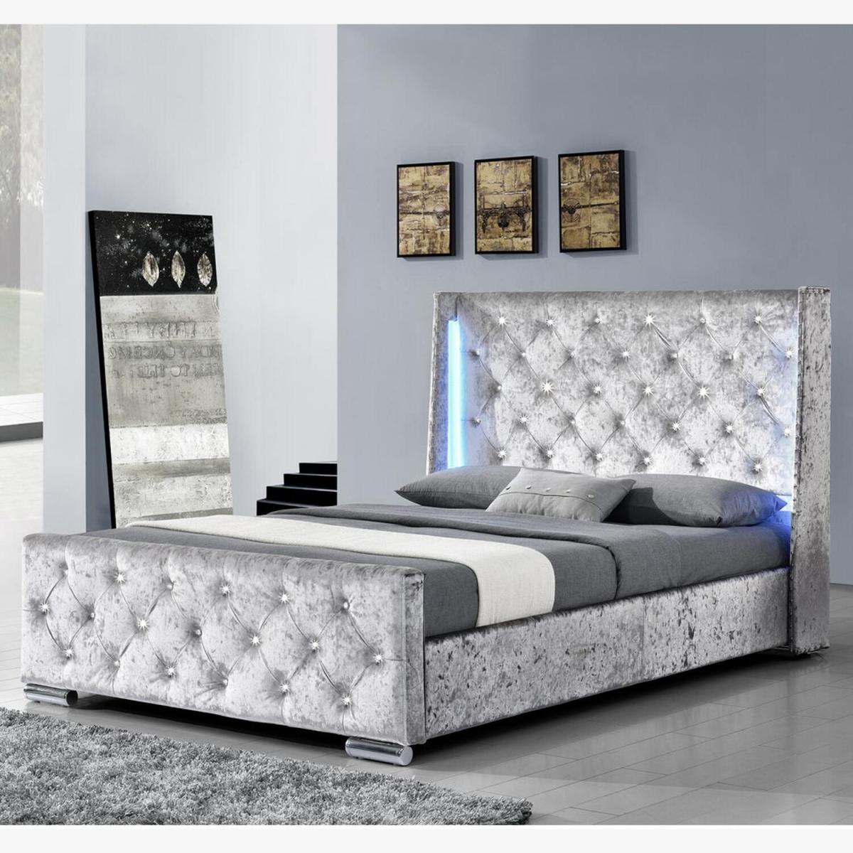 The Dorchester will make an impressive statement for any modern bedroom. Its winged headboard has an LED panel down each side emitting a beautiful glow. The traditional deep buttoned head and footboard are studded with sparkling diamantes, finished in luxurious silver crushed velvet fabric upholstery. The Led display features a 16 colour LED light engine (supplied with wireless remote control) that emits 4 basic colours White, Red, Green, and Blue. In addition to the static fixed colour, you can select any of the following modes strobe, flash, fade or smooth.
