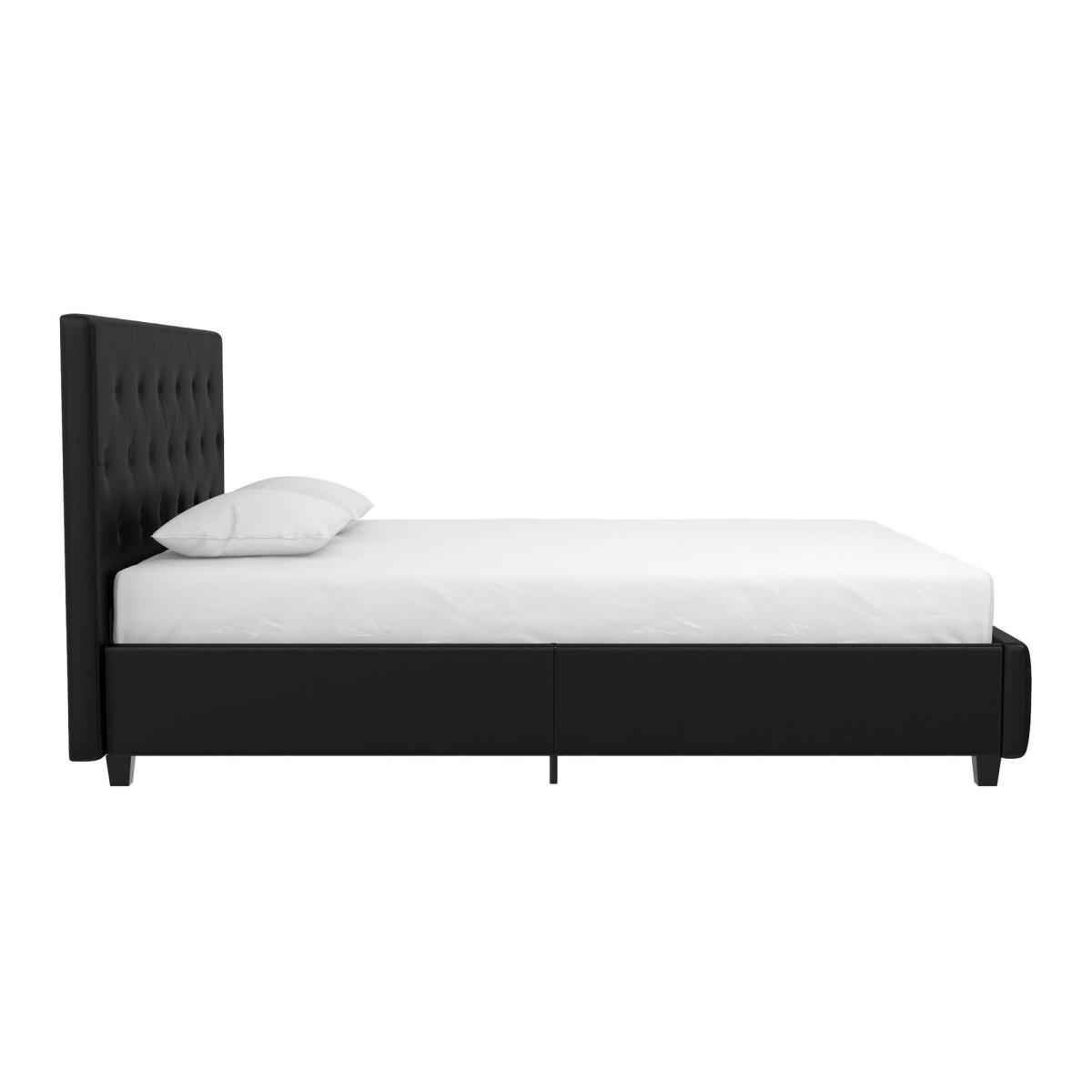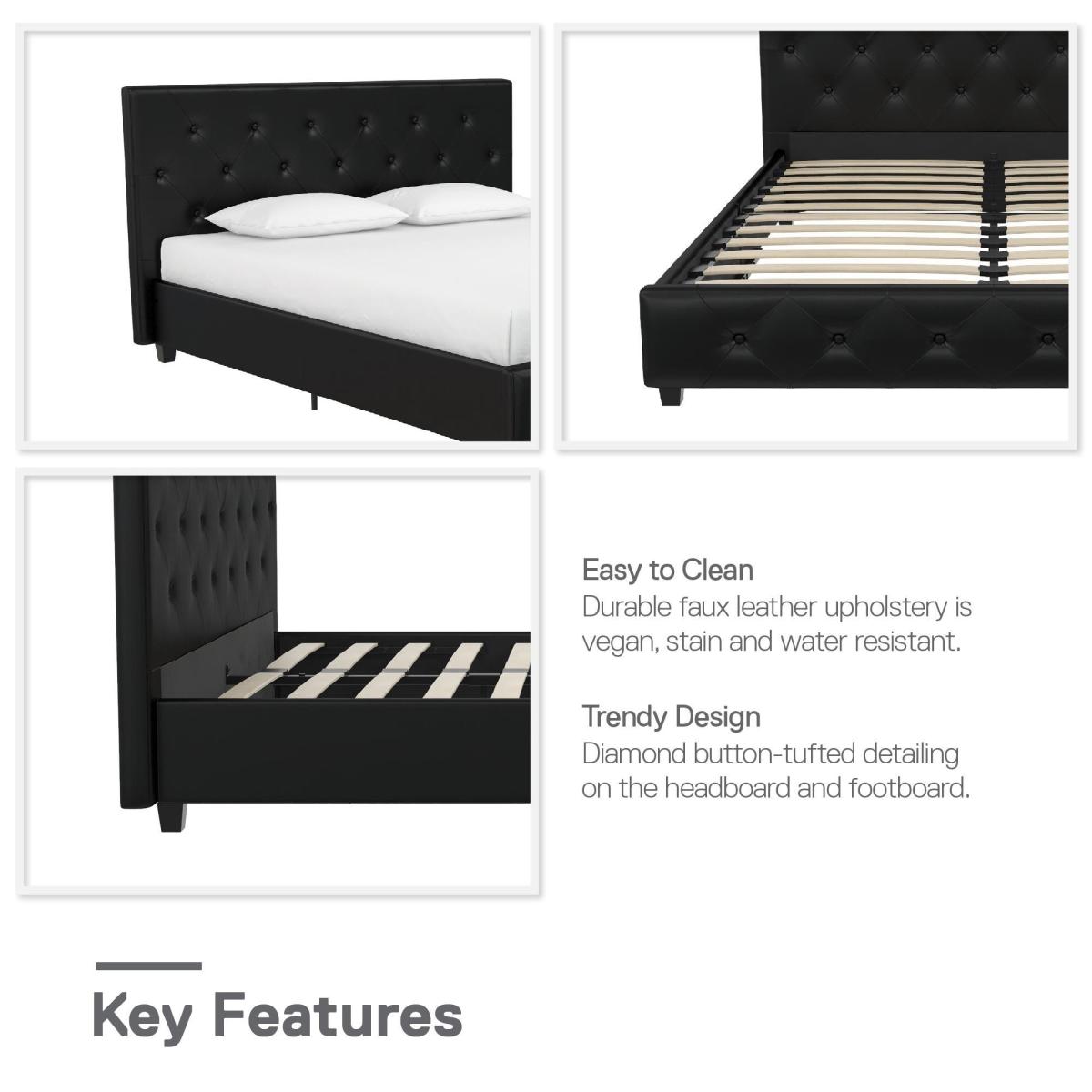 * Contemporary Bed* Upholstered Frame* Easy to Assemble Add an element of class to your bedroom décor with the contemporary luxury of the Dakota Upholstered Bed. Its sleek design features diamond button tufted detailing on the headboard, exuding modern chic. Available in black faux leather, this bed exudes sophistication and comfort. No box spring needed with its sturdy platform design, and the frame's adjustability allows for underbed storage, combining style and functionality seamlessly.
