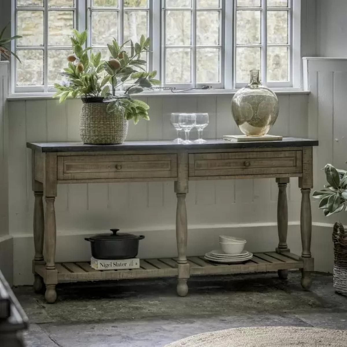 This lovely console offers practicality, combined with a stylish sophisticated yet rustic look, with its marble top, two drawers and large shelf. It is crafted from North American pine solids and veneers where practical, with the clever use of a mill saw giving characteristic features of cross sawn timber to create a tactile, dramatic finish. Matching pieces are available. Material:Stone / Pine / Pine Veneer / Plywood. Colour/Finish: Natural.