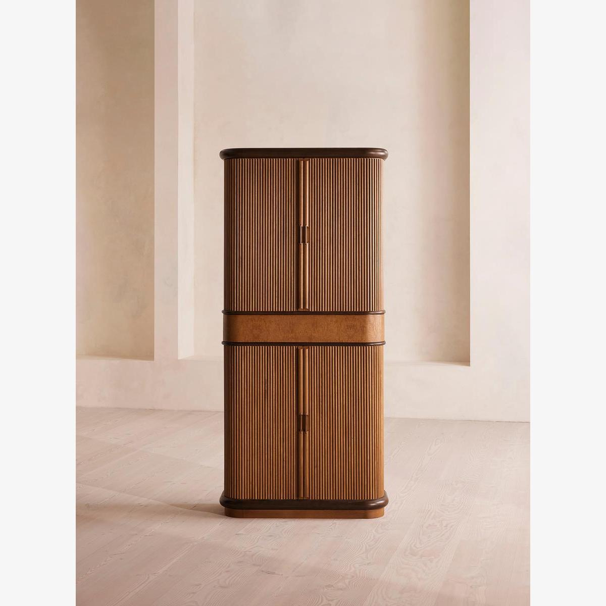 This closet has upper and lower cupboards fitted with a flip drawer, shelves and hooks to offer storage space for shoes, jackets and more. Mirroring the curved storage spaces seen throughout the bedrooms of White City House, the Dorian entryway closet has a chunky, rounded frame carved from oak wood with olive ash burl drawers. Its upper and lower tambour cupboards house an adjustable shelf, storage hooks and shoe racks, as well as one drawer.