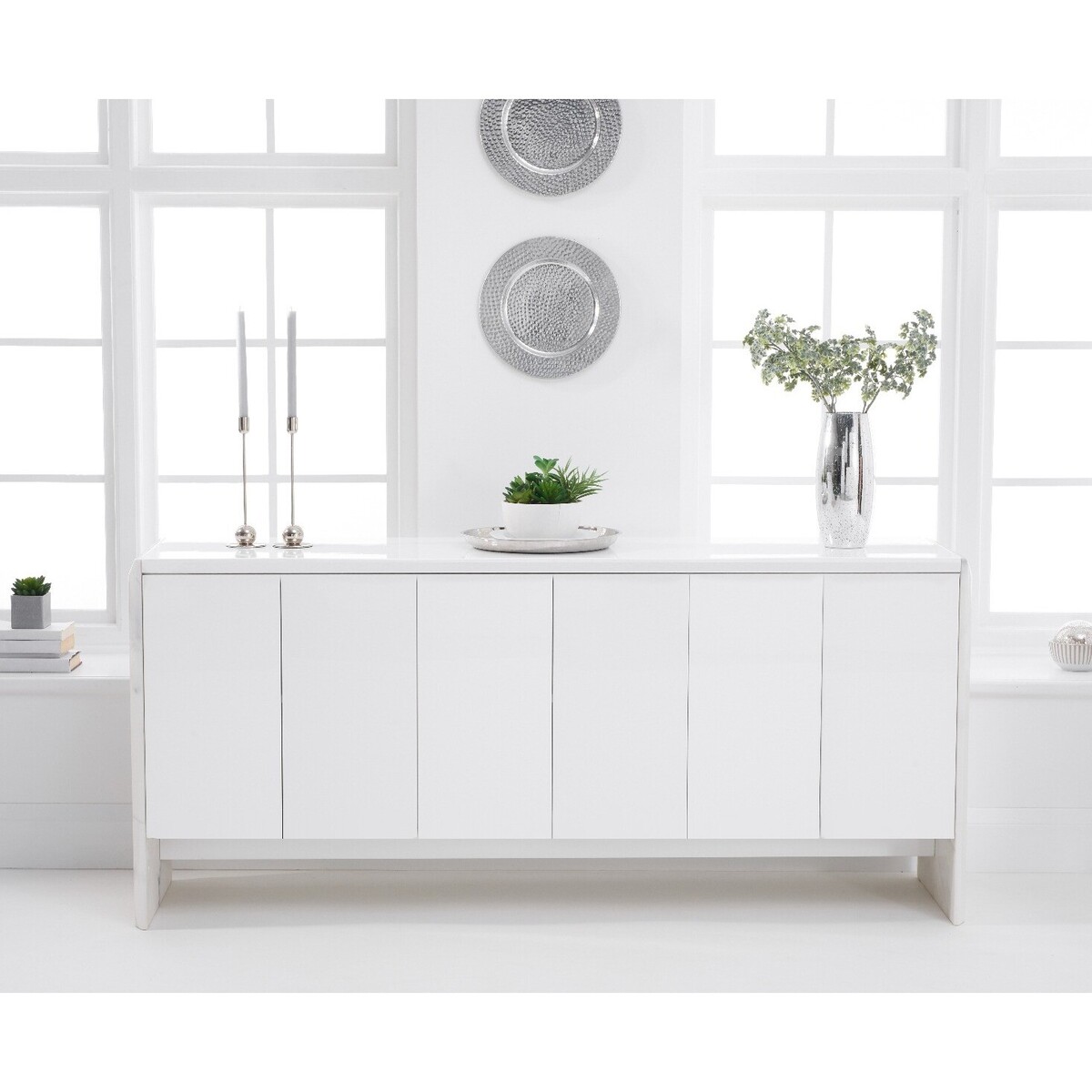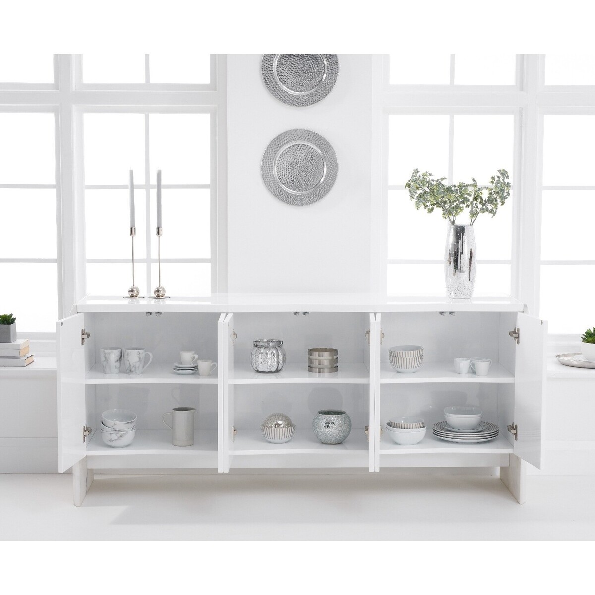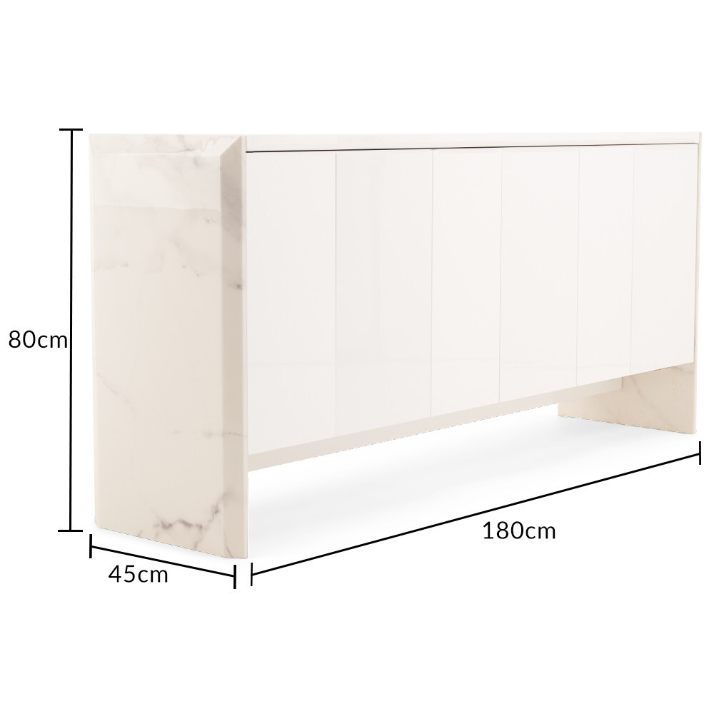 The Dorit collection is an opulent range that guarantees a luxe look for your home. With gloss finishes and marble sides, these sideboards are elegant, sophisticated and on-trend. The large white sideboard offers plenty of storage space for your dinnerware, with six doors and three cupboards with shelves. With smooth white gloss, the Dorit features stunning dappled marble effect sides with natural patterning for a standout modern look.