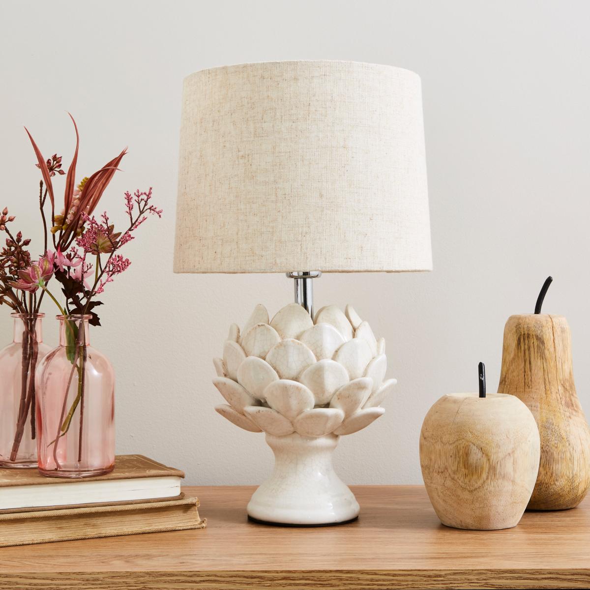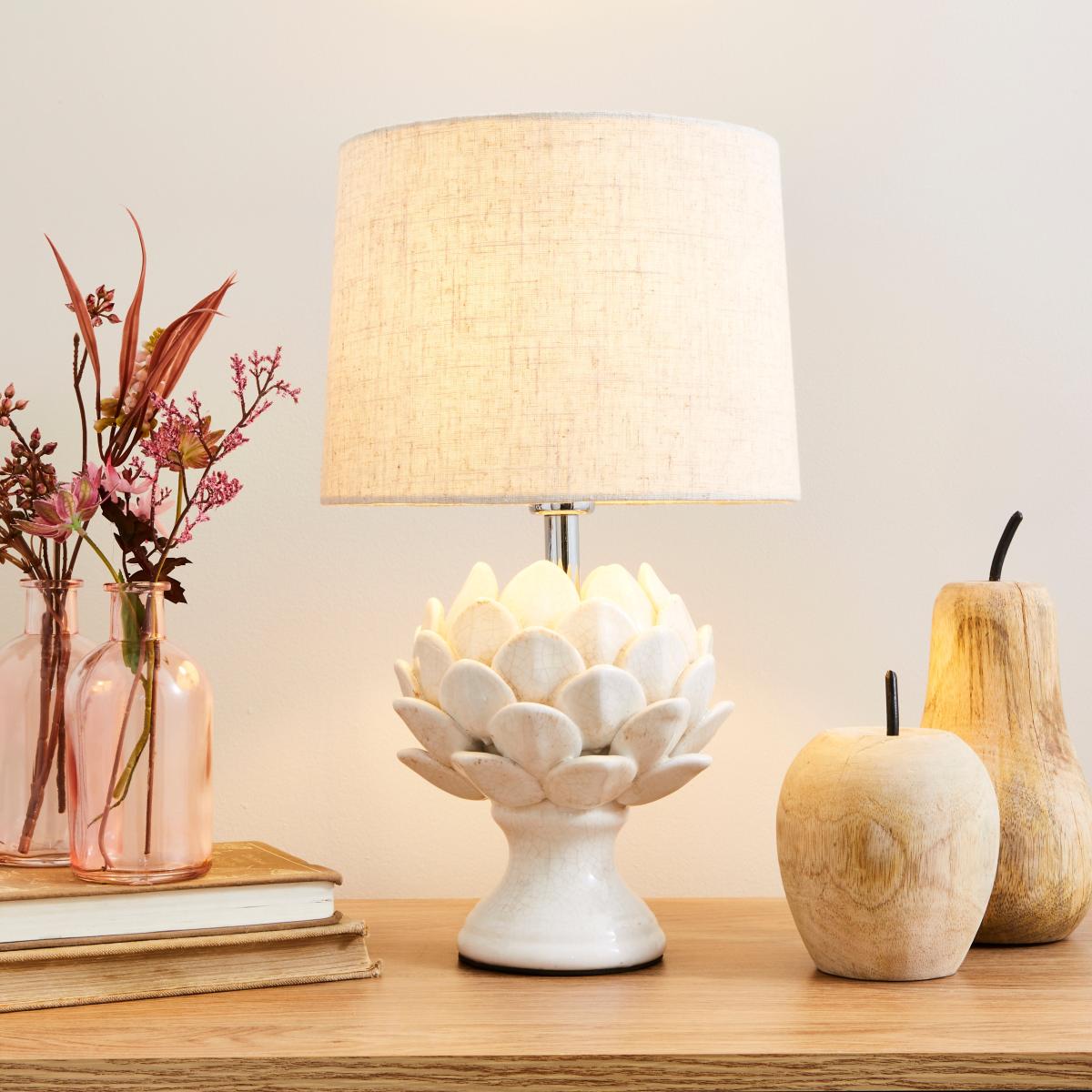 I love this little lamp for its fresh, neutral tone and charming design that adds warmth without overpowering a space. The artichoke motif on the base brings a touch of nature-inspired texture, making it versatile in both classic and contemporary interiors. It works well on side tables, console tables, or bedside cabinets where it can add soft ambient lighting. Practical styling tips include pairing it with other natural materials like wood or linen, and keeping the surrounding decor simple to let the lamp be a focal point. Its understated elegance makes it suitable for schemes aiming for a calm, sophisticated look-perfect for bedrooms, living rooms, or even a cosy reading nook.
