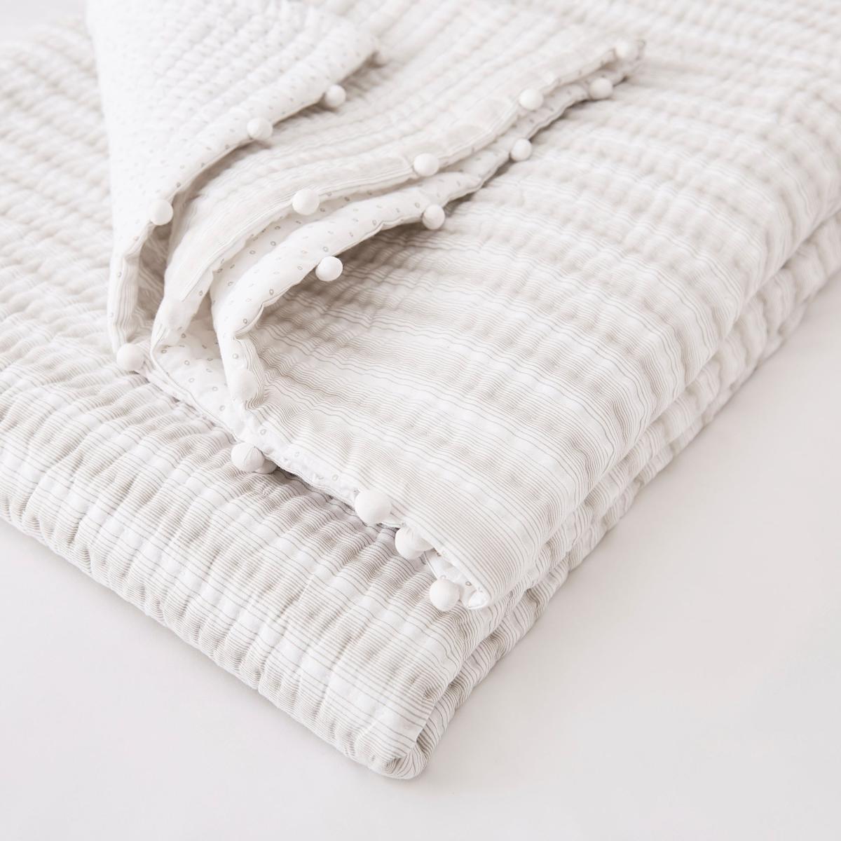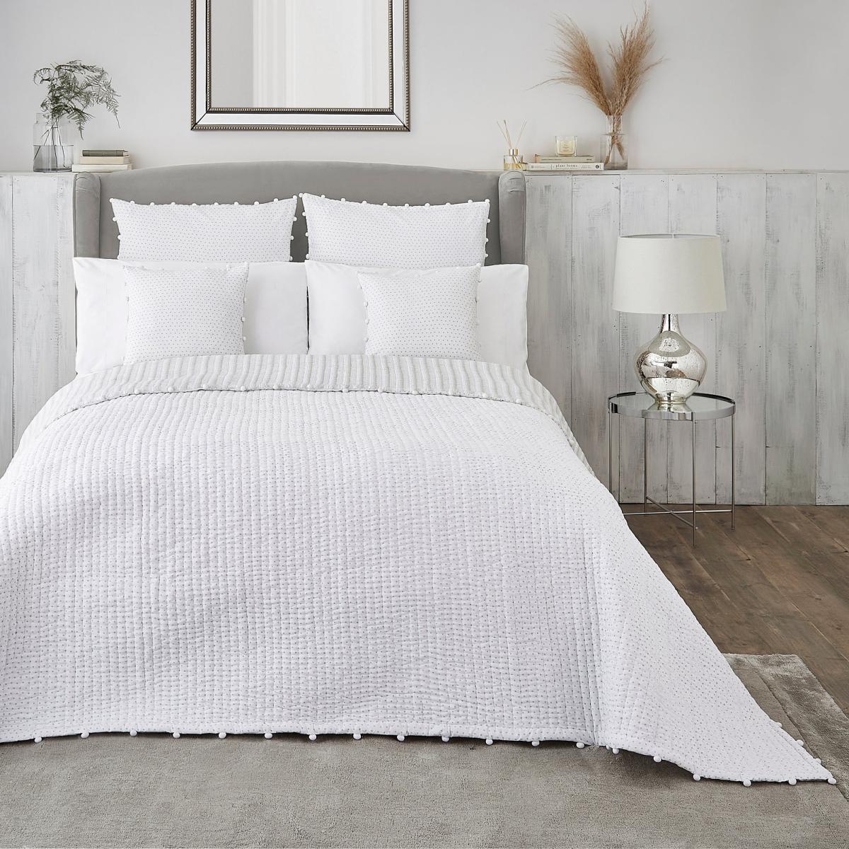 Boasting a dainty spotted design combined with a delicate stripe, this beautiful bedspread features a fully reversible design. Printed on supersoft cotton fabric this bedspread is soft durable and machine washable. This bedspread features hand-stitched quilting and bobble trim styling. This bedspread is the perfect accessory to layer with the Coddington bedding or simple plain sheets. Matching cushions and pillow shams are also available. 235cm x 235cm – Suitable to cover a double and kingsize bed. 265cm x 265cm – Suitable for a super kingsize bed.
