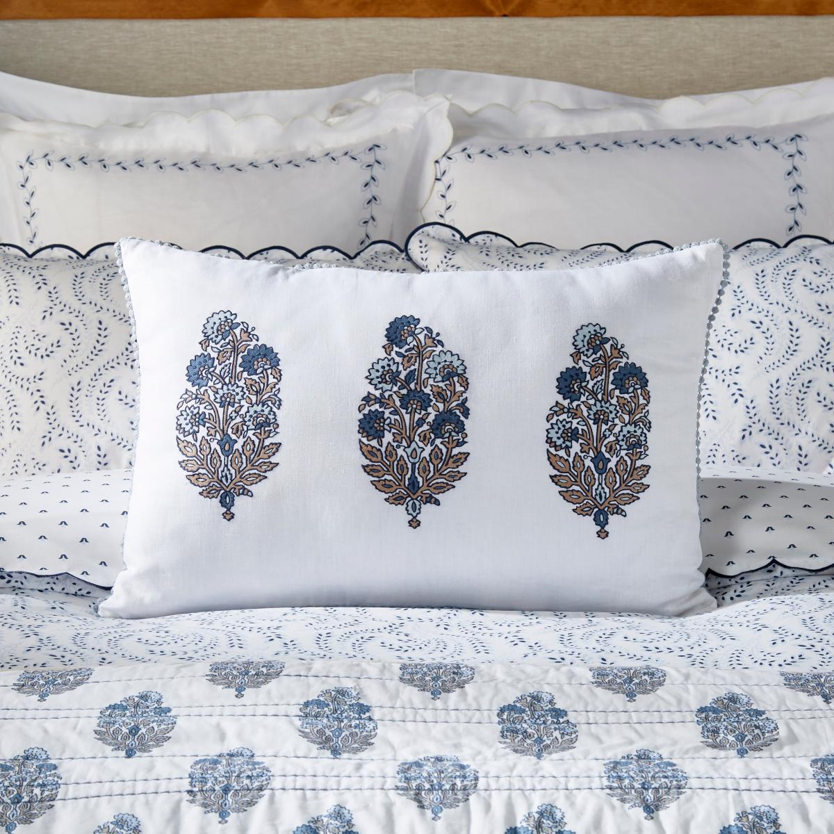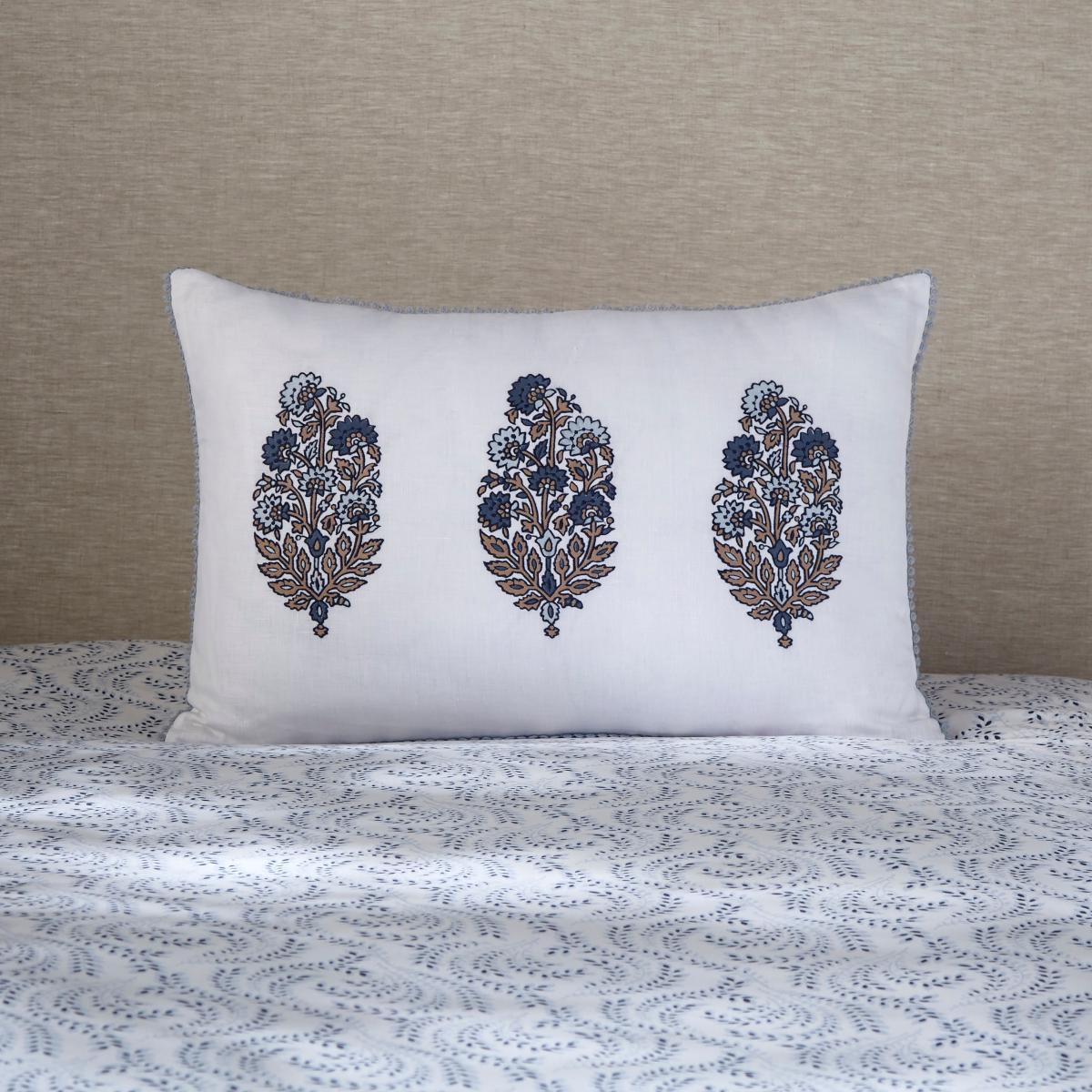 I really like this blue cushion for its versatile colour and classic cotton fabric. It works particularly well in both traditional and contemporary interiors, adding a touch of calm and sophistication. The embroidery detail on the front makes it an elegant choice, perfect for adding a subtle layer of texture to a neutral bed or sofa setup. Practical styling tips would be to mix it with patterned cushions for a layered look or pair it with other shades of blue to create a cohesive colour scheme. Its size and structure make it comfortable for lounging or styling as a decorative accent, making it a smart investment for bringing timeless style into any space.