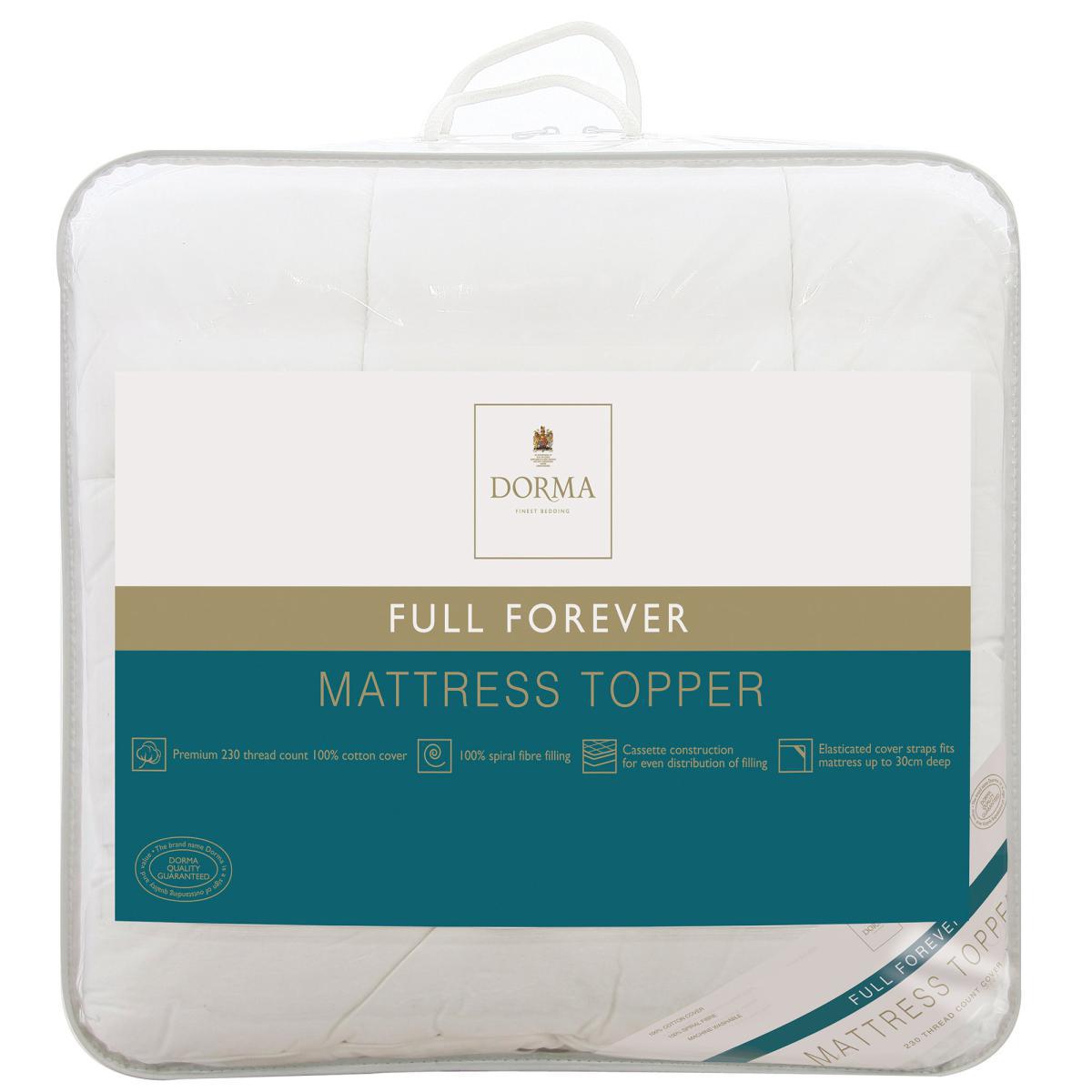 * Premium 230 Thread Count 100% Cotton Cover* Spiral Fibre Filling* Keeps body temperature regulated ensuring your bedding stays dry andcomfortable* 30 cm depth with a 3cm and 6cm thickness* Machine Washable, Tumble dry on a low heat setting Available in a selection of sizes, this luxurious Dorma mattress topper has a crisp 100% cotton cover with a premium 230 thread count and fits mattresses up to 30cm deep. Filled with 100% spiral fibre for a fuller and plush feel with cassette construction for even distribution of the filling, this topper has elasticated cover straps to securely fit over your mattress. The high thread count casing of this product provides a natural barrier against bedbugs.**Dorma**Established in 1921, Dorma is a British heritage brand synonymous with quality, luxury and impeccable attention to detail. Dorma; our name is your guarantee.