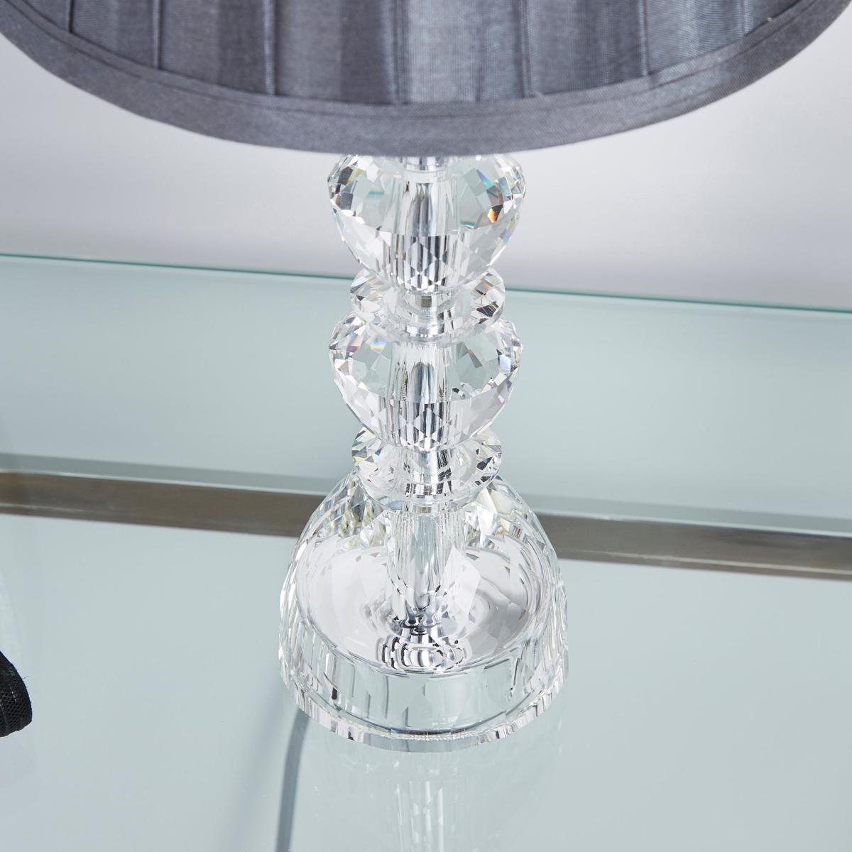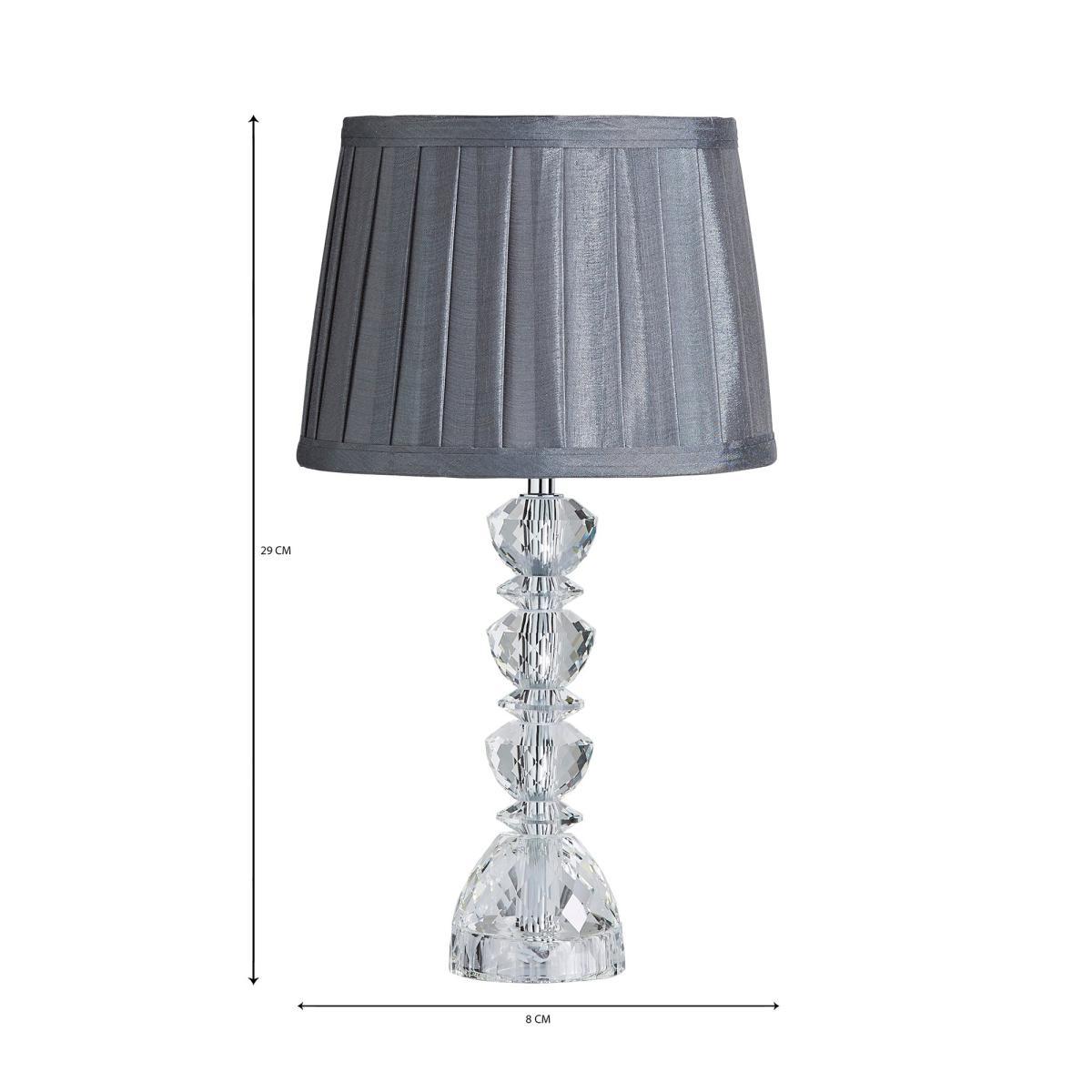 Give your decor a glamorous touch with this stunning Dorma Mini Genevieve table lamp. Exquisitely crafted with a clear, crystal base with a sleek chrome stem, this candlestick table lamp is finished with a grey pleated faux silk shade with a double taped trimmed detailed finish.