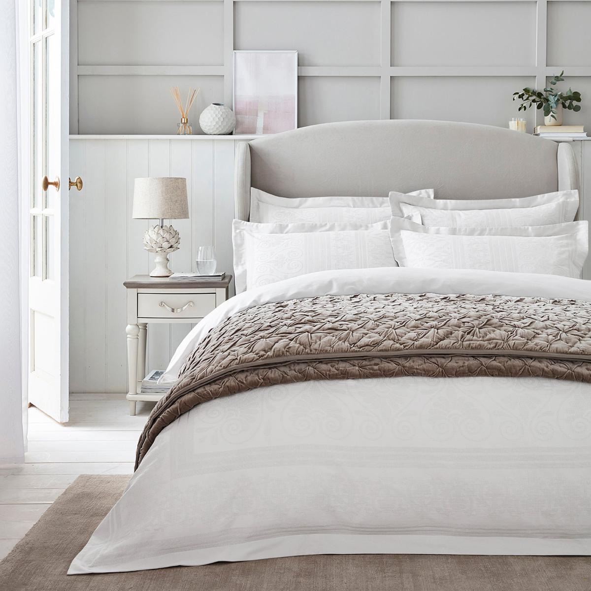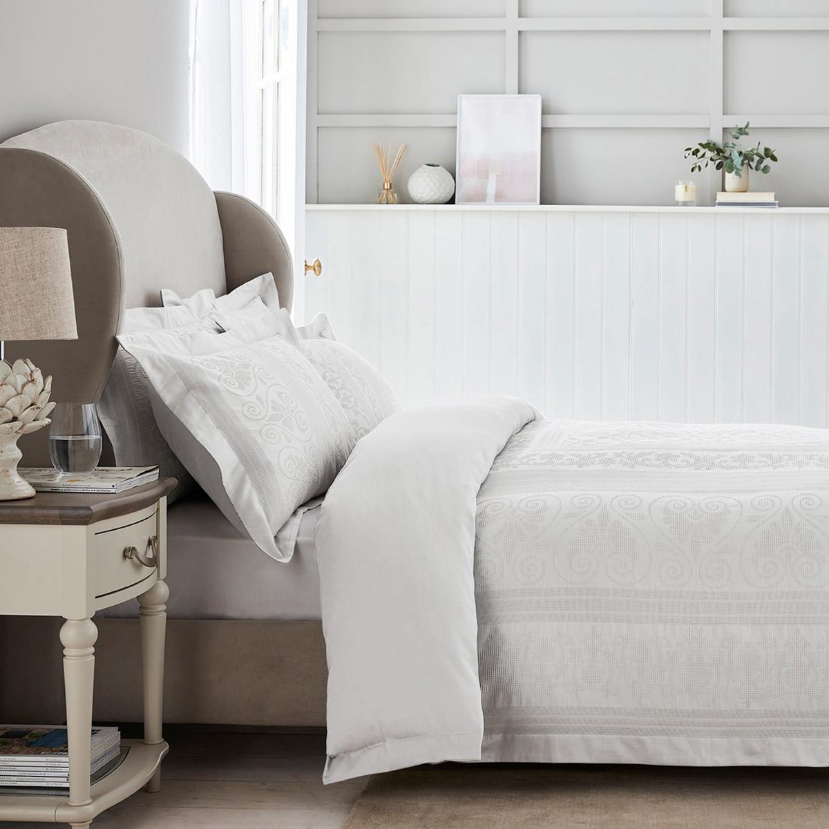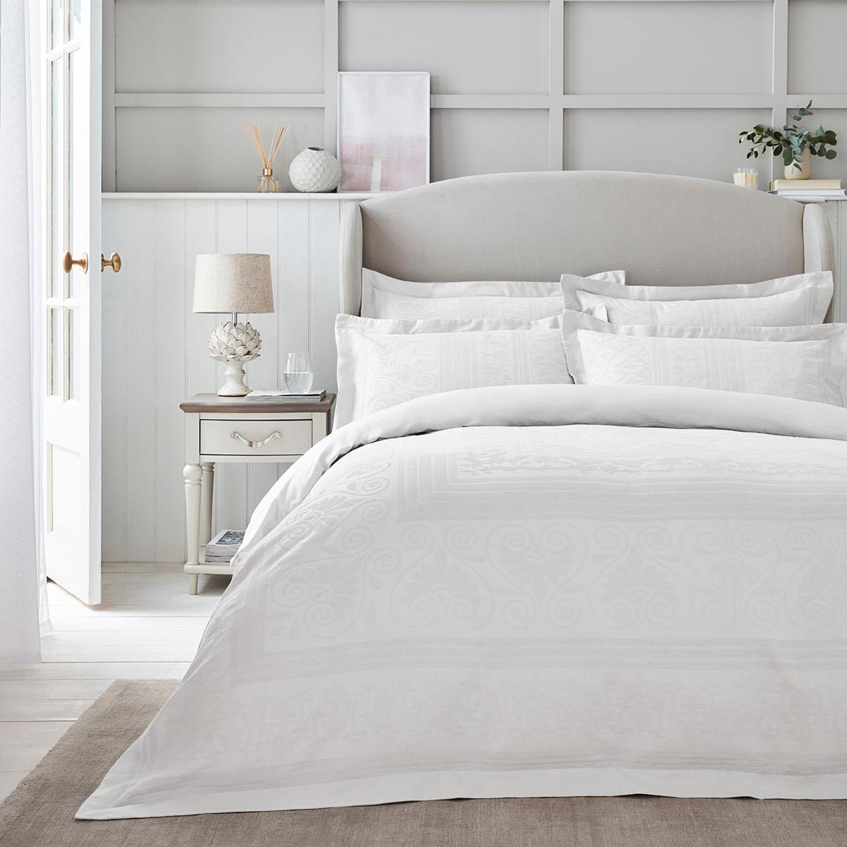 Dorma Paloma is part of Dorma's new Purity lifestyle collection of simple luxury bedding and accessories, with each piece made to Dorma's impeccable quality standards. Natural finishes and a timeless neutral colour palette have been carefully selected throughout the collection to bring a sense of calm and tranquillity to your home. Boasting decorative ornamental patterns that are intricately woven into a 300 thread count panel, this duvet cover is not only stunning but a super soft addition to your bedroom. With a jacquard and waffle texture and a white background, this duvet cover would compliment any bedroom interior beautifully. This duvet cover is fastened with a zip and the set is machine washable making it easy to keep clean and fresh. This bedding comes with the Dorma 10 Year Guarantee. Other matching bedding is available.