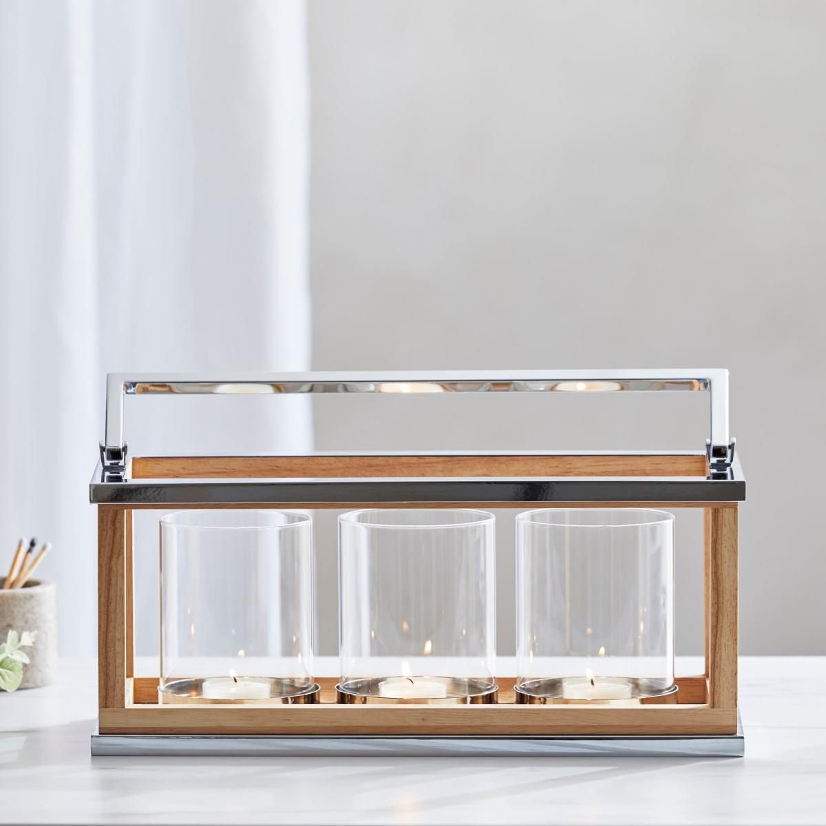 I love this candle holder for its sleek, contemporary look that combines wood with polished chrome - making it versatile enough to suit both modern and minimalist interiors. It works particularly well in living rooms, dining areas, or even on a sideboard where its clean lines and reflective surface can add a touch of sophistication. For styling tips, try grouping it with other metallic accents or natural textures like woven baskets or greenery to create visual interest. It's practical too - the triple hurricane design allows for consistent candlelight without the clutter, and using different scented candles can help define the mood of a space. Overall, it’s a chic, functional piece that can elevate everyday decor.