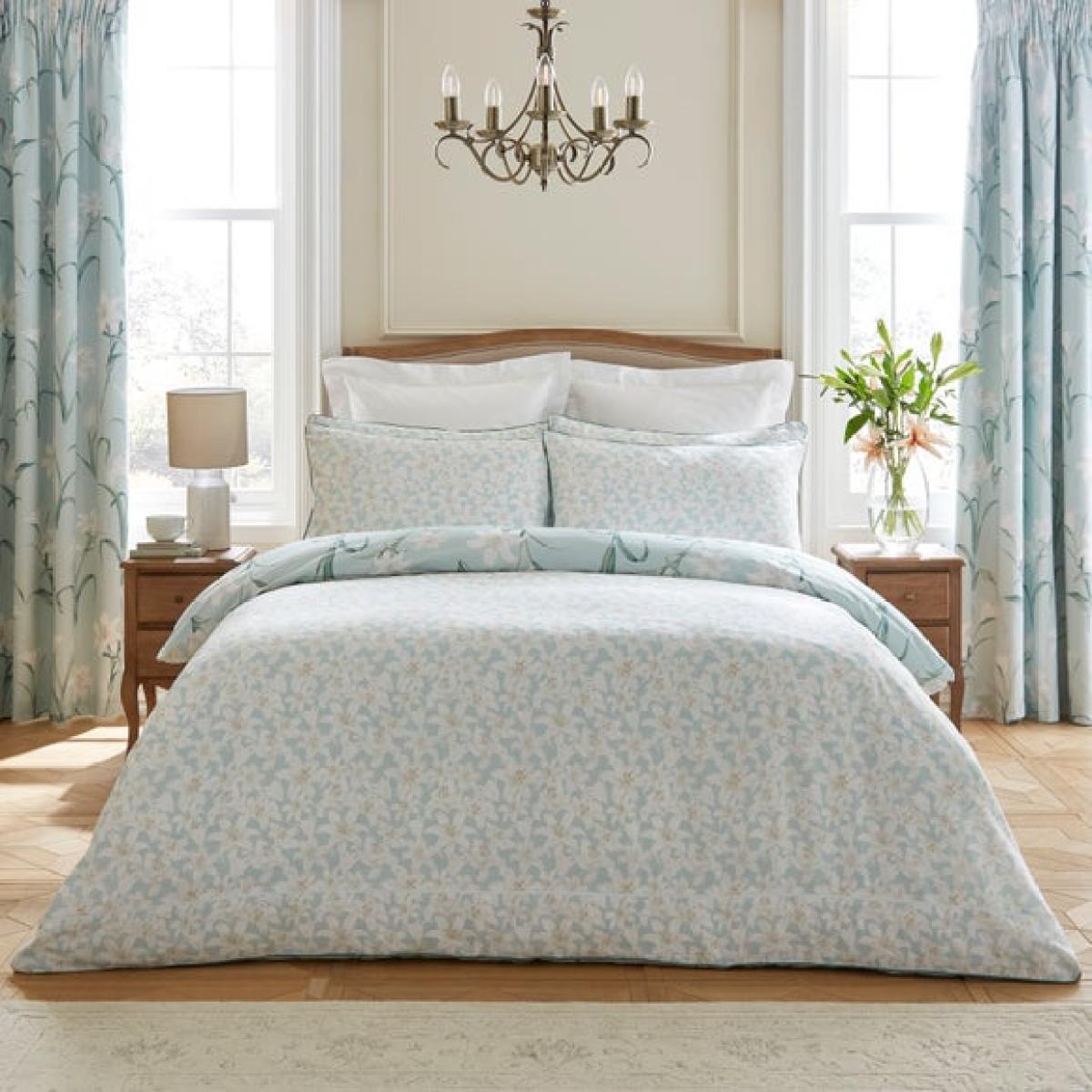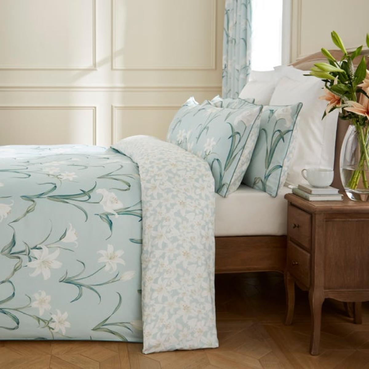 * Crafted from soft and breathable 100% Cotton Sateen * Sophisticated floral design * Machine washable * Coordinating items available Immerse your bedroom in serene elegance with the Dorma Wildmere Duvet Cover and Pillowcase Set. Crafted from silky-soft 100% cotton sateen, this beautifully tranquil design showcases delicate lilies in bloom, set against a refreshing seafoam backdrop. The graceful floral motif is enhanced by a contrast piped edge, adding a refined finish to this sophisticated bedding. Offering exceptional breathability and a lustrous, smooth texture, this set brings an air of peaceful luxury to your sleep sanctuary. Dorma Established in 1921, Dorma is a British heritage brand synonymous with quality, luxury and impeccable attention to detail. Dorma; our name is your guarantee.