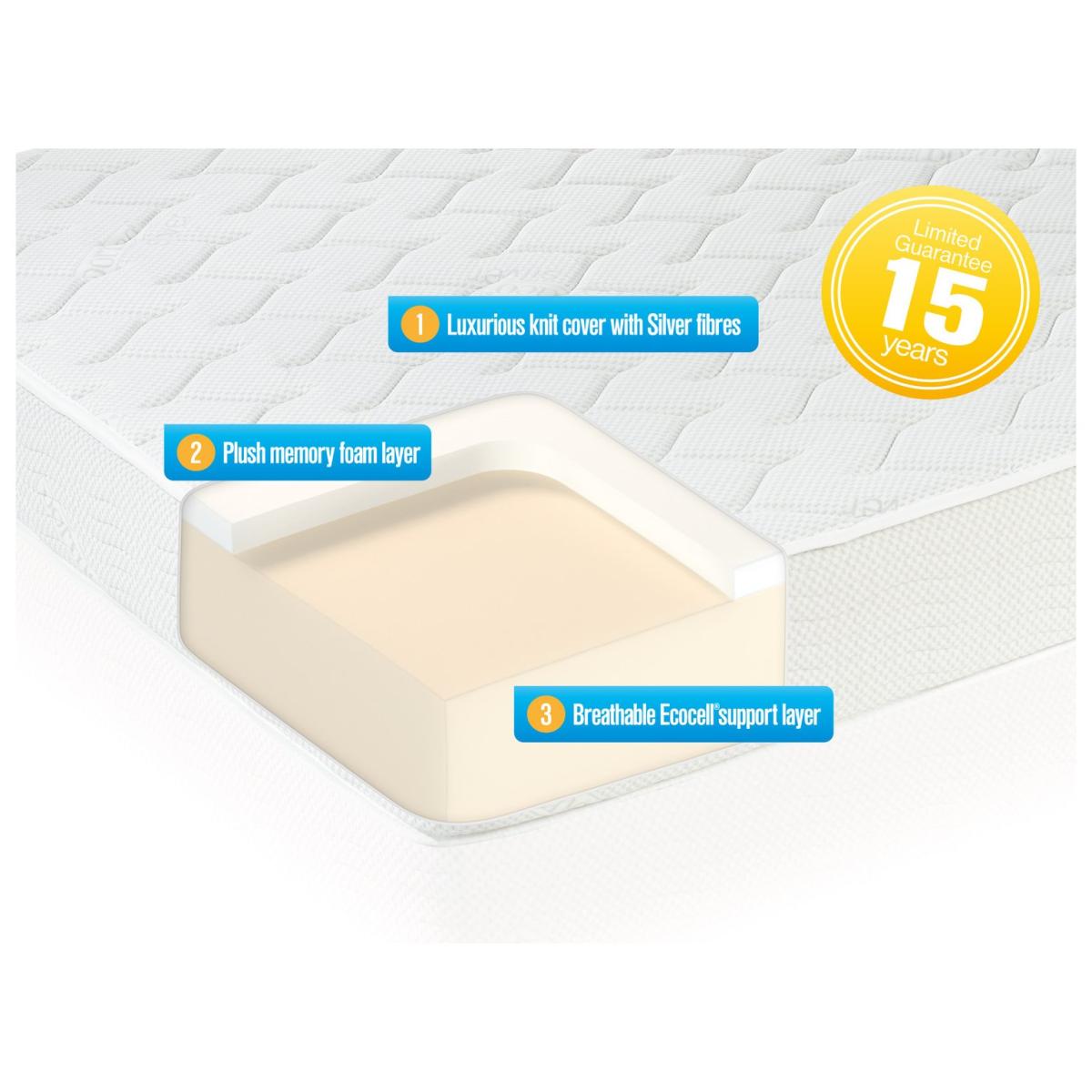 Our Memory Silver Plus mattress combines the natural benefits of Silver, the world's oldest natural antibiotic, with pressure relieving materials. The luxury cover is enriched with Silver fibres, which have natural anti-bacterial and anti-odour properties that help eliminate unpleasant odours caused by moisture absorption in the mattress. It also has the benefit of an anti-static shield to protect the mattress from dust particles that can cause allergies. At Argos Home we want you to get the best night's sleep possible, so we offer a 100 night comfort promise on our mattresses. Try your new mattress for up to 100 nights and if you aren't sleeping soundly, we'll offer you an exchange for one that suits you better. Part of the Dormeo collection. Medium feel. Memory foam mattress. Quilted finish. No roll together. Anti allergy. Mattress size W180, L200, D17cm. No-turn mattress. General information: Manufacturer's 15 year guarantee.