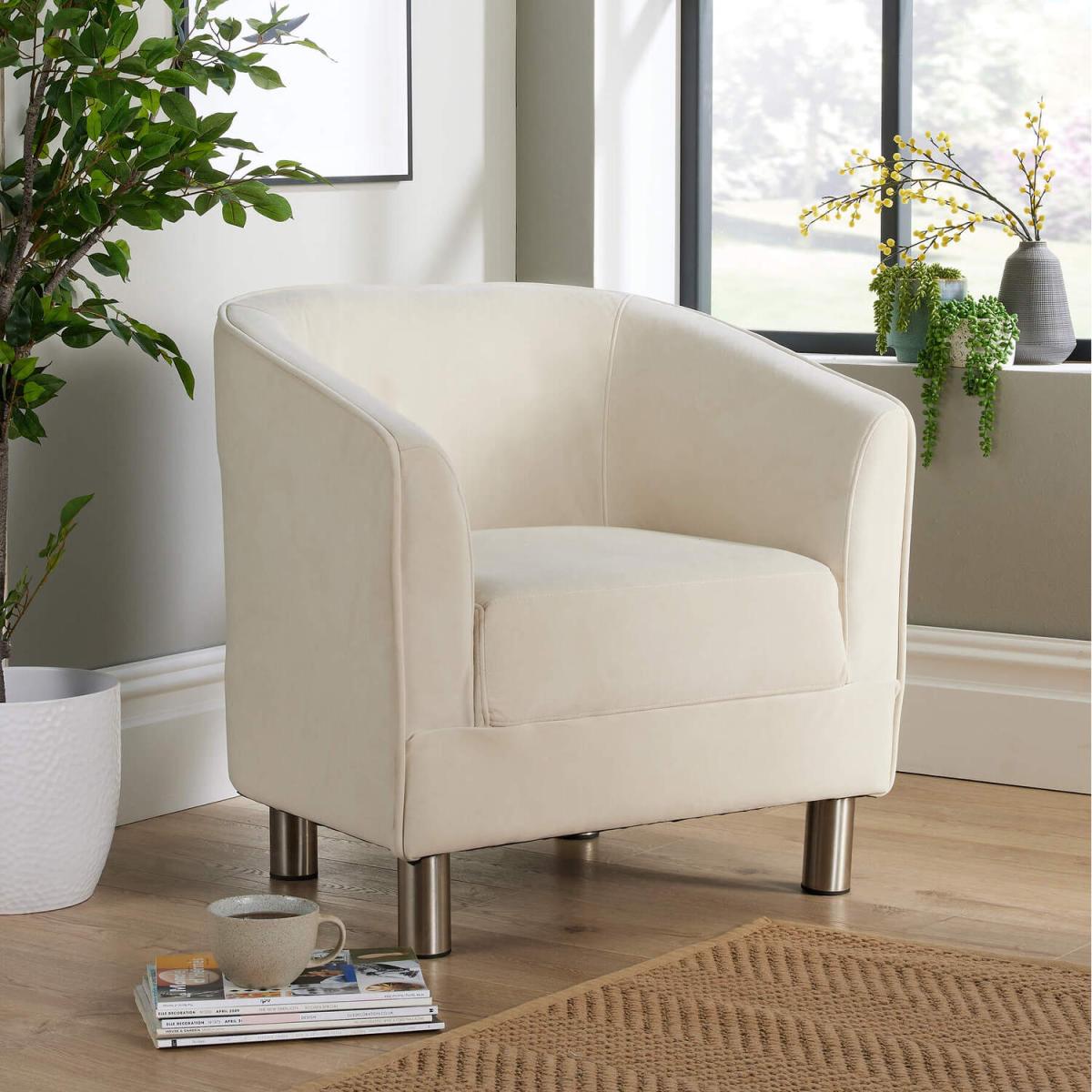 I really like this little tub chair; its cream velvet finish offers a chic, timeless look that works well in both classic and contemporary interiors. It’s a versatile piece perfect for adding a touch of luxury to smaller spaces such as bedrooms or reading nooks. Styling tips include pairing it with textured cushions or layering with a small throw to add depth, while placing it near a statement side table or beside a cosy rug can make it feel inviting. Keep in mind, as a light-coloured fabric, it benefits from regular cleaning to maintain its appearance and can be complemented by surrounding decor in soft neutrals or muted tones for a sophisticated look.