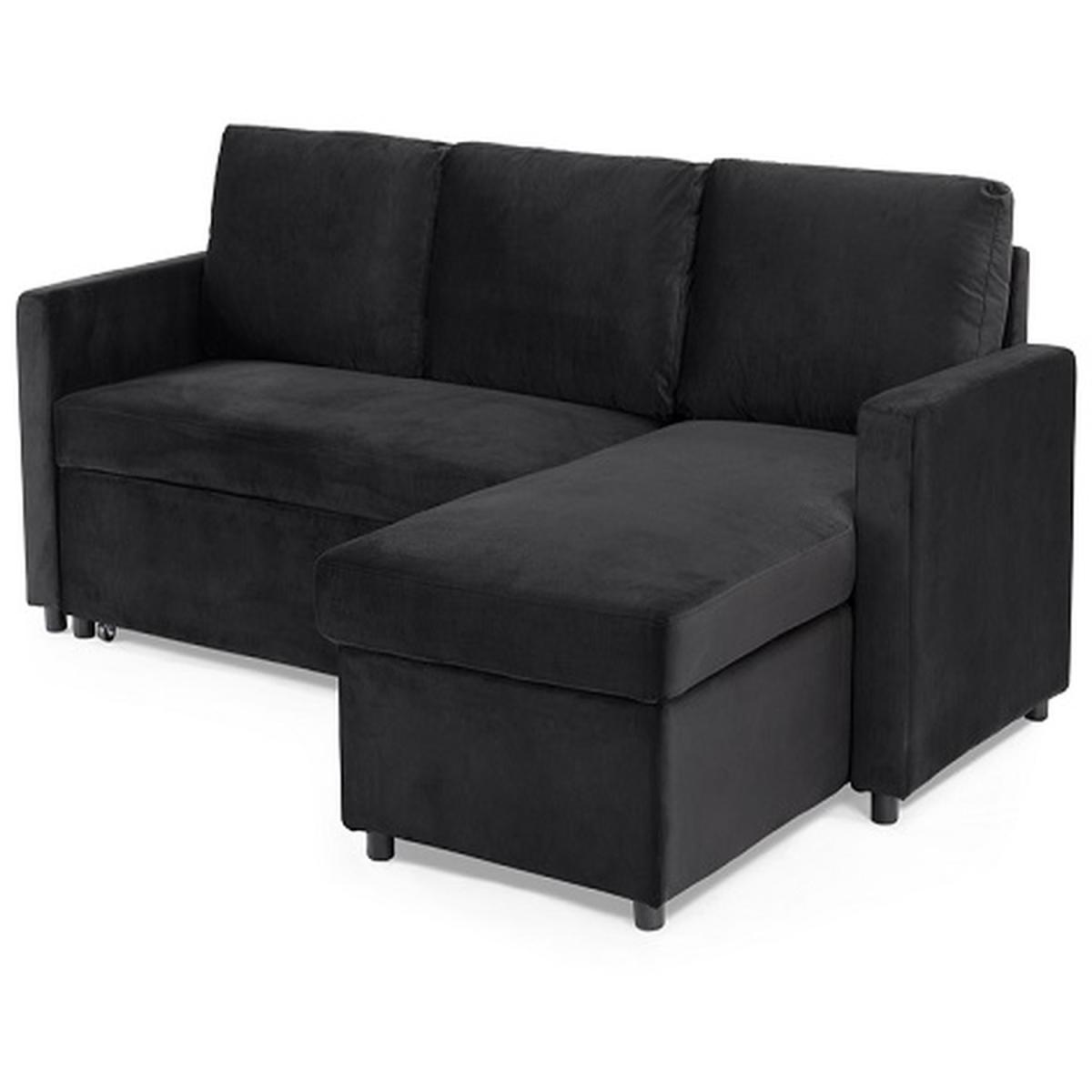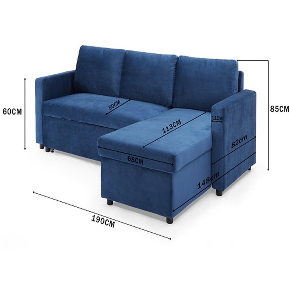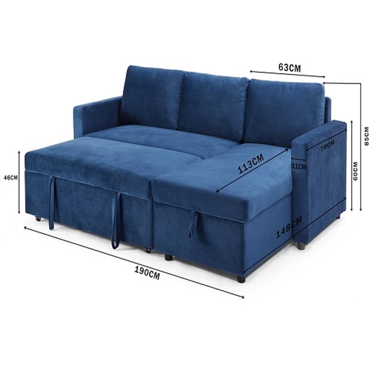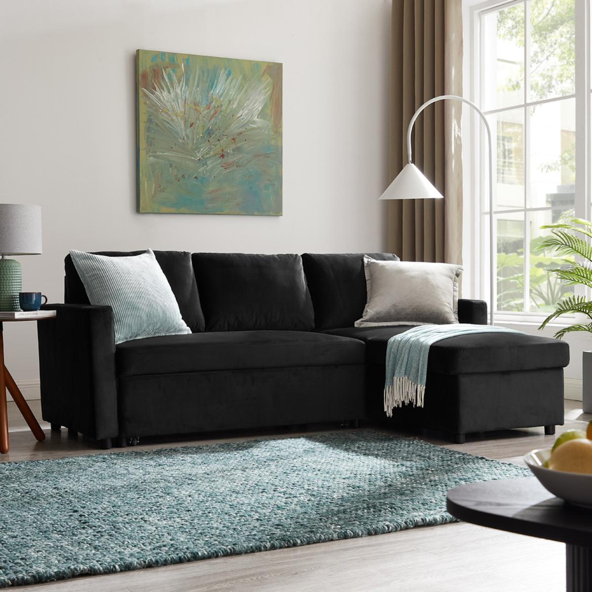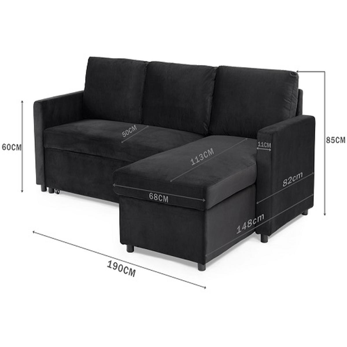 Introducing DORSET, a 3-seater reversible chaise sofa bed, available in Grey Velvet, Blue Velvet and Black Velvet. The DORSET sofa bed feature a reversible chaise section that can be positioned to the left or right hand side depending on your room dimensions and requirements. Lifting the chaise section reveals a hidden storage space, perfect for pillows or bedding. The reversible chaise allows for flexible configuration and the bed section pulls out using the pull straps to provide a full size bed for guests. Due to differences in lighting and screen resolution on laptop, desktop, and mobile devices, some fabrics may appear somewhat different in person. Velvet can have a distinct appearance, in natural light it tends to shimmer more, whereas in artificial lighting indoors, it tends to look more subdued. The colour of velvet may change if you stroke it with your hand in several directions, to maintain consistency, stroke in one direction with an open palm. To get the most out of your fabric or velvet sofa bed, we recommend gently cleaning with the upholstery attachment of your vacuum cleaner or using a sofa hand brush once a week, just make sure to vacuum in the direction of the pile.