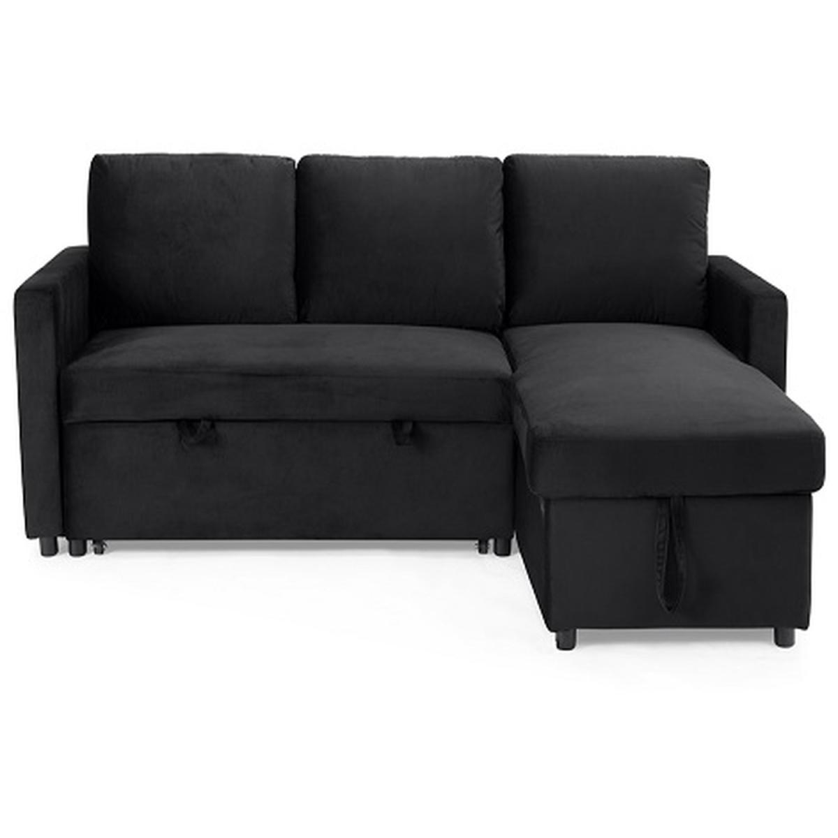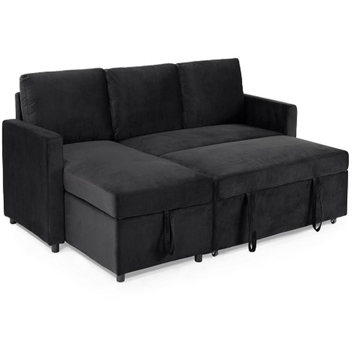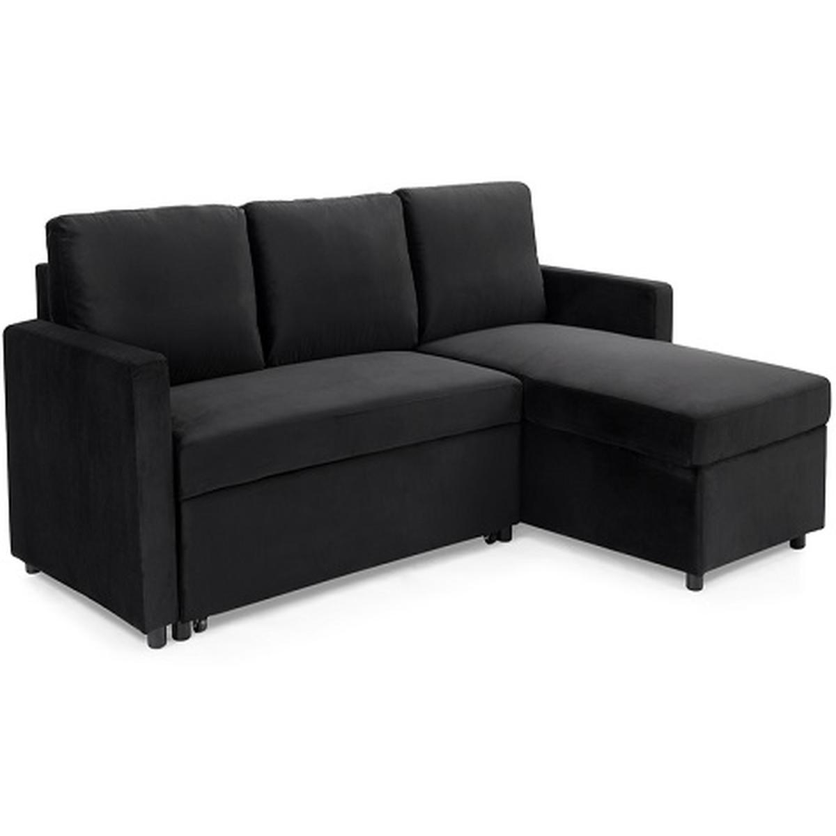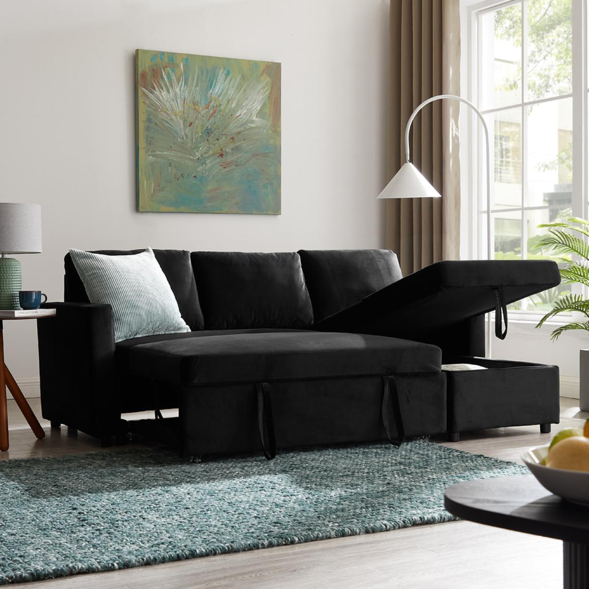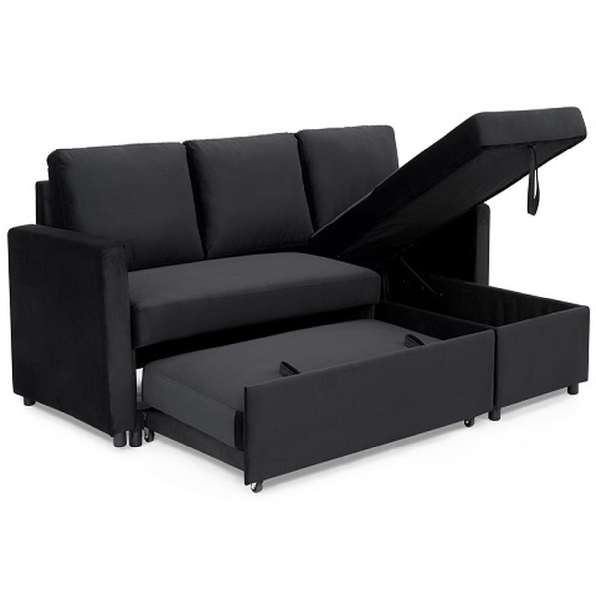 Introducing DORSET, a 3-seater reversible chaise sofa bed, available in Grey Velvet, Blue Velvet and Black Velvet. The DORSET sofa bed feature a reversible chaise section that can be positioned to the left or right hand side depending on your room dimensions and requirements. Lifting the chaise section reveals a hidden storage space, perfect for pillows or bedding. The reversible chaise allows for flexible configuration and the bed section pulls out using the pull straps to provide a full size bed for guests. Due to differences in lighting and screen resolution on laptop, desktop, and mobile devices, some fabrics may appear somewhat different in person. Velvet can have a distinct appearance, in natural light it tends to shimmer more, whereas in artificial lighting indoors, it tends to look more subdued. The colour of velvet may change if you stroke it with your hand in several directions, to maintain consistency, stroke in one direction with an open palm. To get the most out of your fabric or velvet sofa bed, we recommend gently cleaning with the upholstery attachment of your vacuum cleaner or using a sofa hand brush once a week, just make sure to vacuum in the direction of the pile.