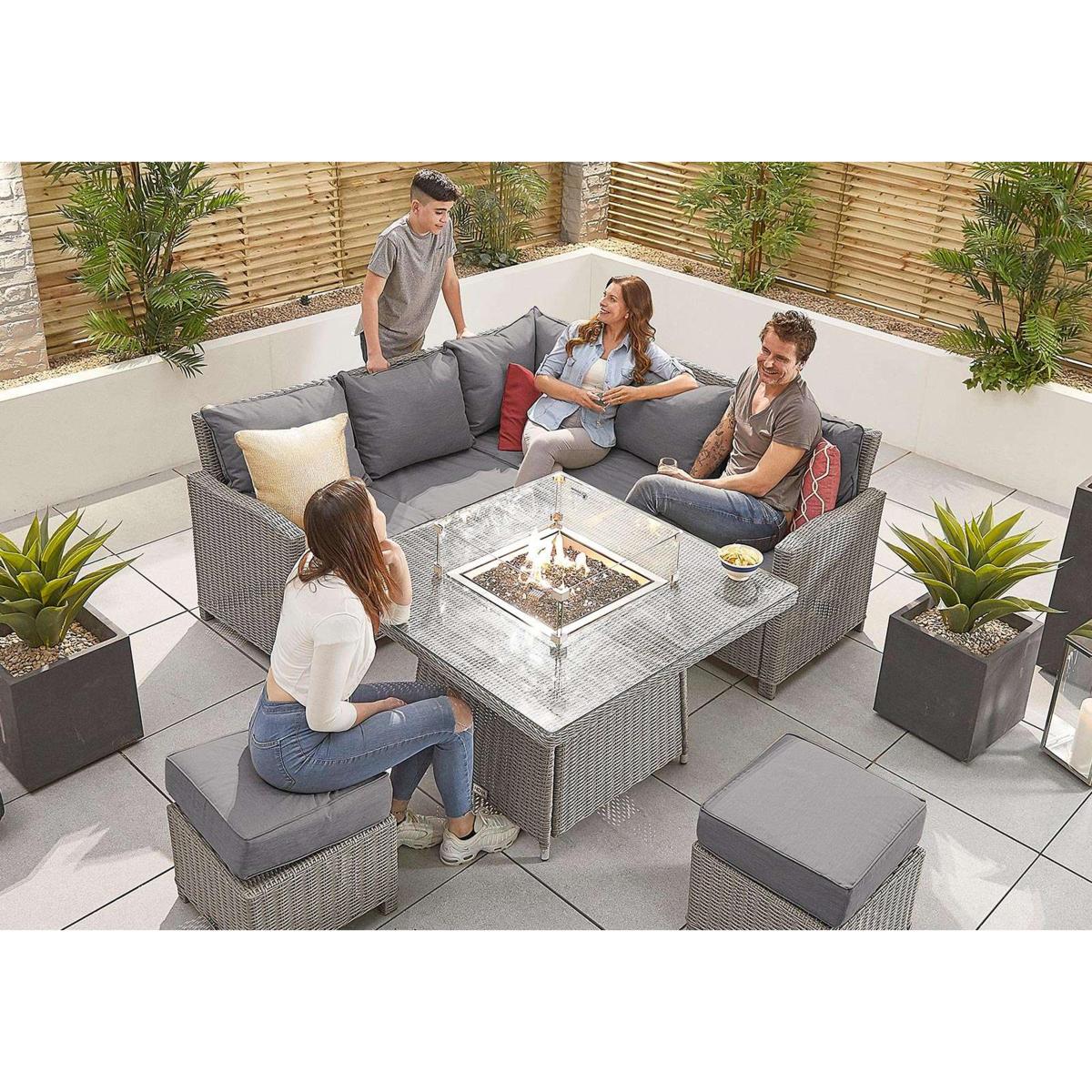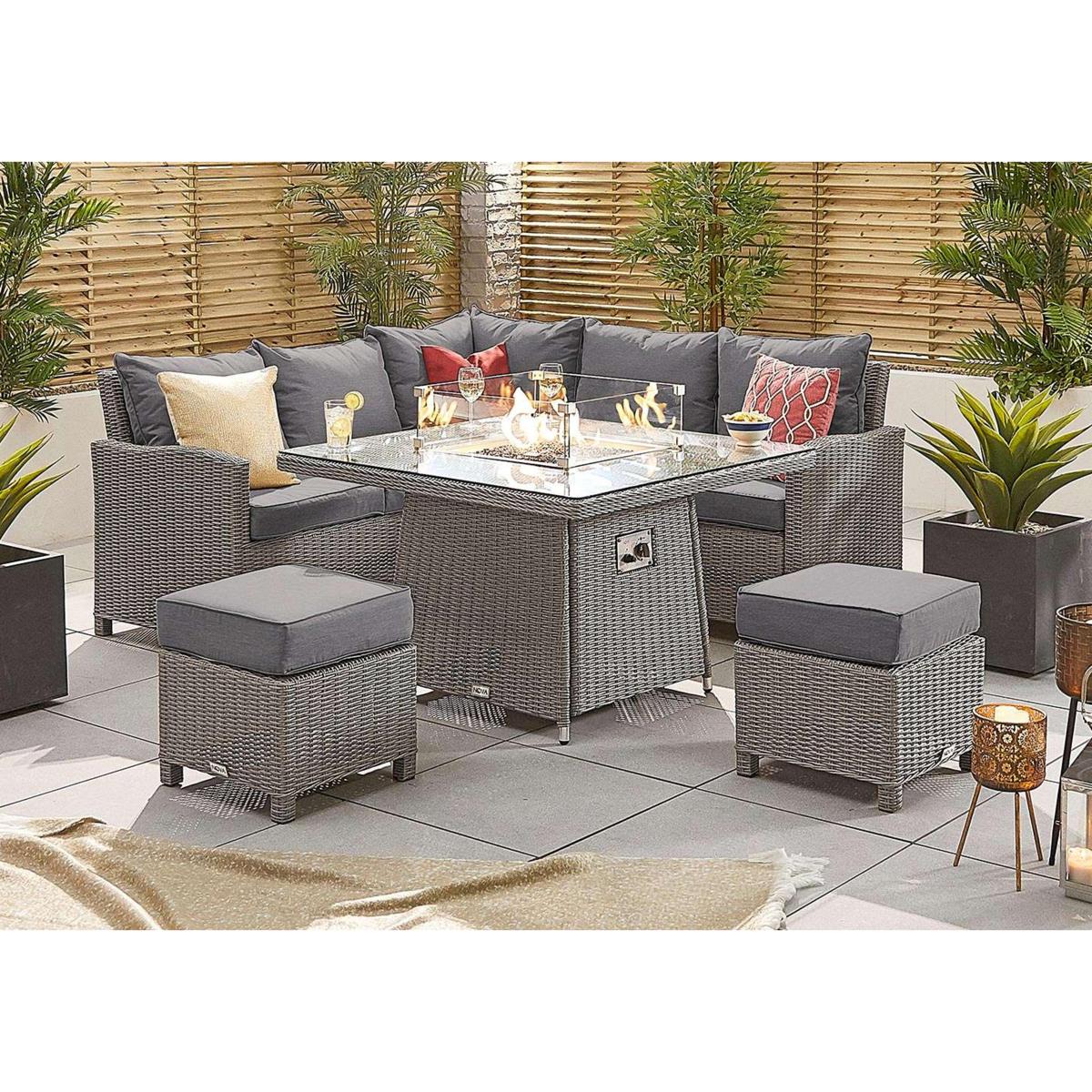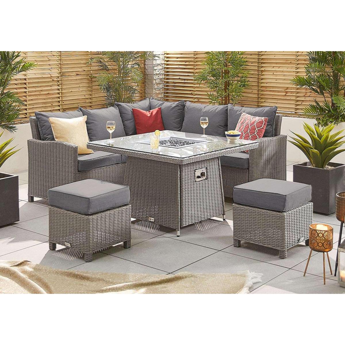 Dine outside in compact comfort, around a stunning fire pit table with heat and light but no mess and smoke. Modern style in beautiful, 100% weather-proof whitewashed PE rattan. Why you’ll love it. Bring light and warmth to your outdoor dining. Incredibly durable, all-weather half-moon PE rattan. Attractive whitewashed finish. Compact size suits smaller patios. Corner sofa, two stools and glass topped dining table. Dining table has an inbuilt fire-pit with wind-guard. Beautiful glass filled fire-pit gives heat and light in the evenings. Easy to maintain and clean. Light yet strong aluminium frames. Comfy, shower-proof cushions. 5-year manufacturer’s warranty. What you need to know. Powder-coated aluminium frames are rust and weather-proof. 100% PE rattan is very hard wearing. UV stabilised and fade-proof, it can withstand weather, strong sunlight and temperature changes. Unlike cheaper alternatives, it will not crack or fade. Half-moon PE rattan is slightly heavier weight than flatter weave PE rattan, this adds to the durability. Compact corner sofa seats 5. The two cushioned benches seat more guests. The square dining table is topped with strong 5mm tempered safety glass. The gas-powered fire-pit has a wind-guard and is filled with attractive crushed glass. It has an easy to use control panel. A standard green 5kg patio propane gas canister will fit inside the table. Please buy separately. The fire-pit system is CE Certified and manufactured using grade 304 stainless steel ensuring it is weather-proof. Cover the fire-pit with metal lid provided to convert to a normal dining table. Can be left outside all year long, excluding the cushions. Cushions are shower-proof. Store when not in use, and in bad weather. Foam with fibre cushion fillings. Zipped cushion covers can be machine washed up to 30 °C. Clean with water and a soft cloth. Avoid abrasive cloths or chemical cleaners. If your furniture is exposed to the salt of coastal winds we advise regular wiping down and covering of the furniture in winter and in stormy weather. Additional scatters shown not included.