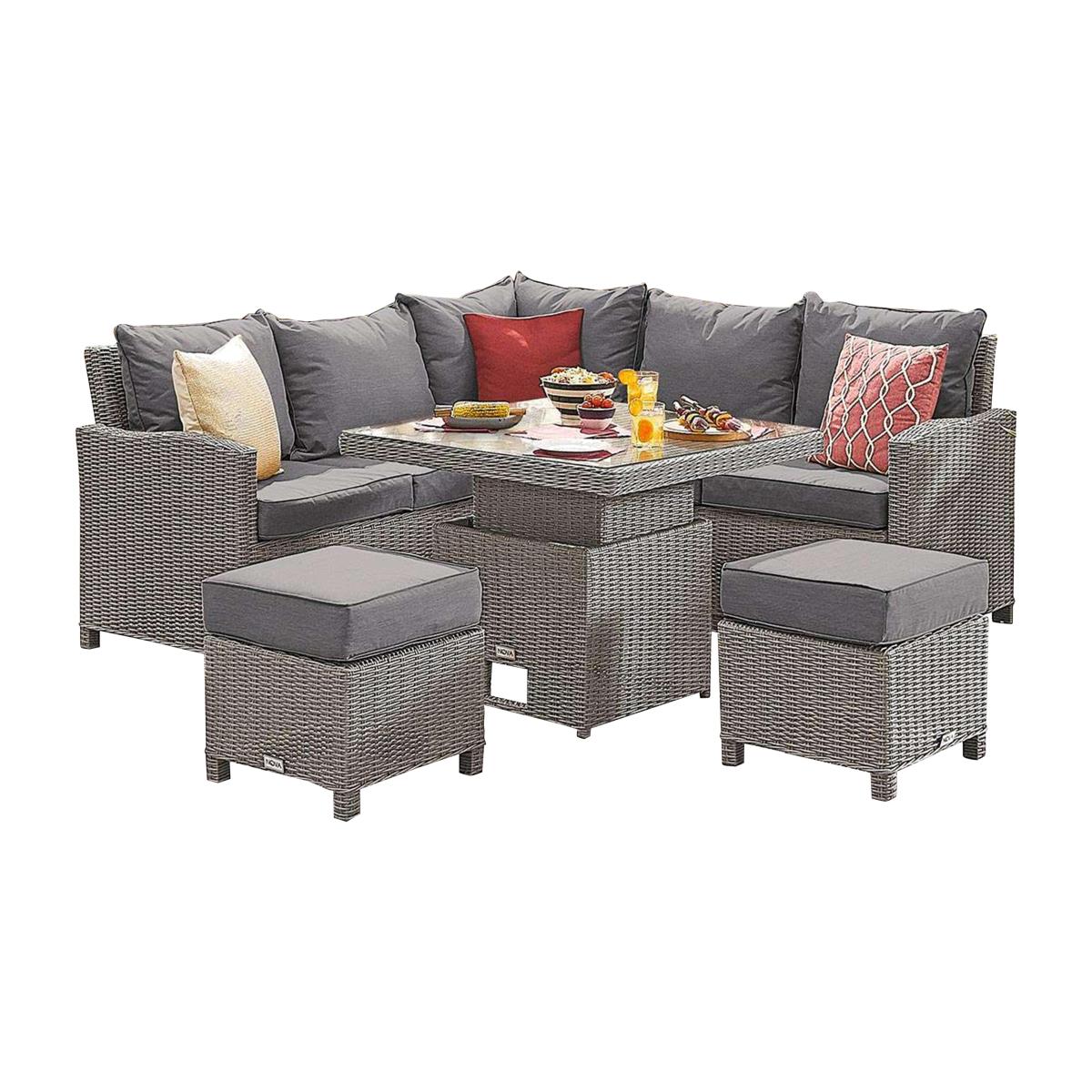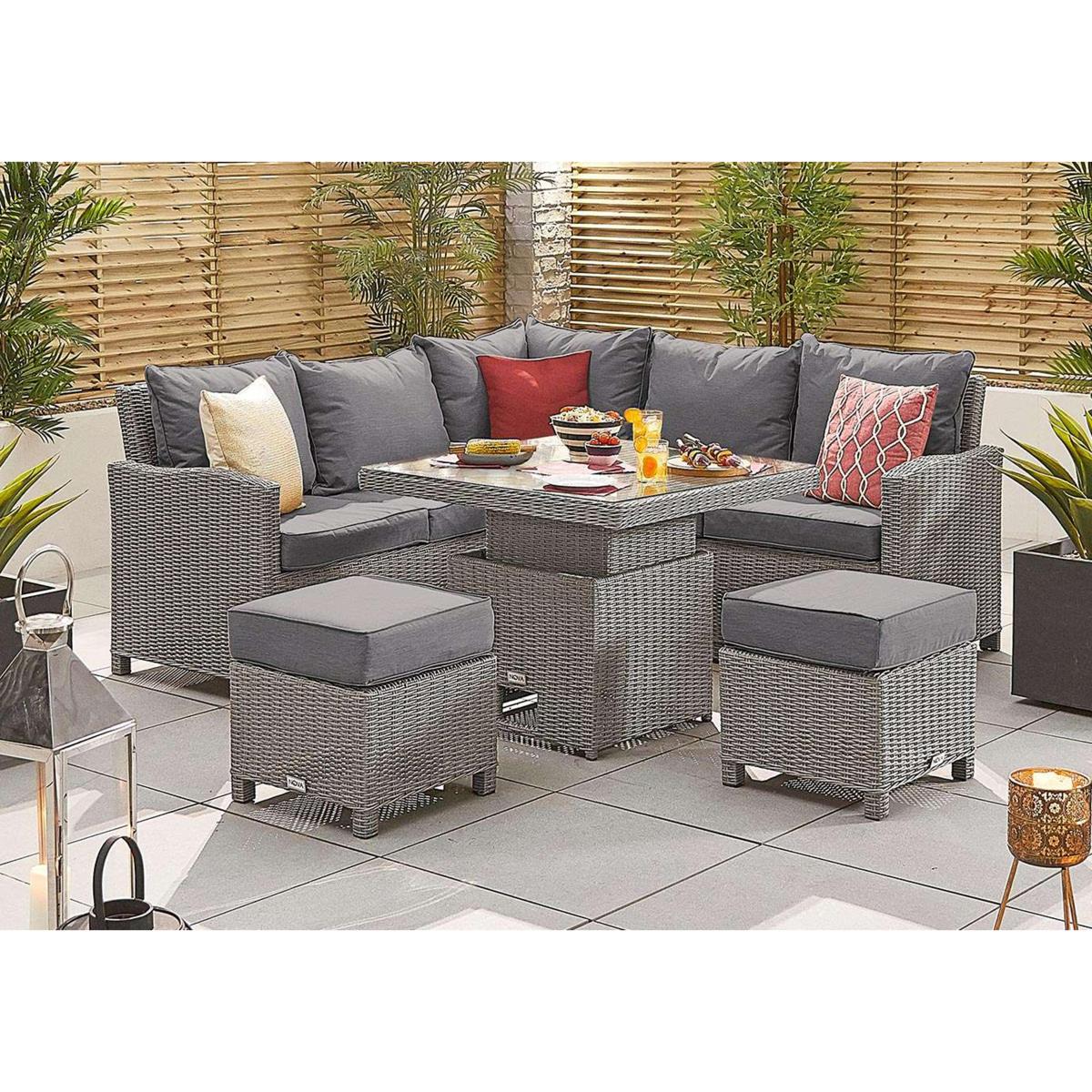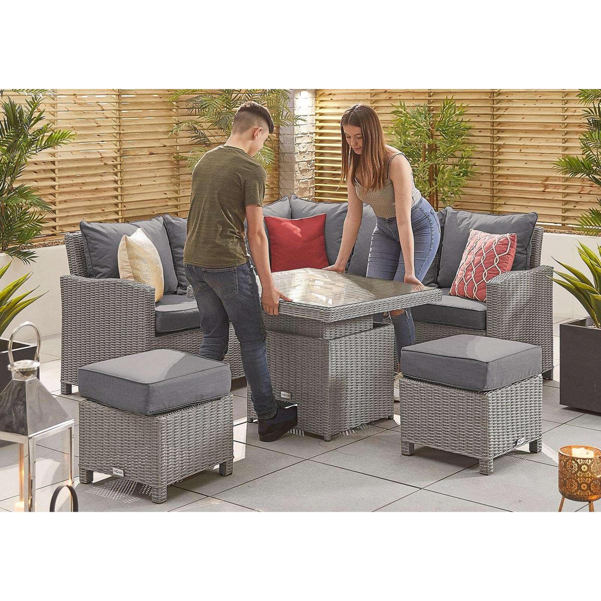 Compact in size, big on style, this lounge set with rising table is perfect for relaxed drinks and, with table raised, is ideal for eating al fresco too. In all-weather whitewashed PE rattan. Why you’ll love it. Raise the table to dine, lower it to lounge. Incredibly durable, all-weather half-moon PE rattan. Attractive whitewashed finish. Compact size suits smaller patios. Relaxed modern style with gently curved arms. Corner sofa, two stools, glass-topped rising table. Switch from dining table to coffee table and vice versa with ease. Easy to maintain and clean. Light yet strong aluminium frames. Comfy, shower-proof cushions. 5-year manufacturer’s warranty. What you need to know. Powder-coated aluminium frames are rust and weather-proof. 100% PE rattan is very hard wearing. UV stabilised and fade-proof, it can withstand weather, strong sunlight and temperature changes. Unlike cheaper alternatives, it will not crack or fade. Half-moon PE rattan is slightly heavier weight than flatter weave PE rattan, this adds to the durability. Compact corner sofa seats 5. The two cushioned stools can be used for extra guests. The square table is topped with strong 5mm tempered safety glass. Can be left outside all year long, excluding the cushions. Cushions are shower-proof. Store when not in use, and in bad weather. Foam with fibre cushion fillings. Zipped cushion covers can be machine washed up to 30 °C. Clean with water and a soft cloth. Avoid abrasive cloths or chemical cleaners. If your furniture is exposed to the salt of coastal winds we advise regular wiping down and covering of the furniture in winter and in stormy weather. Additional scatters shown not included.