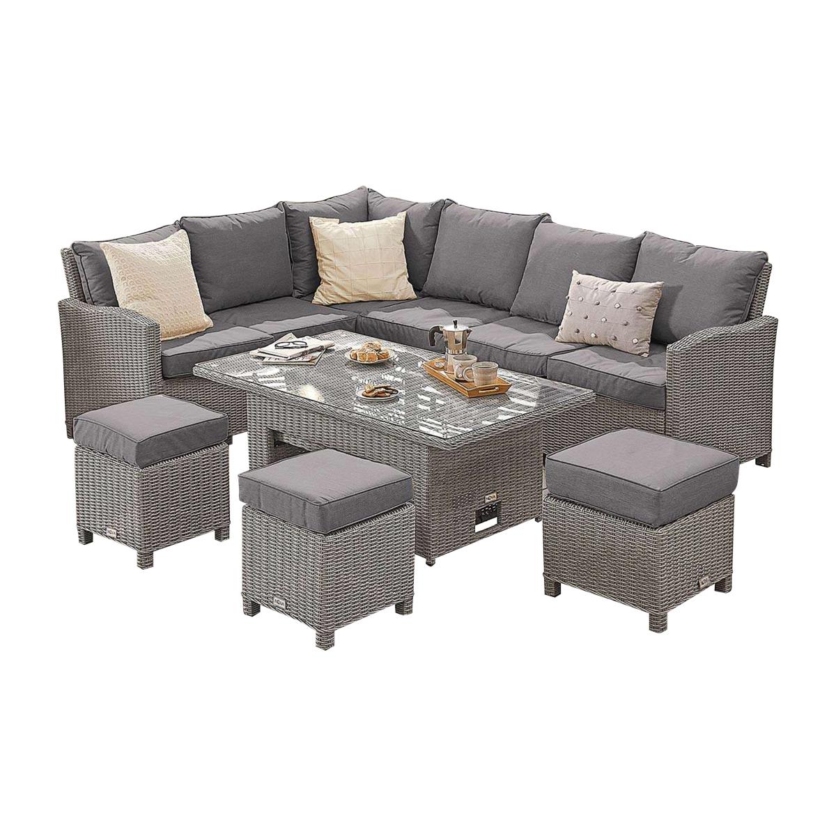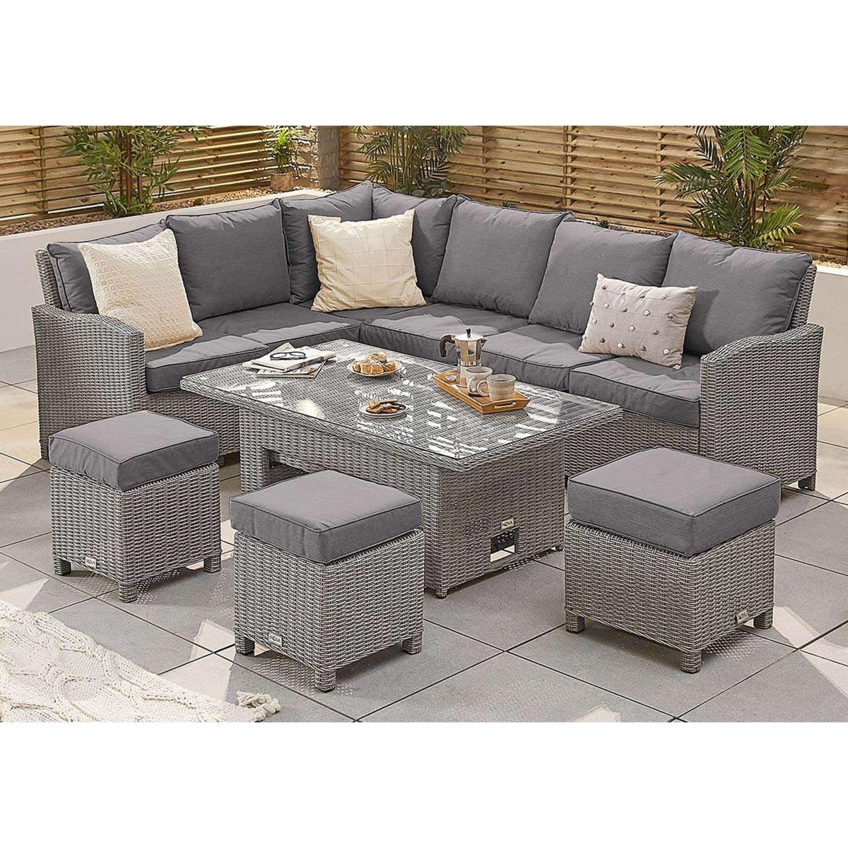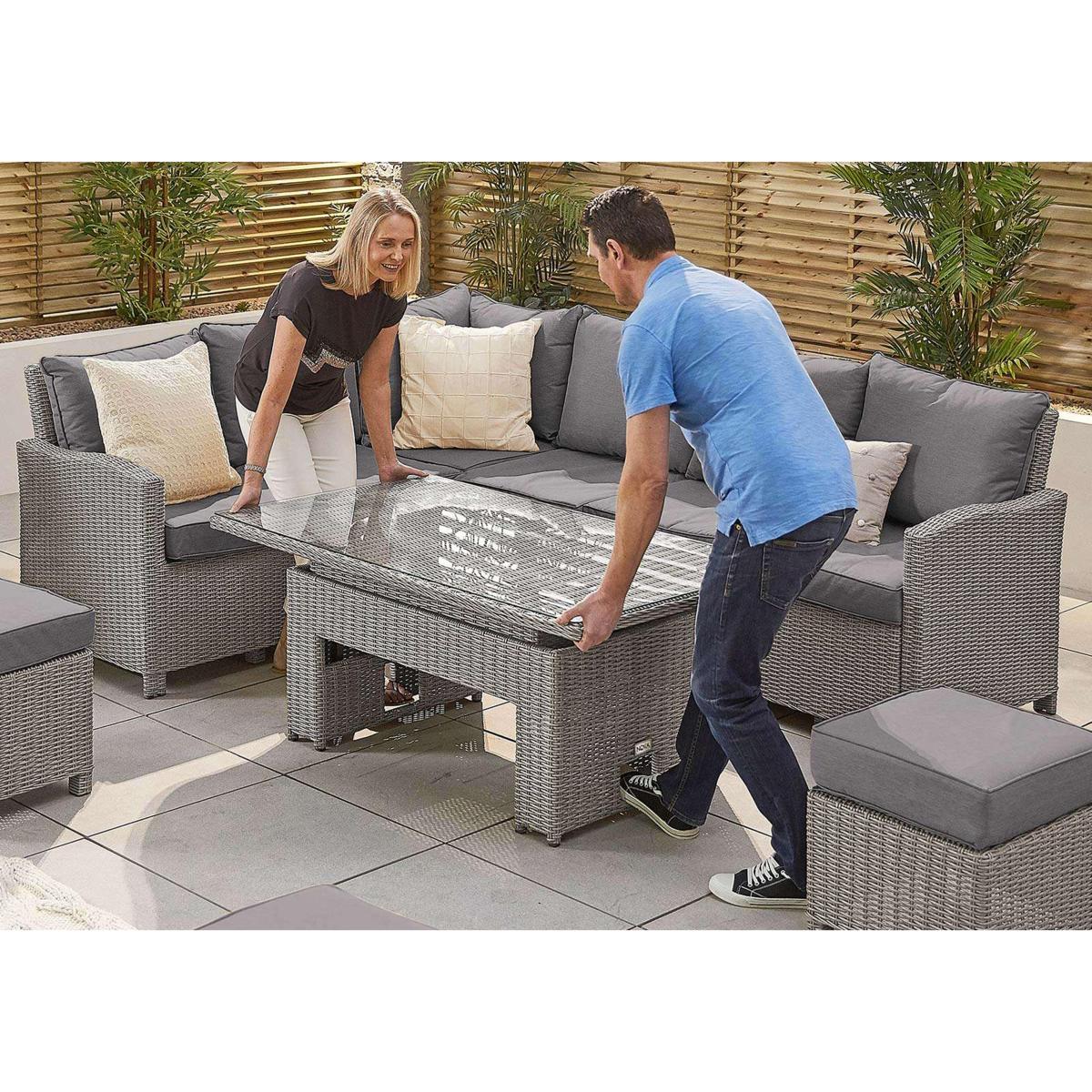 Have the table low for relaxed drinks, then raise it up for dining al fresco. This versatile corner lounge set in all-weather whitewashed PE rattan comes with a 5-year warranty. Why you’ll love it. Raise the table to dine, lower it to lounge. Incredibly durable, all-weather half-moon PE rattan. Attractive whitewashed finish. Gently curved arms. Comfy, shower-proof grey cushions. Corner sofa, three stools, glass-topped rising table. Switch from dining table to coffee table and vice versa with ease. Easy to maintain and clean. Light yet strong aluminium frames. Comfy, shower-proof cushions. 5-year manufacturer’s warranty. What you need to know. Powder-coated aluminium frames are rust and weather-proof. 100% PE rattan is very hard wearing. UV stabilised and fade-proof, it can withstand weather, strong sunlight and temperature changes. Unlike cheaper alternatives, it will not crack or fade. Half-moon PE rattan is slightly heavier weight than flatter weave PE rattan, this adds to the durability. Corner sofa seats 6 The three cushioned stools can be used for extra guests. The rectangular table is topped with strong 5mm tempered safety glass. Can be left outside all year long, excluding the cushions. Cushions are shower-proof. Store when not in use, and in bad weather. Foam with fibre cushion fillings. Zipped cushion covers can be machine washed up to 30 °C. Clean with water and a soft cloth. Avoid abrasive cloths or chemical cleaners. If your furniture is exposed to the salt of coastal winds, we advise regular wiping down and covering of the furniture in winter and in stormy weather. Additional scatters shown not included.