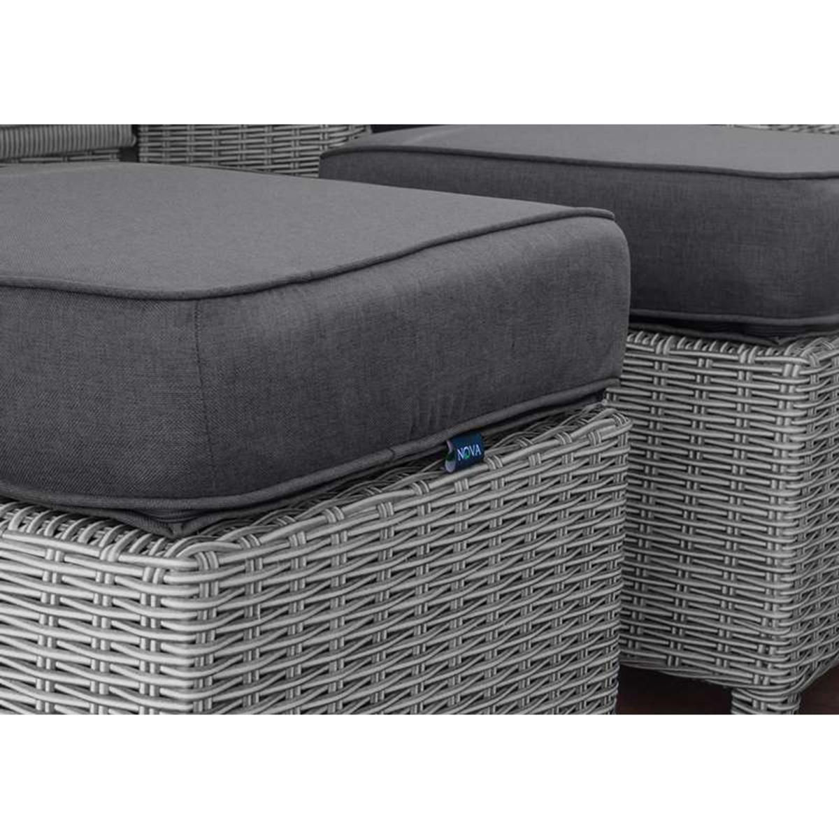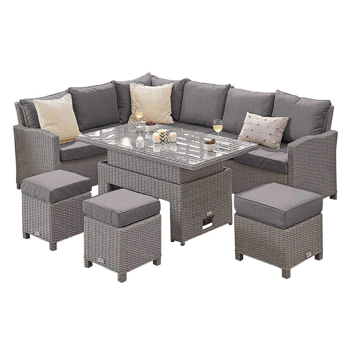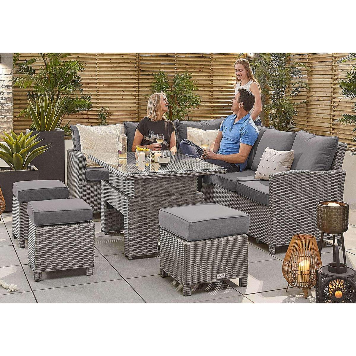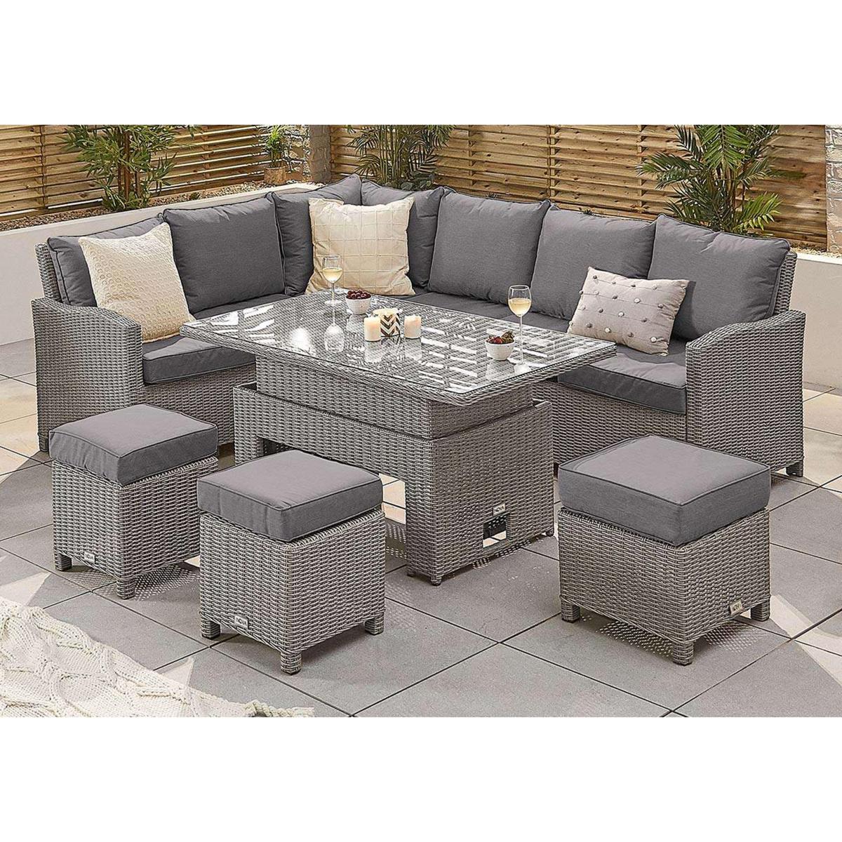 Have the table low for relaxed drinks, then raise it up for dining al fresco. This versatile corner lounge set in all-weather whitewashed PE rattan comes with a 5-year warranty. Why you’ll love it. Raise the table to dine, lower it to lounge. Incredibly durable, all-weather half-moon PE rattan. Attractive whitewashed finish. Gently curved arms. Comfy, shower-proof grey cushions. Corner sofa, three stools, glass-topped rising table. Switch from dining table to coffee table and vice versa with ease. Easy to maintain and clean. Light yet strong aluminium frames. Comfy, shower-proof cushions. 5-year manufacturer’s warranty. What you need to know. Powder-coated aluminium frames are rust and weather-proof. 100% PE rattan is very hard wearing. UV stabilised and fade-proof, it can withstand weather, strong sunlight and temperature changes. Unlike cheaper alternatives, it will not crack or fade. Half-moon PE rattan is slightly heavier weight than flatter weave PE rattan, this adds to the durability. Corner sofa seats 6 The three cushioned stools can be used for extra guests. The rectangular table is topped with strong 5mm tempered safety glass. Can be left outside all year long, excluding the cushions. Cushions are shower-proof. Store when not in use, and in bad weather. Foam with fibre cushion fillings. Zipped cushion covers can be machine washed up to 30 °C. Clean with water and a soft cloth. Avoid abrasive cloths or chemical cleaners. If your furniture is exposed to the salt of coastal winds, we advise regular wiping down and covering of the furniture in winter and in stormy weather. Additional scatters shown not included.