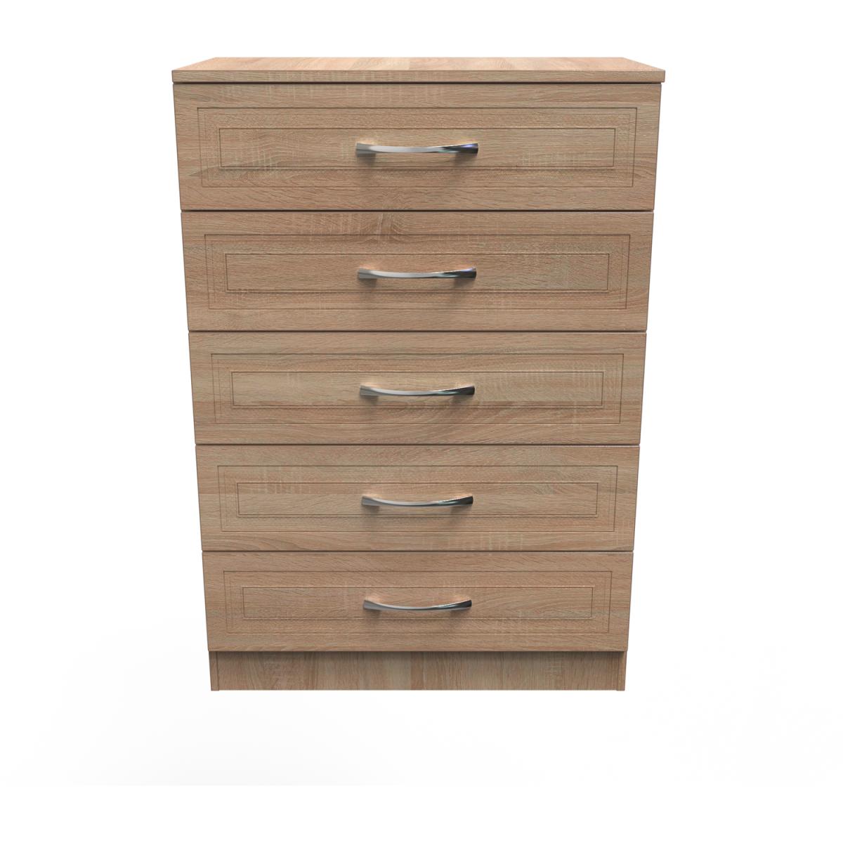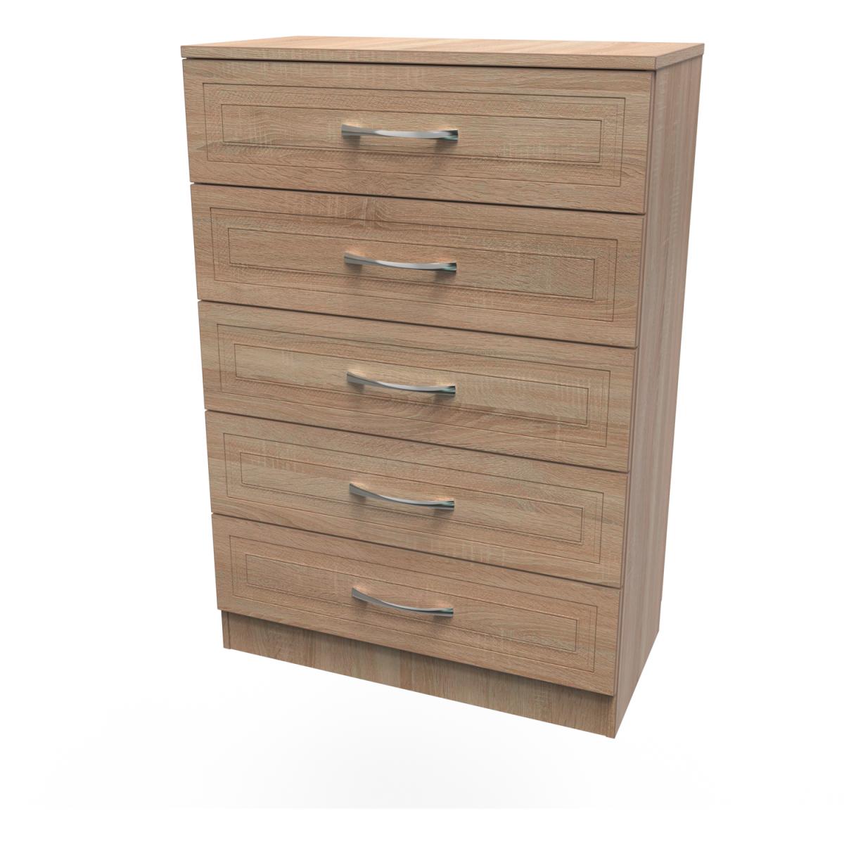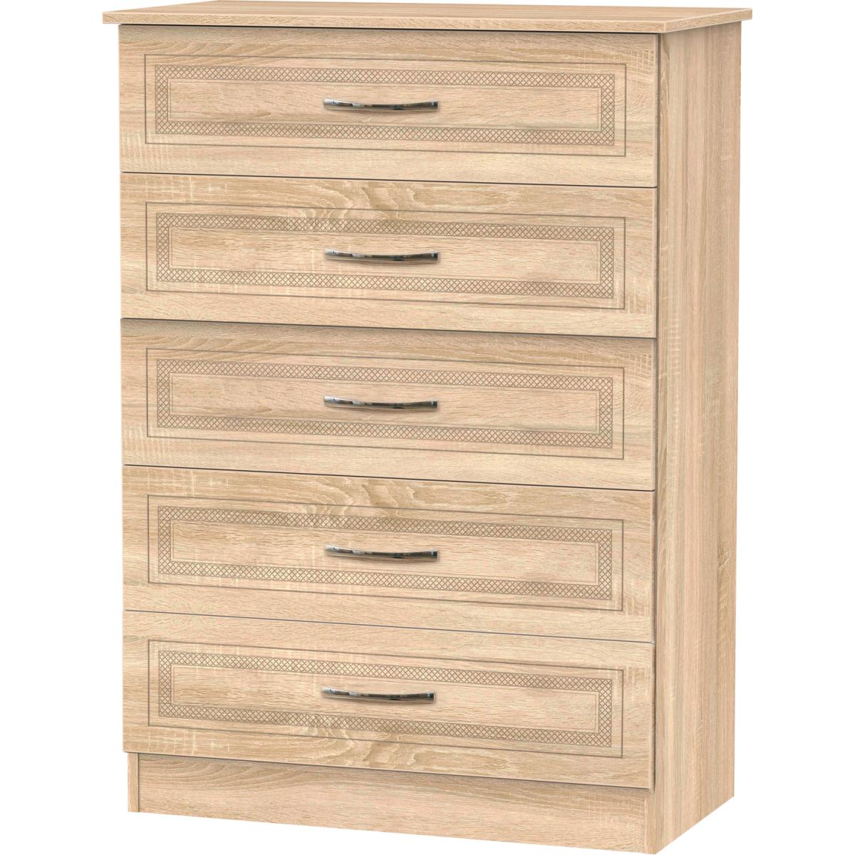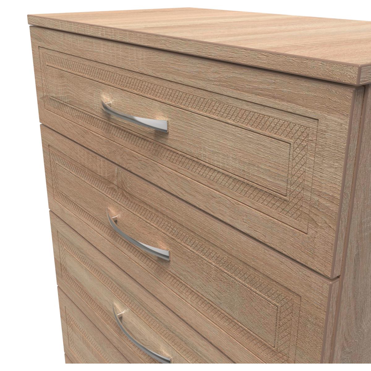 This wide 5 drawer chest of drawers is practical and stylish. Perfect for any home as a free standing storage unit. The defining feature of the Dorset range is the detailed engraving on the doors and drawers which creates a visually aesthetic look. Available in a choice of wood effect finishes, you can choose the perfect combination of pieces to complete the mood of your room. All our furniture is made in the United Kingdom, to the highest quality. It is delivered direct to your location of choice by one of our two man delivery teams, and come full assembled (although legs may be removed to prevent damage in transit).