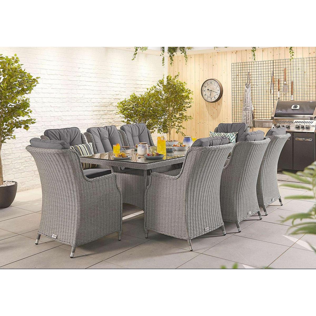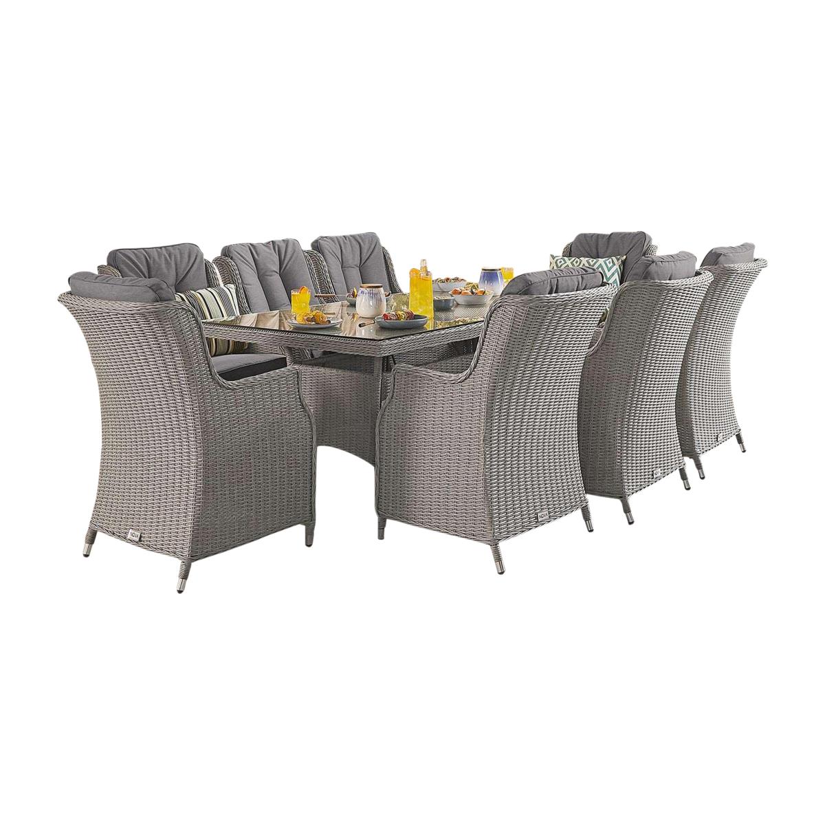 Enjoy the sun from the comfort of the relaxing Dorset rectangular dining set with eight chairs. A contemporary set in premium half-moon rattan that doesn’t need a cover. Garden party, anyone?. Why you'll love it. Contemporary rectangular dining set with eight chairs. Incredibly durable, all-weather half-moon PE rattan. Eight chairs and a glass-topped dining table. Easy to maintain and clean. Comfy, shower-proof cushions. Light yet strong aluminium frames. 5-year manufacturer’s warranty. What you need to know. Powder-coated aluminium frames are rust and weather-proof. 100% PE rattan is very hard wearing. UV stabilised and fade-proof, it can withstand weather, strong sunlight and temperature changes. Unlike cheaper alternatives, it will not crack or fade. Half-moon PE rattan for added durability. The dining table is topped with strong 5mm tempered safety glass. Cushions are shower-proof. Store inside when not in use. Foam with fibre cushion fillings. Zipped cushion covers can be machine washed up to 30 °C. Clean with water and a soft cloth. Avoid abrasive cloths or chemical cleaners. If your furniture is exposed to the salt of coastal winds we advise regular wiping down and covering of the furniture in winter and in stormy weather.