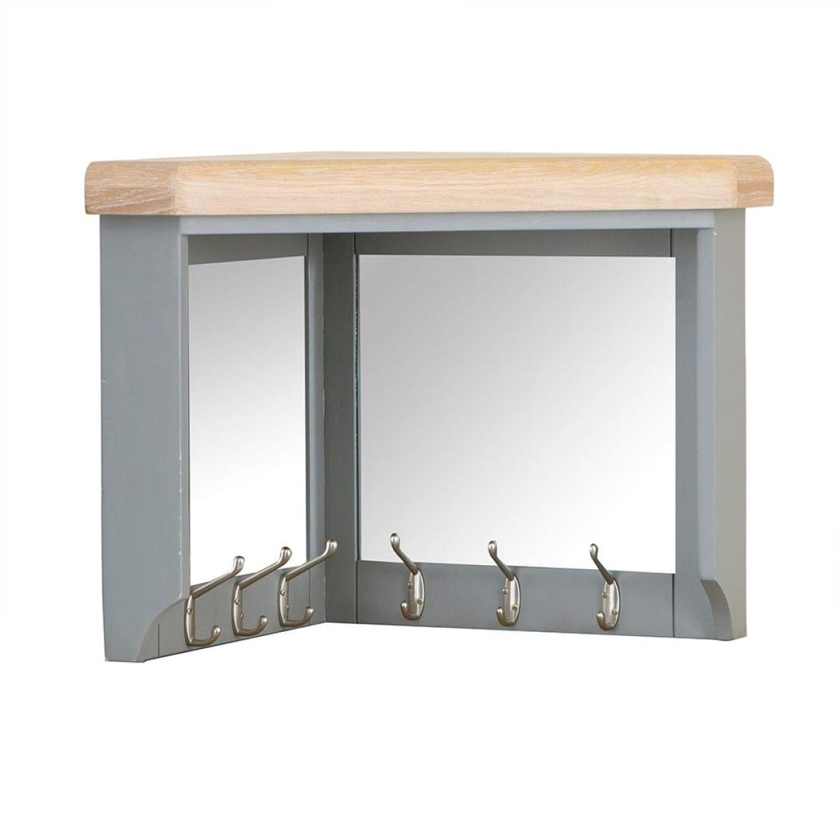 Fusing functionality and style, the Dorset Storm Grey Painted Oak Corner Mirrored Coat Rack is the perfect way to keep your home clutter clear whilst also making an impact. Easily elevate entranceways or hallways with this carefully crafted corner coat rack, that maximises space by making the most of often neglected areas. Fitting into corners, the mirrored panels allow you to check your outfit before you leave the door and add a touch of depth and light to a room when unused. With four coat hooks, this deep grey coat stand has a sophisticated finish that complements most tones with its neutral yet thoughtful shade. The whitewashed oak top contrasts magnificently with the darker grey finish and the six coat hooks offer you somewhere to keep your coats, hats, scarves, and keys when not in use. A stylish addition to any home be it a classical style or a more modern aesthetic, bring class and practicality together in one with this mirror coat rack.