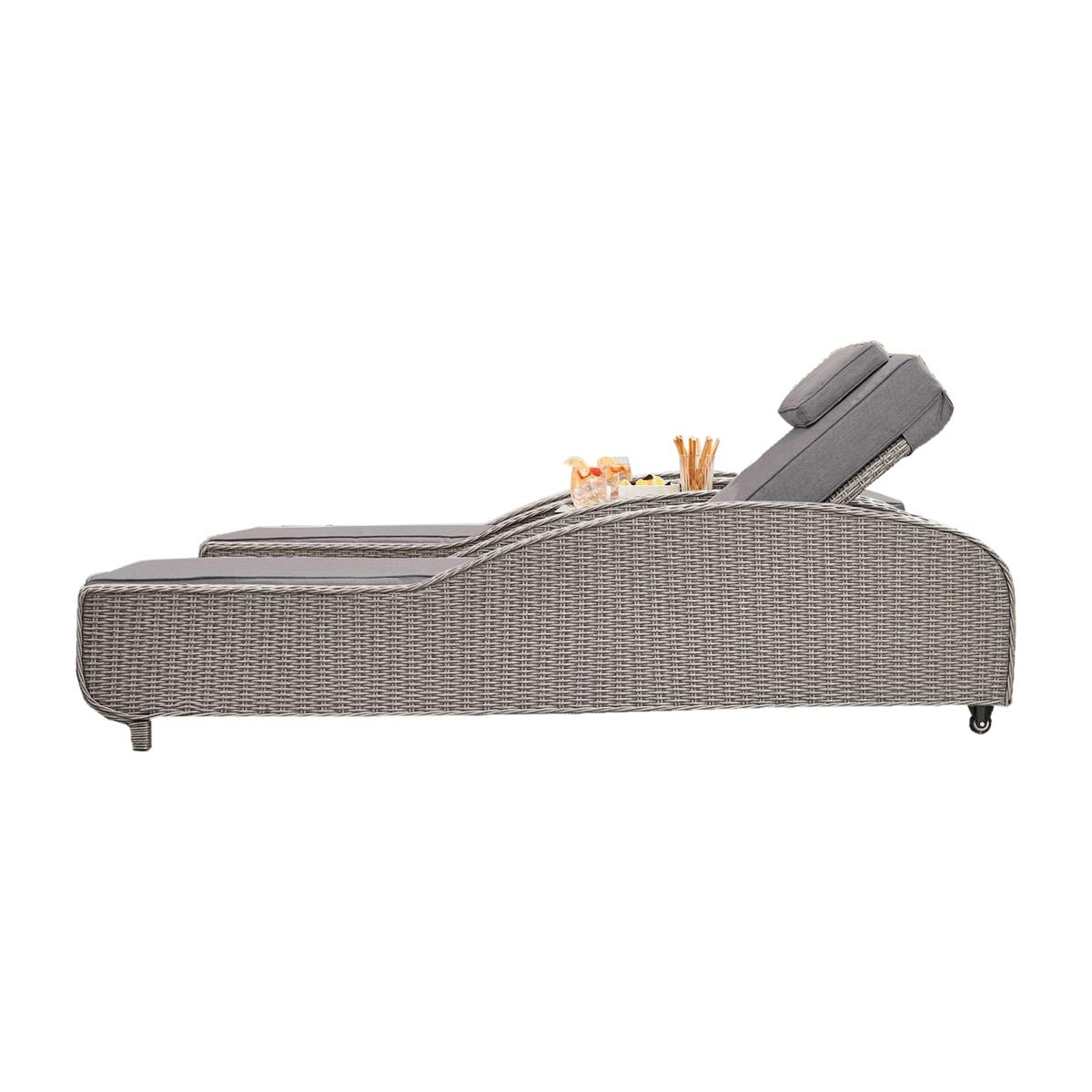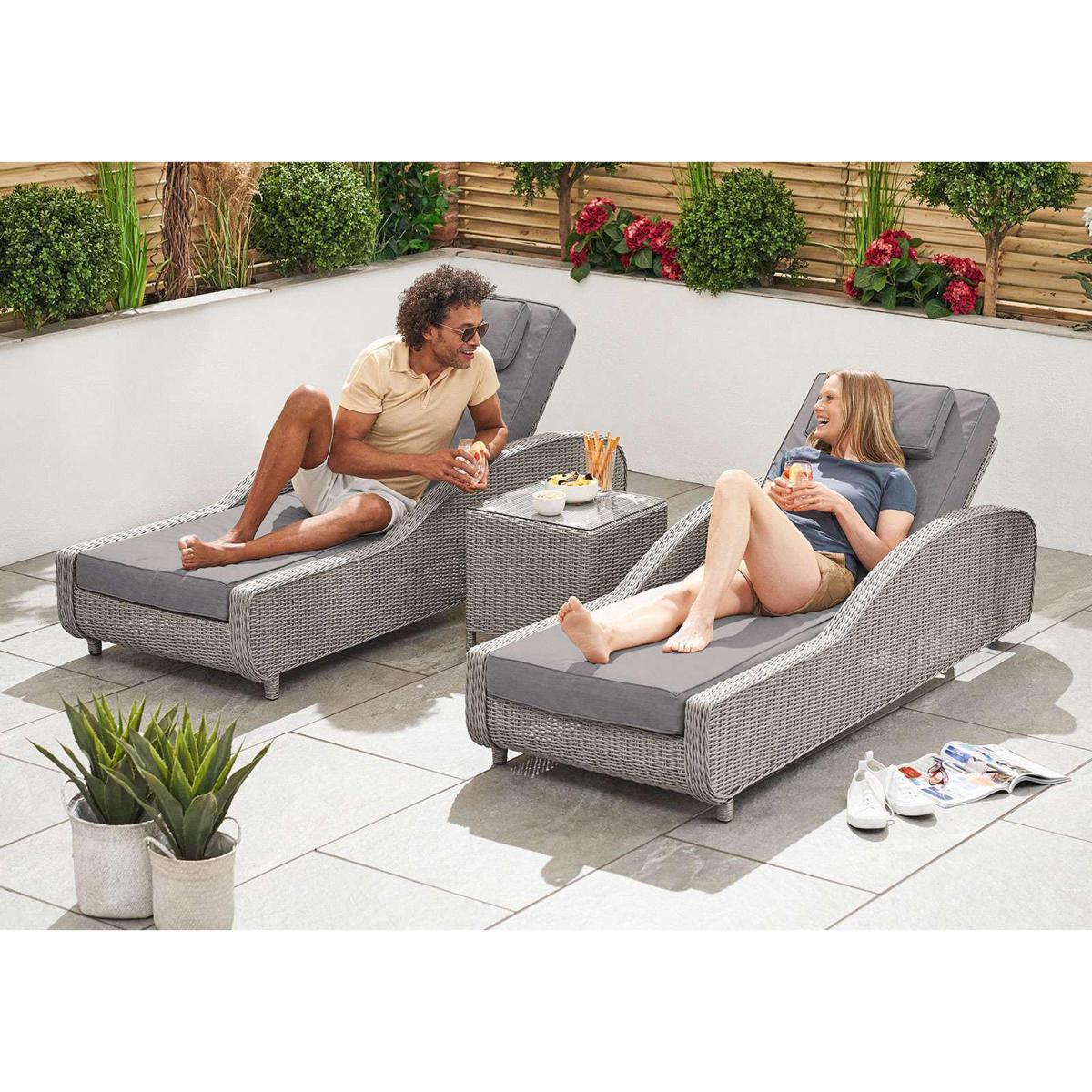 Make the most of British summer with the Dorset sun lounger set. The perfect compact set that lets you soak up the sun on comfy cushions. Just add an Aperol Spritz. Why you'll love it. Modern lounger set of two comfy loungers and a table. Incredibly durable, all-weather half-moon PE rattan. Compact size suits smaller patios. Easy to maintain and clean. Comfy, shower-proof cushions. Light yet strong aluminium frames. 5-year manufacturer’s warranty. What you need to know. Powder-coated aluminium frames are rust and weather-proof. 100% PE rattan is very hard wearing. UV stabilised and fade-proof, it can withstand weather, strong sunlight and temperature changes. Unlike cheaper alternatives, it will not crack or fade. Half-moon PE rattan for added durability. Foam with fibre cushion fillings. Zipped cushion covers can be machine washed up to 30 °C. Clean with water and a soft cloth. Avoid abrasive cloths or chemical cleaners. If your furniture is exposed to the salt of coastal winds we advise regular wiping down and covering of the furniture in winter and in stormy weather.
