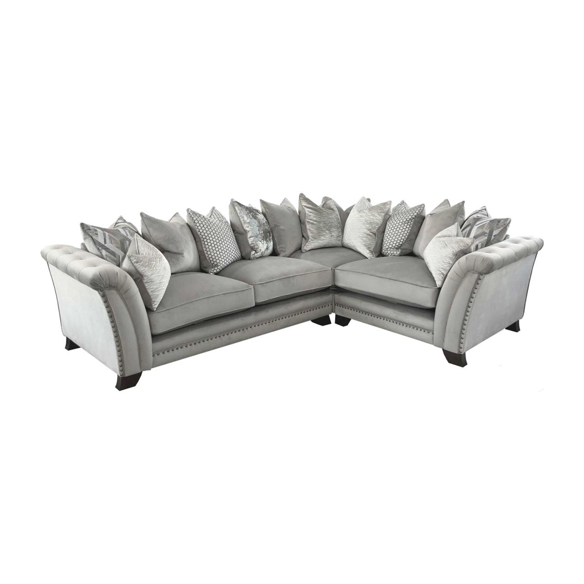 Design. Layered up with luxurious scatter cushions in soft and stylish fabrics, the Dorsey pillow back corner sofa is a sight for sore eyes. Its grand proportions and classically inspired details make a real statement, from the elegant pleated arms to the expertly applied studding. Offering plenty of room for you to get comfortable, it’s a heavenly corner sofa to come home to. Also comes in a standard back design. Shop matching chairs and footstools in the complete Dorsey range.