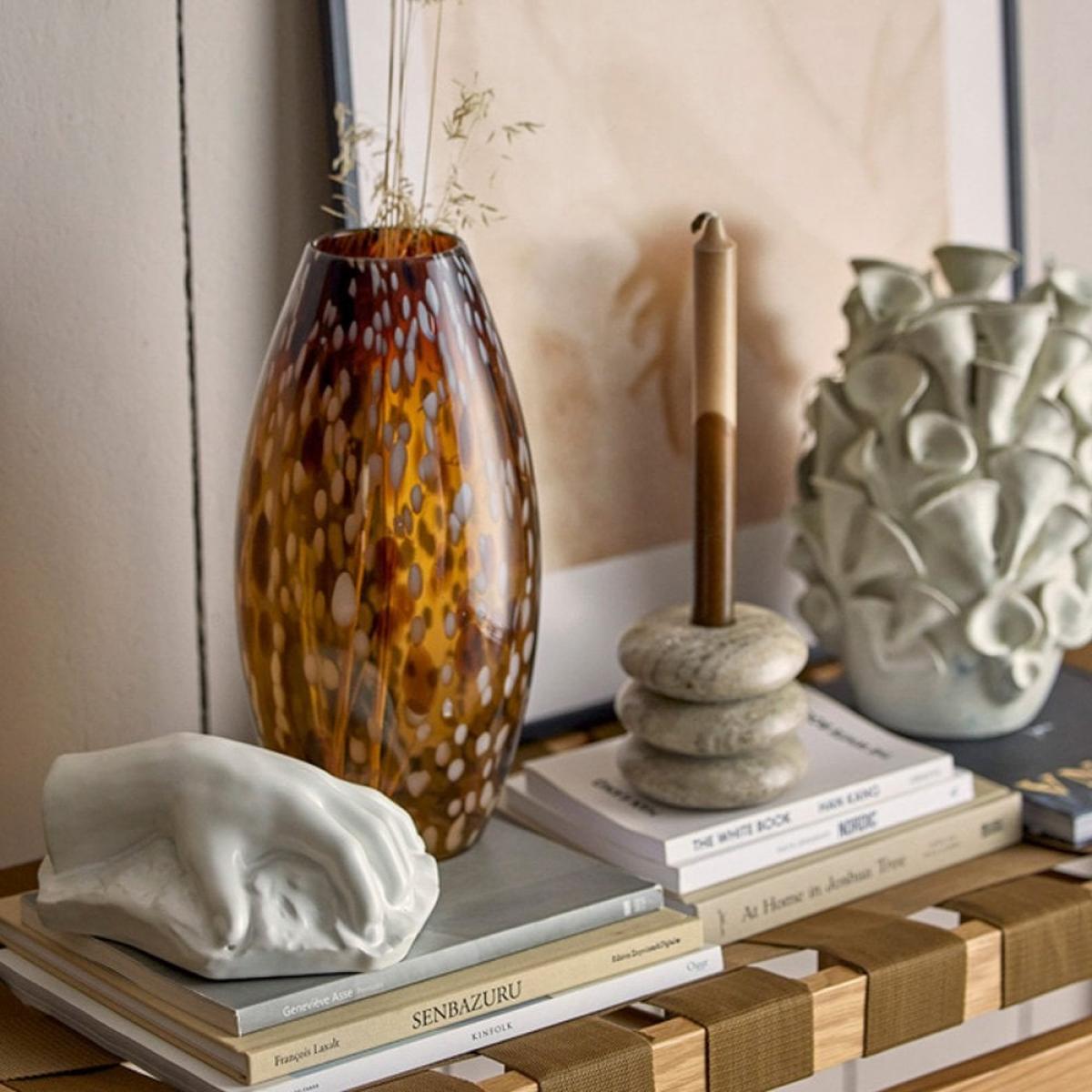 I really like this verre, as its warm brown hues and organic pattern bring a subtle earthy tone to a space. It works particularly well in neutral or boho interiors, where it can add visual interest without overwhelming the decor. For styling, I recommend using it with fresh or dried botanicals to showcase its colour and form. Placing it on a console table or shelving unit alongside textured ceramics or natural materials enhances its natural appeal. Keep in mind, it’s a statement piece on its own, so avoid overcrowding to allow its colour and shape to stand out.