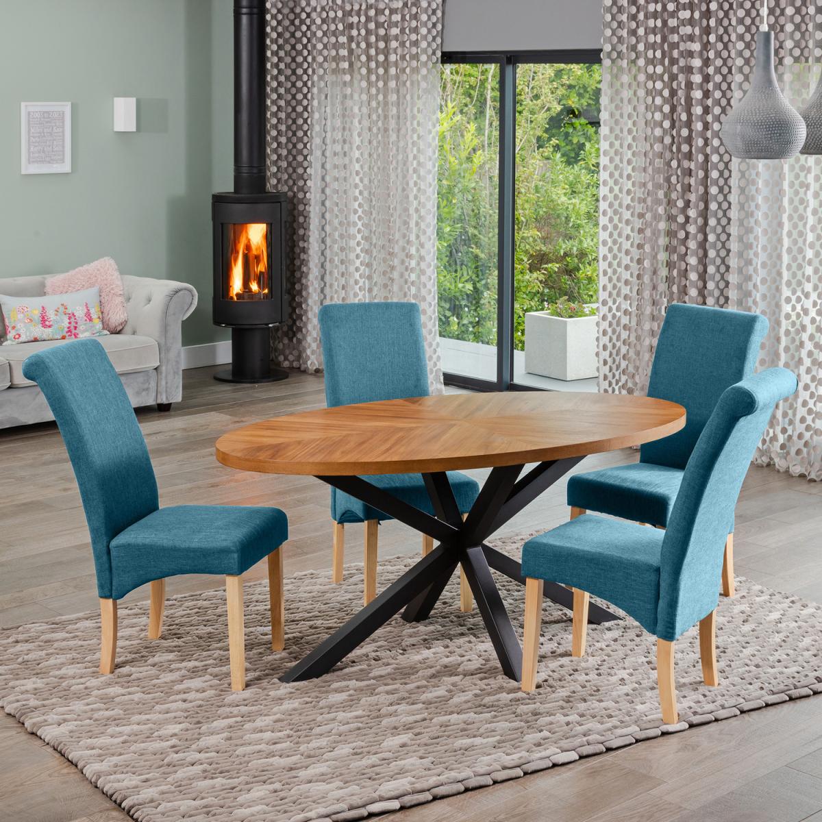 Introducing the Doseena Oval Dining Table Set with 4 Rimini Fabric Chairs! This stylish dining set perfectly combines contemporary design and functionality, adding a touch of elegance to your dining space. The 170cm long oval dining table features a striking contrasting quartered design, adding visual interest and sophistication. The table stands at a comfortable height of 75cm, ideal for dining and socializing. Its contemporary crossed powder-coated legs provide a sturdy and stylish foundation, while the wooden veneer finish enhances durability and offers a warm, natural look. Included in this set are 4 Rimini dining chairs, each upholstered in a textured fabric that looks chic and provides a comfortable seating experience. The foam-filled seats ensure long-lasting comfort, making every meal enjoyable. The chairs' long light wooden legs complement the table's design, creating a cohesive and harmonious aesthetic. The Doseena Oval Dining Table Set with 4 Rimini Fabric Chairs is perfect for adding an accent to any dining room. Whether hosting a dinner party or enjoying a quiet family meal, this dining set elevates your dining experience. Its modern design and high-quality materials make it a standout addition to your home decor. Enjoy quick efficient delivery, ensuring your new dining set arrives promptly ready to enhance your home. Transform your dining space with the Doseena Oval Dining Table Set with 4 Rimini Fabric Chairs, where style meets practicality in perfect harmony.