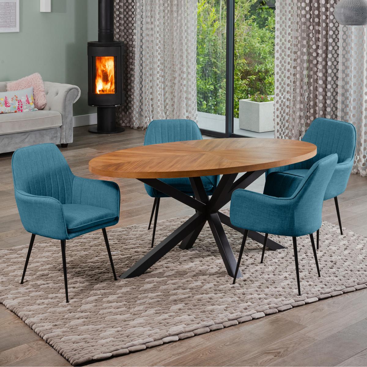 Elevate your dining experience with the luxurious Dossena Oval Dining Table Set with 4 Carrara Fabric Chairs. This stunning set seamlessly combines modern design and exceptional comfort, making it an ideal centrepiece for any contemporary home. The highlight of this set is the 170cm long oval dining table, featuring a captivating contrasting quartered design. This sophisticated pattern adds a unique touch to your dining space, while the contemporary crossed powder-coated legs ensure robust support and a sleek, modern aesthetic. Standing at 75cm in height, this table offers the perfect surface for family meals and elegant dinner parties alike. The wooden veneer finish not only enhances the table's visual appeal but also guarantees long-lasting durability and easy maintenance. Accompanying the table are 4 Carrara dining chairs, upholstered in textured fabric. These chairs feature a modern armchair style, providing both style and comfort. The rich texture of the upholstery adds a touch of luxury, while the foam-filled seats ensure a comfortable dining experience. The long light wooden legs complement the table's design, creating a cohesive and elegant look. The Dossena Oval Dining Table Set with 4 Carrara Fabric Chairs is perfect for those who appreciate fine craftsmanship and contemporary design. Whether you're hosting a formal dinner party or enjoying a casual family meal, this dining set will enhance the ambiance of your dining area. Enjoy the convenience of quick and efficient delivery, ensuring your new dining set arrives promptly and is ready to transform your dining space. With its blend of modern design, luxurious materials, and superior comfort, the Dossena Oval Dining Table Set with 4 Carrara Fabric Chairs is a perfect addition to any home. Create unforgettable dining experiences and make a lasting impression with this exquisite dining set.