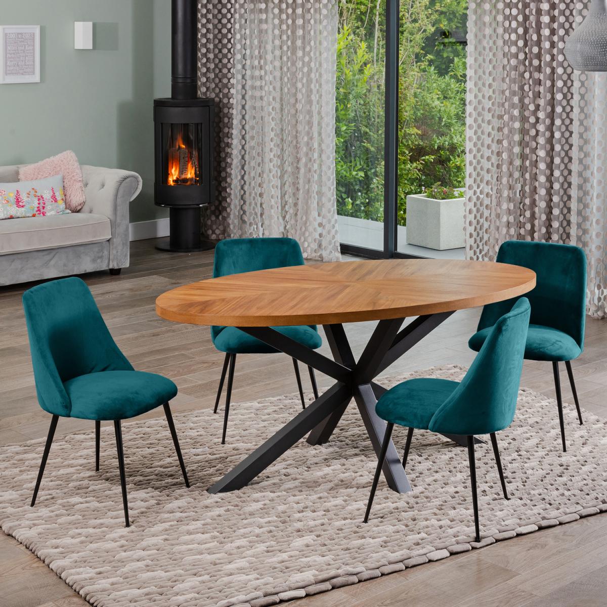 Introducing the Dossena Oval Dining Table Set with 4 Morandi Velvet Chairs - an exquisite combination of style and comfort that will elevate your dining experience. This set features a sleek 170cm long oval dining table with a contrasting quartered design, adding a touch of sophistication to your dining area. Supported by contemporary crossed powder-coated legs with a wooden veneer finish, this table stands at a comfortable height of 75cm. Included in this set are four luxurious Morandi velvet chairs, upholstered in sumptuous velvet fabric for a touch of opulence. The contemporary sleek design of these chairs adds a modern flair to your dining space, while the foam-filled seats ensure maximum comfort during long meals and gatherings. With their sturdy black metal legs, the Morandi velvet chairs offer both style and durability, making them the perfect complement to the elegant design of the dining table. Whether you're hosting dinner parties or enjoying everyday meals with family, this dining set provides the perfect blend of style and functionality. Experience the convenience of having everything you need for a complete dining setup delivered straight to your doorstep. With its impeccable craftsmanship and attention to detail, the Dossena Oval Dining Table Set with 4 Morandi Velvet Chairs is sure to impress even the most discerning of guests. Elevate your dining space with this stunning set today!