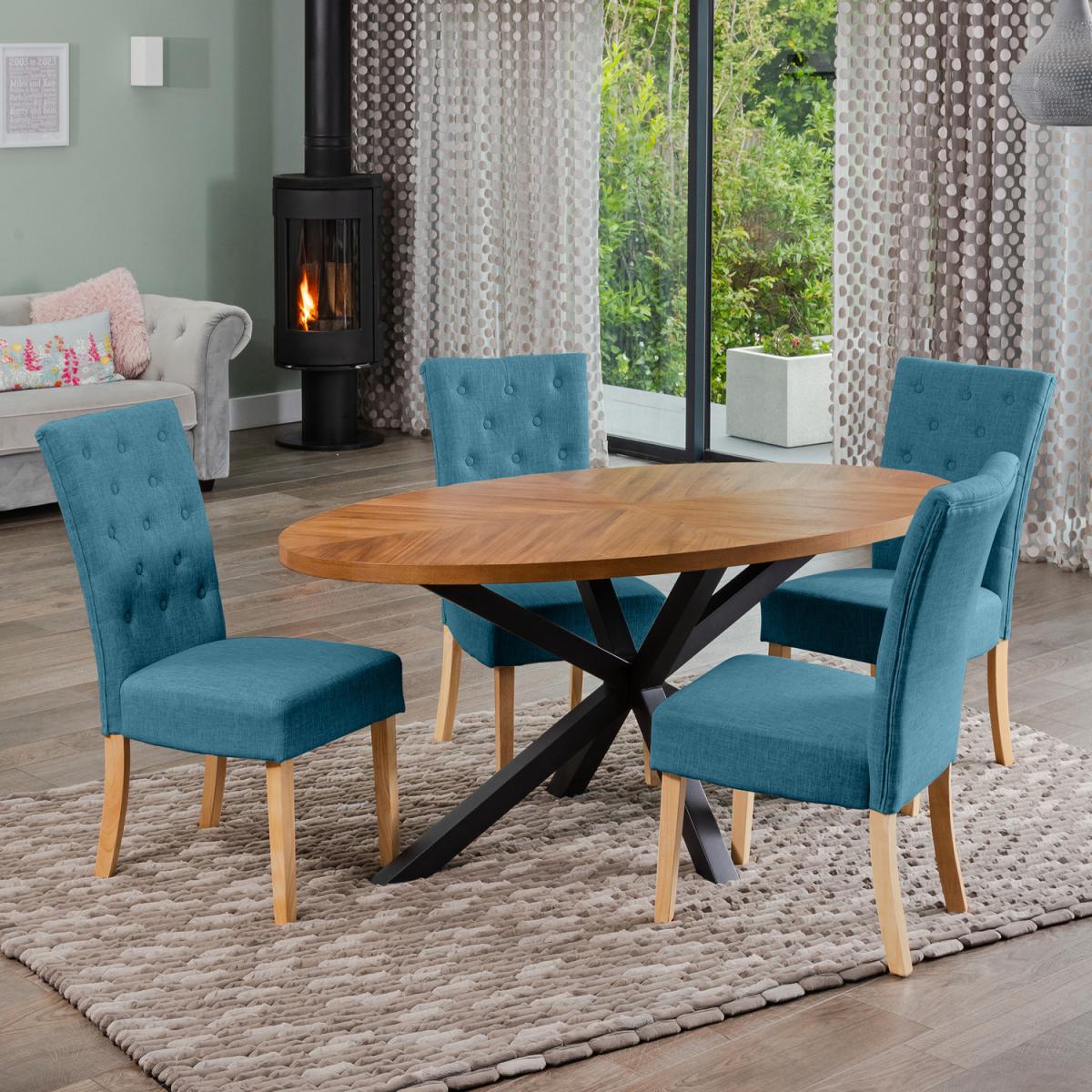 Transform your dining space with the Dossena Oval Dining Table Set with 4 Pienza Fabric Chairs! This exceptional set combines modern sophistication with practical elegance, creating a captivating centrepiece for any dining room. The 170cm long oval dining table features a striking contrasting quartered design, adding a touch of artistic flair to your home. Standing at a comfortable height of 75cm, this table is perfect for family gatherings and intimate dinners alike. The contemporary crossed powder-coated legs provide sturdy support while enhancing the table's sleek, modern aesthetic. The wooden veneer finish adds a layer of natural beauty and durability, ensuring this table remains a stylish focal point for years to come. Included in this set are 4 Pienza dining chairs, each upholstered in a textured fabric that offers a rich, tactile experience. The studded back design adds a unique touch of elegance, making these chairs as stylish as they are comfortable. The foam-filled seats ensure maximum comfort, allowing you and your guests to dine in luxury. The chairs feature long light wooden legs, which perfectly complement the table's design, creating a cohesive and visually appealing look. The Dossena Oval Dining Table Set with 4 Pienza Fabric Chairs is perfect for adding an elegant accent to any dining room. Whether hosting a sophisticated dinner party or enjoying a casual meal with family, this dining set elevates your dining experience with its blend of contemporary style and high-quality materials. Enjoy quick efficient delivery, ensuring your new dining set arrives promptly and is ready to enhance your home. Experience the perfect harmony of modern design and everyday functionality with the Dossena Oval Dining Table Set with 4 Pienza Fabric Chairs, where style meets comfort in every detail.