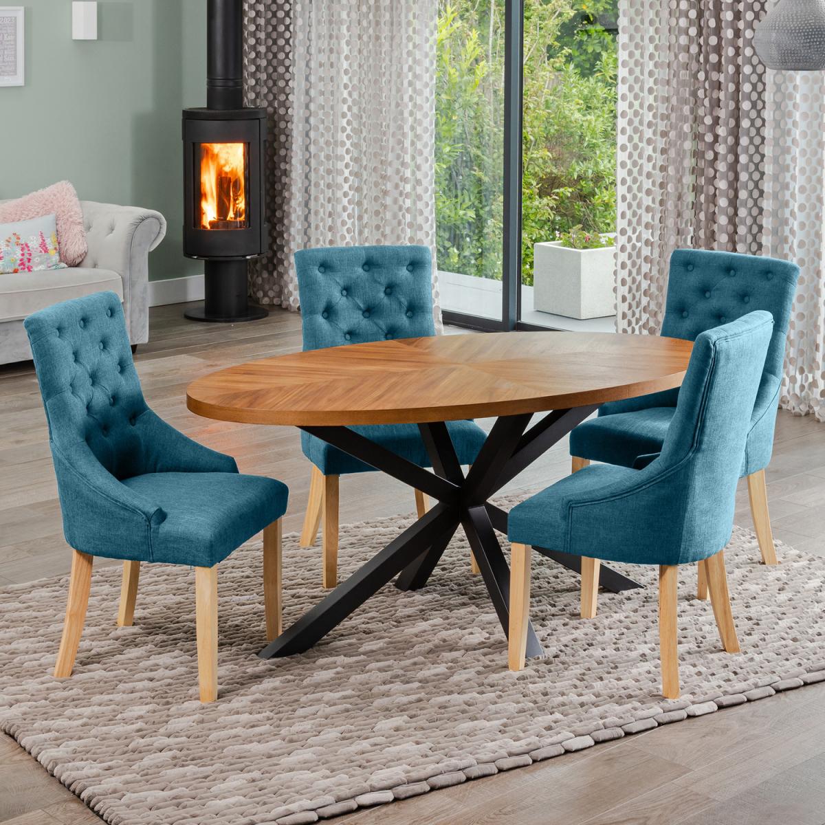 Elevate your dining experience with the Dossena Oval Dining Table Set with 4 Ravenna Fabric Chairs! This elegant dining set seamlessly combines modern design and luxurious comfort, making it a standout addition to any dining room. The 170cm long oval dining table boasts a unique contrasting quartered design, adding a contemporary touch to your home decor. Standing at 75cm in height, it provides the perfect dining surface for family meals and entertaining guests. The table features contemporary crossed powder-coated legs that offer a sleek, industrial look while ensuring robust support. Finished with a high-quality wooden veneer, this table combines natural aesthetics with durability, promising long-lasting style and functionality. Accompanying the table are 4 Ravenna dining chairs, each upholstered in a sophisticated textured fabric that enhances both comfort and style. The chairs feature an elegant studded back design, adding a refined touch that complements the table's modern appeal. With foam-filled seats, these chairs provide exceptional comfort, allowing you and your guests to relax and enjoy extended meals. The long light wooden legs of the chairs not only ensure stability but also contribute to the set's cohesive and chic design. The Dossena Oval Dining Table Set with 4 Ravenna Fabric Chairs is perfect for infusing your dining room with a blend of contemporary elegance and luxurious comfort. Whether hosting a formal dinner party or enjoying casual family dinners, this set delivers both style and practicality to your dining space. Enjoy quick efficient delivery, ensuring your new dining set arrives promptly and is ready to enhance your home. Experience the ultimate in dining sophistication with the Dossena Oval Dining Table Set with 4 Ravenna Fabric Chairs, where modern design meets luxurious comfort.