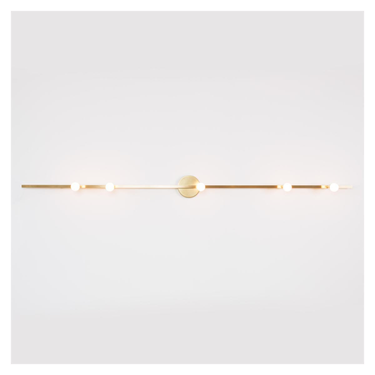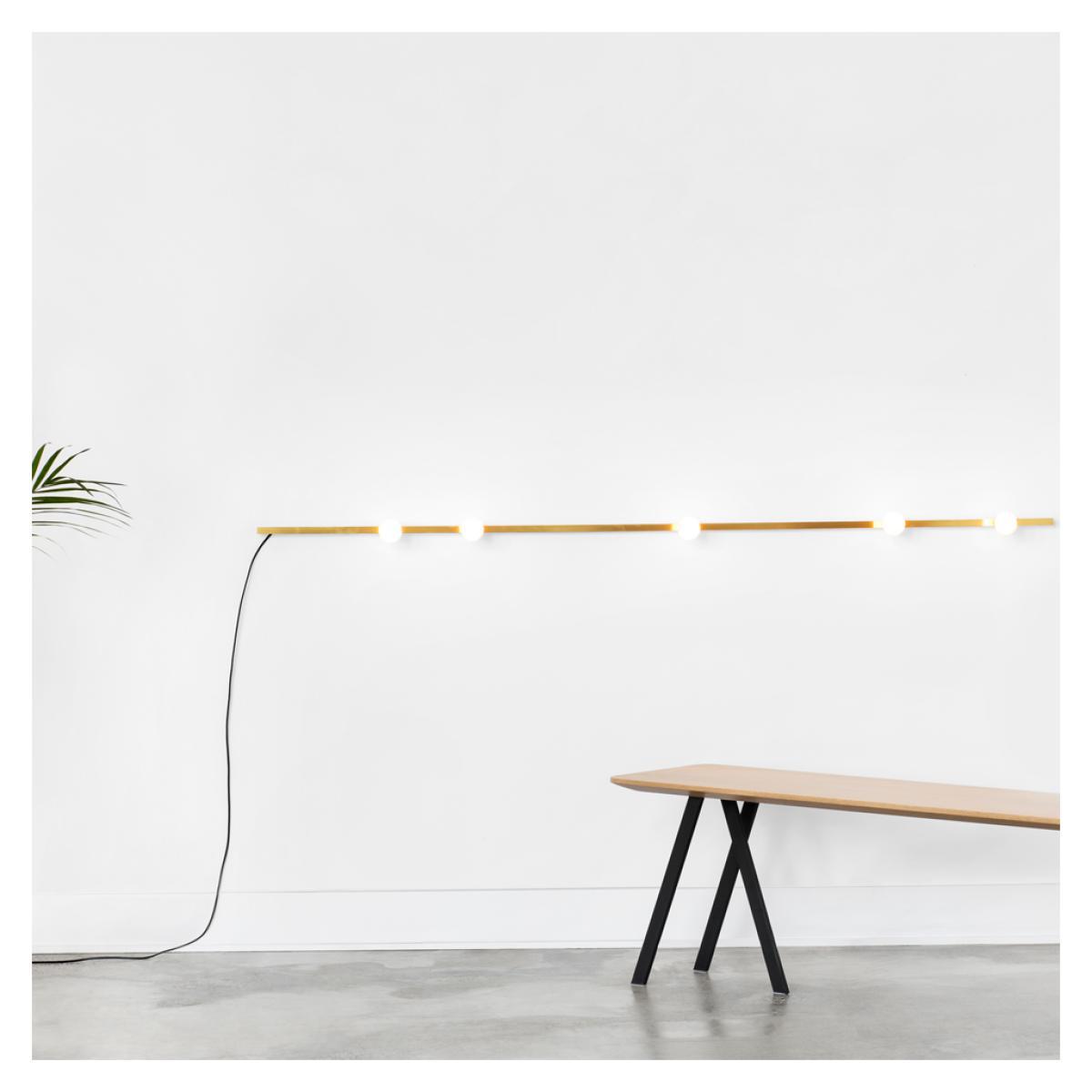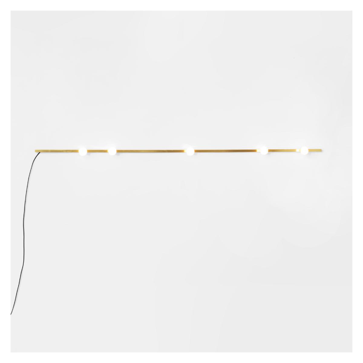 The brass Dot Line Wall Light is a minimalist design by Montreal-based studio, Lambert & Fils. A statement lighting solution, the Dot Line Wall Light is formed from a line of steel with a brass finish, accented with a series of opal diffusers in a random configuration along the stem. Lambert & Fils was founded in 2010 by Samuel Lambert, a lighting design studio based in Montreal taking inspiration from mid-century Modernism, industrial design and minimalist aesthetics. An eye-catching wall lamp perfect for illuminating corners, the brass Dot Line Wall Lamp is the perfect design to enhance a contemporary space. Requires: 3 x Max 3. 5W G9 LED bulbs (included). Please note: This product is hardwired and requires installation.