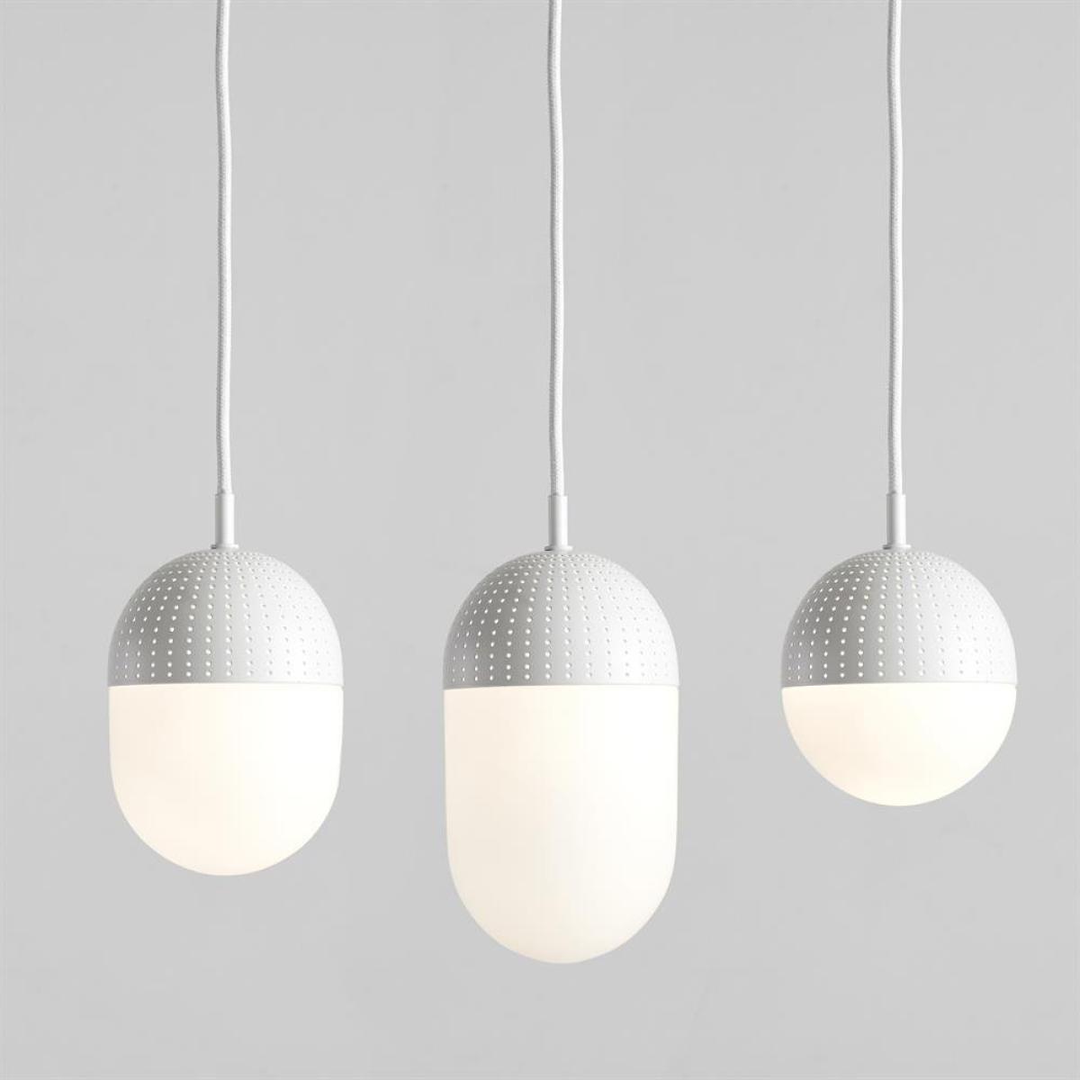 The Dot pendant medium by Woud was designed by Rikke Frost and is a unique lighting option for a bedroom, kitchen, living room or hallway. The lamp is made up of an opal glass shade and is paired with a perforated metal top that creates a wonderful play of light on the ceiling. Available in different colors.