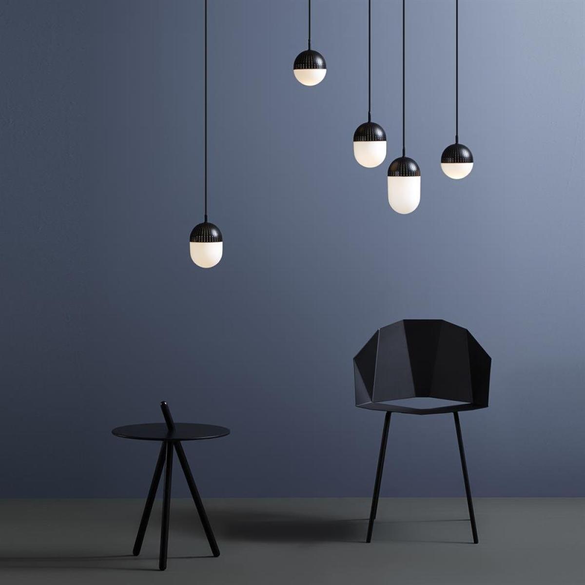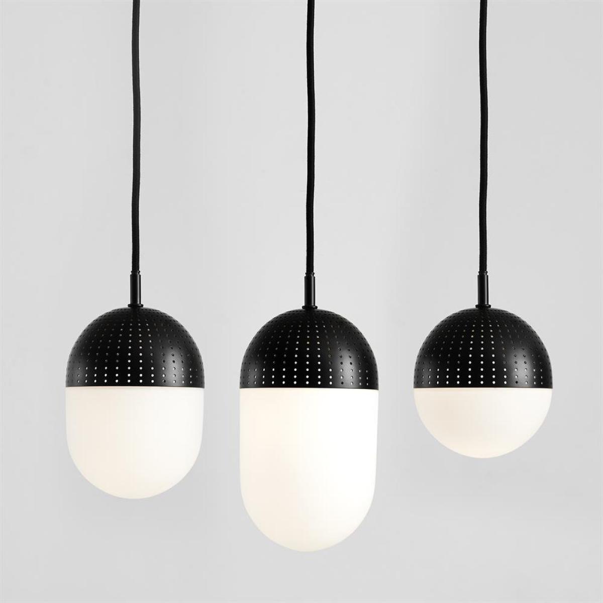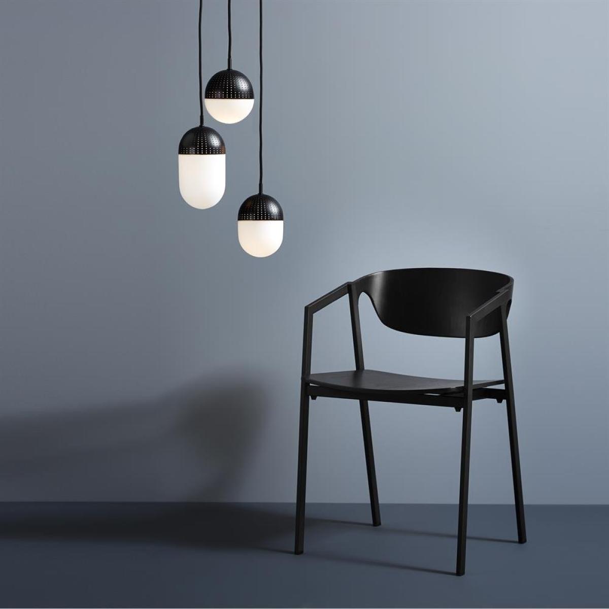 The Dot pendant by Woud is a small pendant that is simply perfect for a narrow hallway, over a kitchen table or in a reading nook. The Dot lamp was designed by Rikke Frost and is a simple modern design that combiens opal glass and perforated metal for a wonderful play of light on your ceiling.