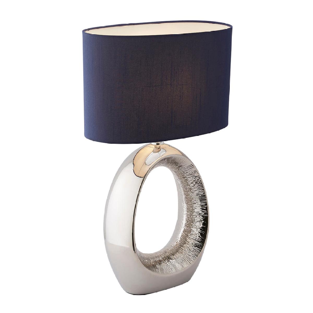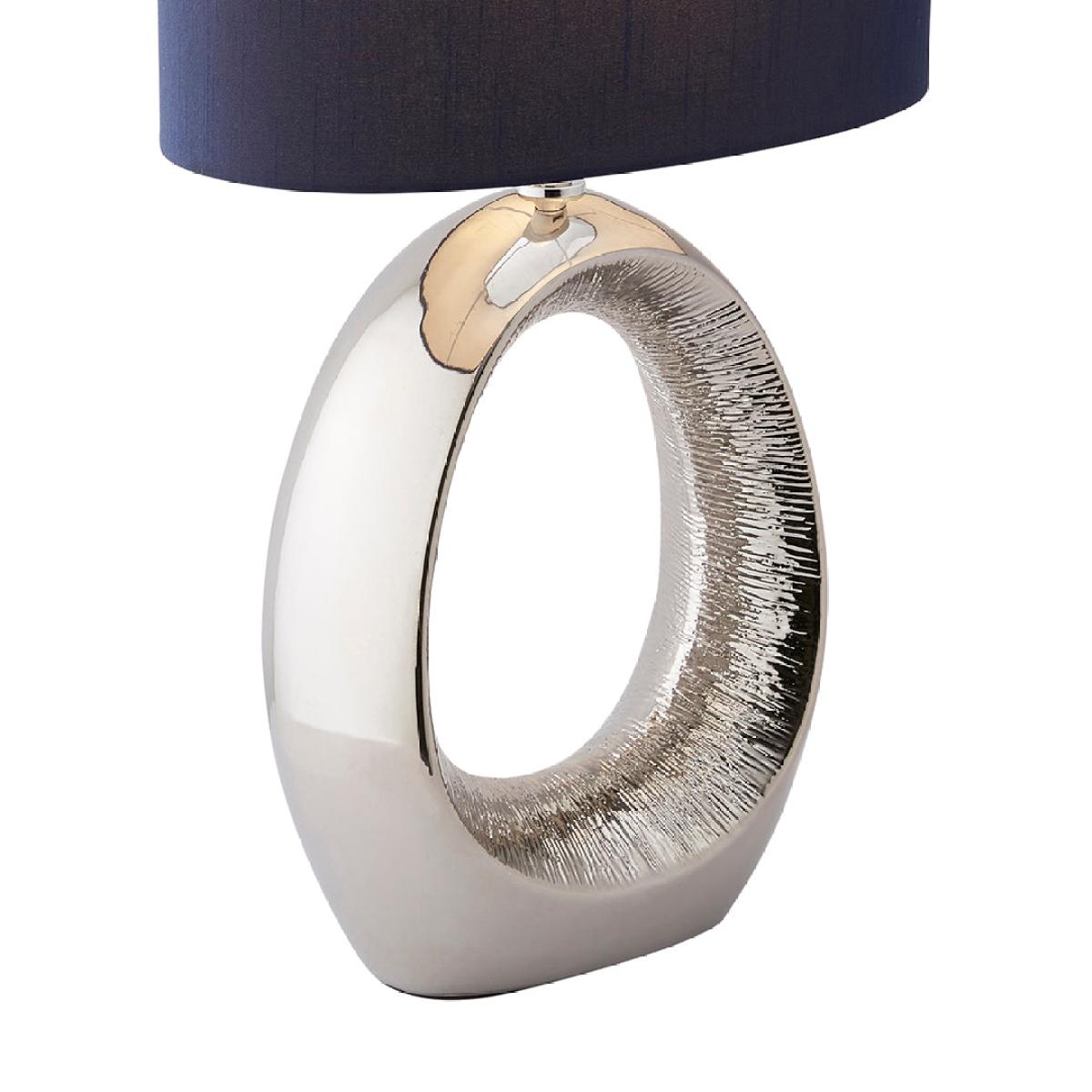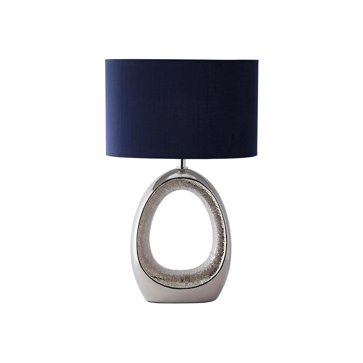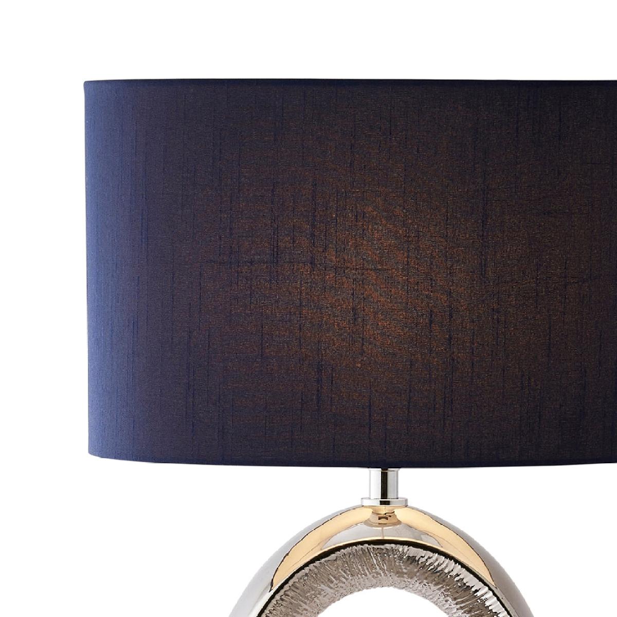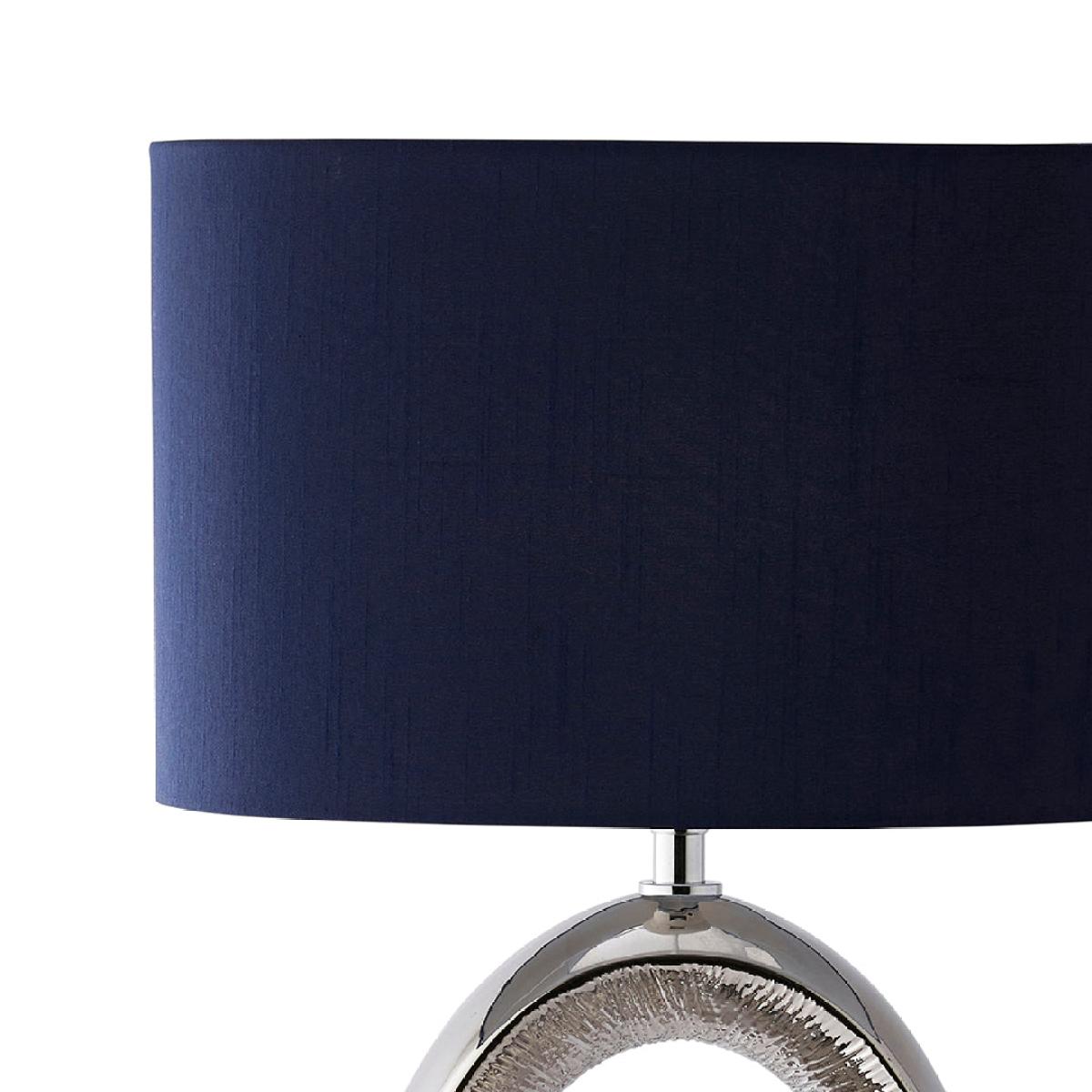 Dott 1-light ceramic table lamp, featuring a polished chrome base with a textured cut-out design and a dark blue oval shade. The Dott table lamp is a striking statement piece that combines modern elegance with unique design details. It features a polished chrome base with a bold cut-out design in the center, drawing the eye and adding dimension. The lamp is paired with a dark blue oval shade, which enhances its sophisticated and contemporary style. Perfect for adding a touch of luxury to any room, this lamp casts a warm and inviting glow, making it ideal for living rooms, bedrooms or entryways. Its distinctive design will effortlessly elevate the decor in any modern or transitional space. Dott 1-light ceramic table lamp, featuring a polished chrome base with a textured cut-out design and a dark blue oval shade. The Dott table lamp is a striking statement piece that combines modern elegance with unique design details. It features a polished chrome base with a bold cut-out design in the center, drawing the eye and adding dimension. The lamp is paired with a dark blue oval shade, which enhances its sophisticated and contemporary style. Perfect for adding a touch of luxury to any room, this lamp casts a warm and inviting glow, making it ideal for living rooms, bedrooms or entryways. Its distinctive design will effortlessly elevate the decor in any modern or transitional space.