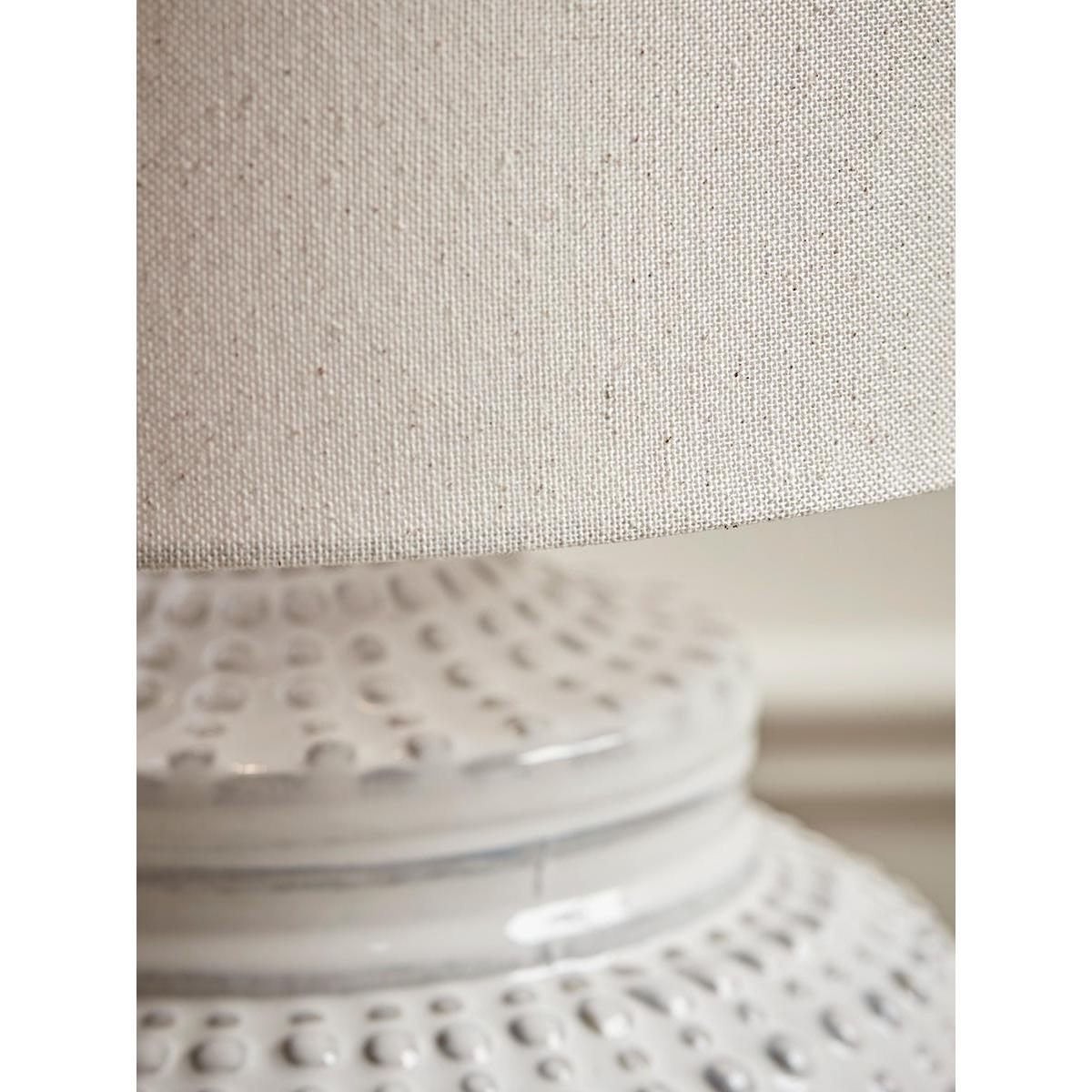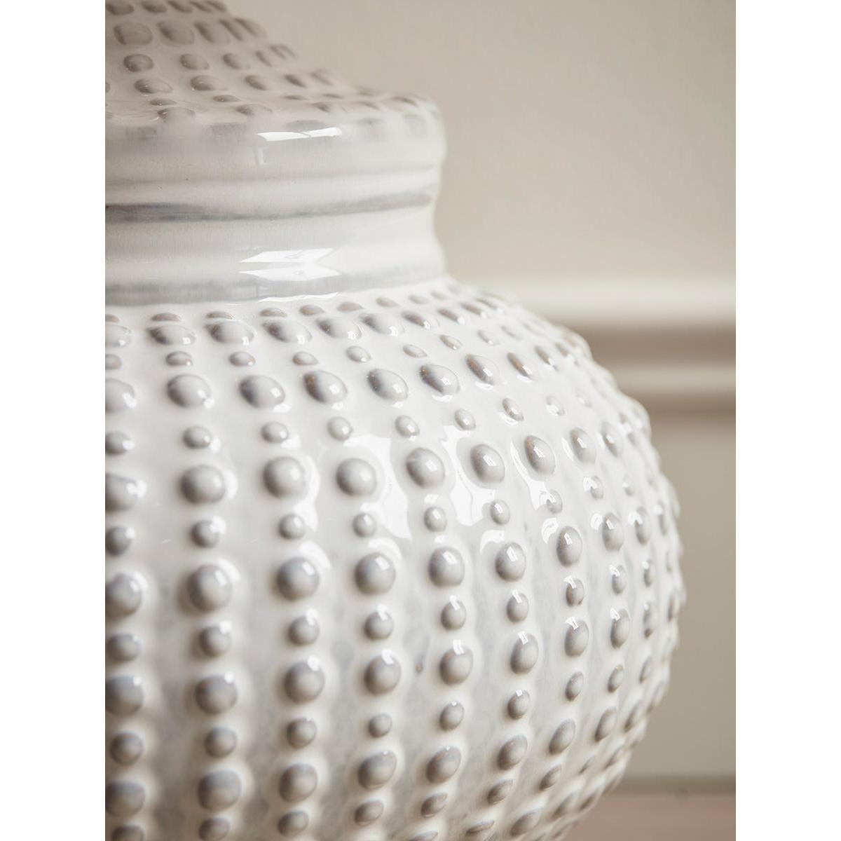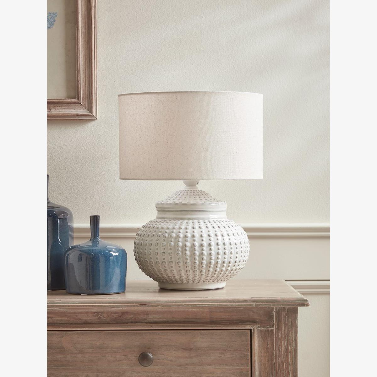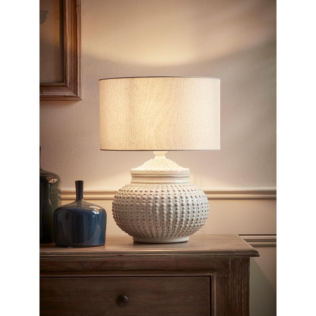 With a classic jar shaped base and a raised pattern of dotty spots, this cream glazed table lamp with its ample proportions and curvaceous outline is the perfect statement piece to pair with an elegant console or side table. The lamp is completed with a textural fabric shade with an open weave in a matching neutral. Discover how to create the perfect lighting scheme for your home using our Lighting Buying Guide.