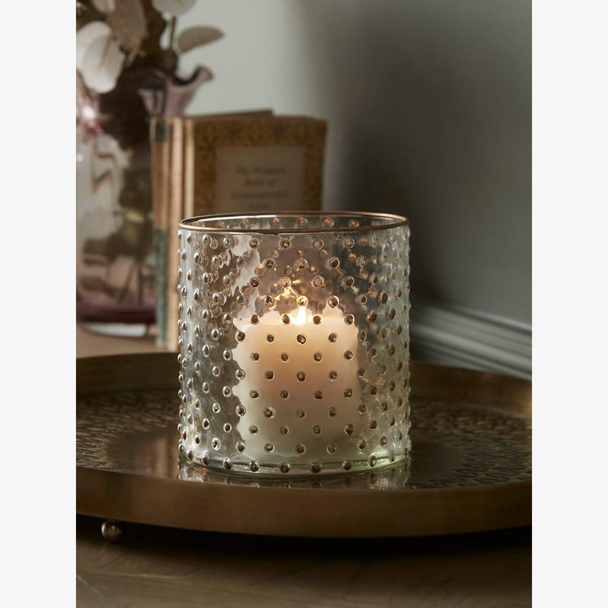I love the dots detail on this tealight holder-it adds texture and visual interest without being overwhelming. It’s quite versatile and works well in both contemporary and vintage-inspired interiors. I’d style it on a coffee table, cluttered shelf, or even as a centrepiece to create a warm, inviting glow. For practical tips, group a few in different sizes and finishes for a layered look, or pair it with greenery or linen for a softer, more relaxed vibe. Its transparent design makes it adaptable, letting the flickering flame shine through beautifully while adding a touch of subtle charm to any space.