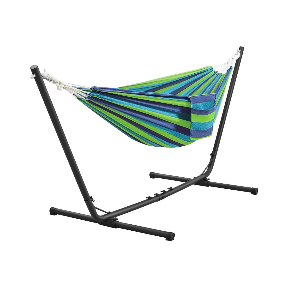 Crafted with professional outdoor fabric, the hammock boasts exceptional durability, weather resistance, and vibrant color retention for year-round outdoor use. Adjust the hammock length to your preference with three options, ensuring your utmost comfort. The stable and robust base, made of powder-coated heavy-duty iron tubes, can support up to 205 kg, accommodating two adults effortlessly. With added features like anti-slip foot pads, multiple color options, and a carry bag, this hammock set is designed to elevate your outdoor experience to new levels of relaxation and enjoyment.