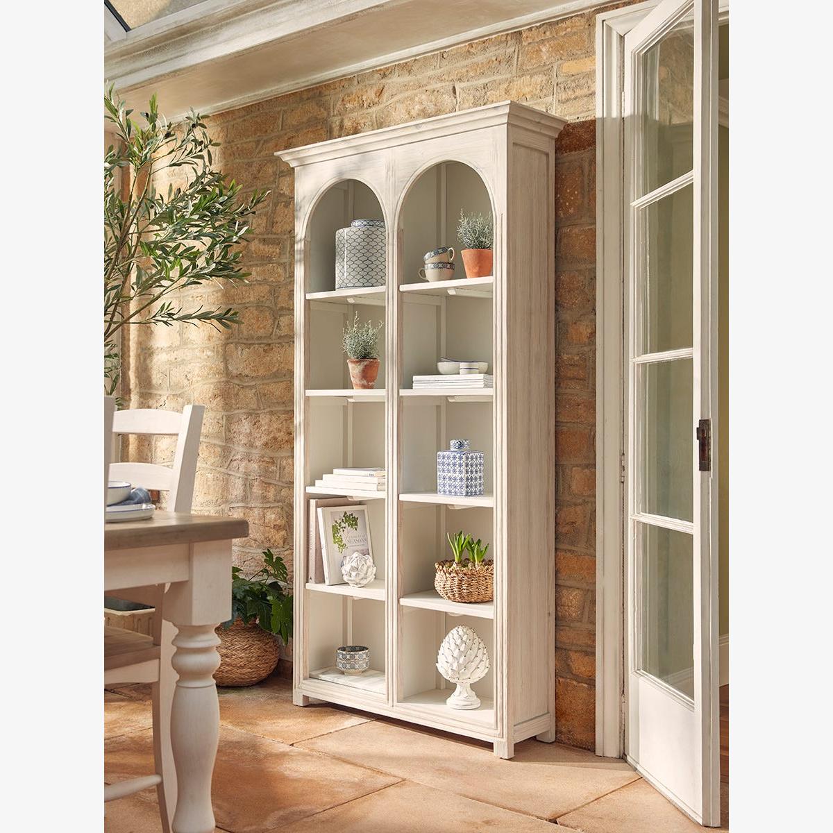 I’m a fan of this arched shelving unit for how its simple curves and light finish slot neatly into both modern and country-style schemes. It works just as well in a narrow hallway or a relaxed living room, offering vertical storage without feeling bulky. For styling, keep at least one compartment per column fairly minimal - a small plant or sculptural object - to prevent overcrowding. Mix in books laid horizontally and vertically, use woven baskets on the lower shelves to corral smaller items, and add a touch of green foliage to bring the finish to life. Keeping a consistent palette of three or four colours across your accessories will maintain cohesion and let the unit’s graceful arches shine.