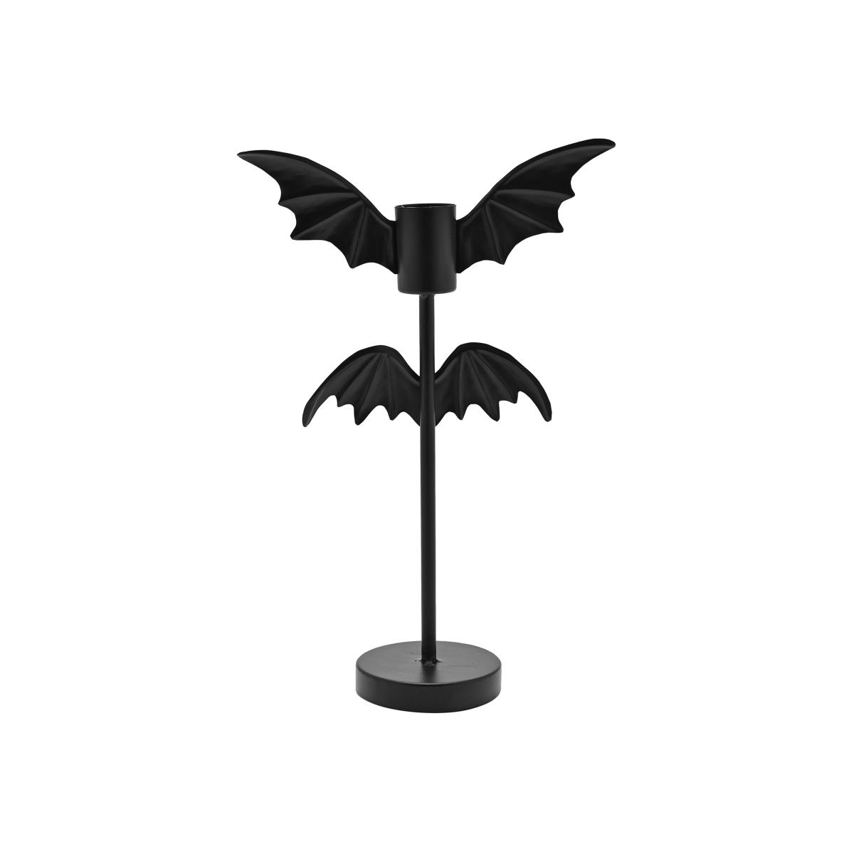 * Eye-catching decorative piece* Suitable for taper candles* Matt black finish* Metal This unique candlestick holder serves as a stunning focal point for any Halloween setting. Made from high-quality metal, its sleek matt black finish exudes an eerie elegance perfect for the season. Intricate bat wings add a gothic touch that’s sure to impress. Suitable for taper candles.