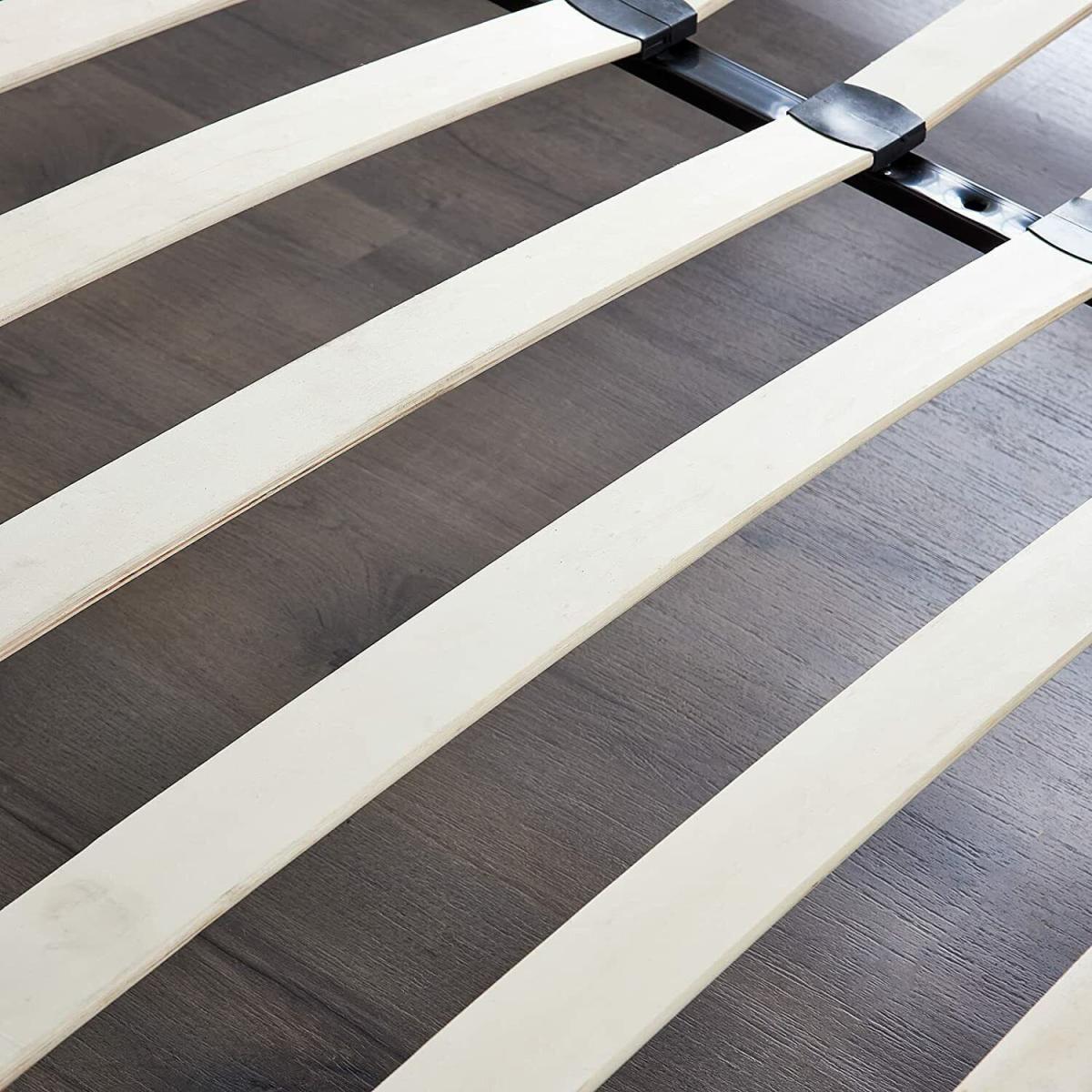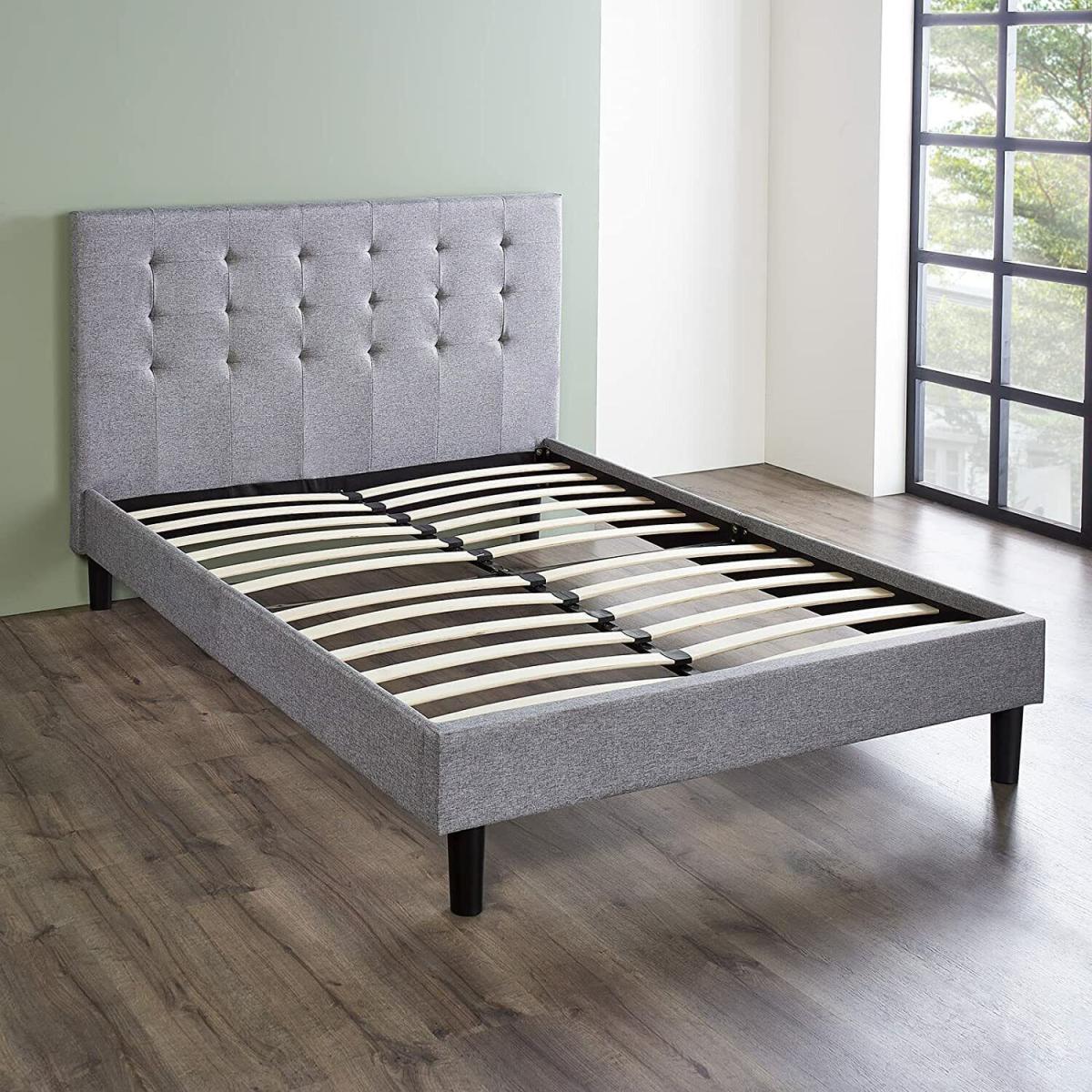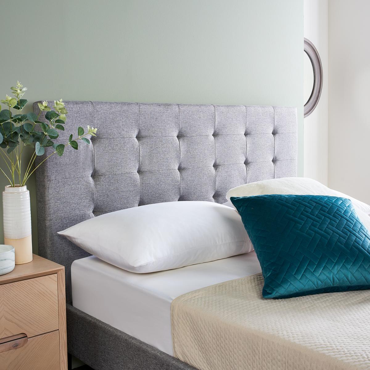 Upholstered beautiful grey linen that will effortlessly blend into any bedroom interior. Large feature buttoned headboard included. Extra padded headboard, base & sides for a sound nights sleep. Sprung wooden slats absorb weight for support and strength. 4 heavy-duty feet with strong metal internal support brackets, centre beam and centre support legs. Made from the highest quality materials to ensure the bed lasts for years to come. Mark & water-resistant linen fabric finish.