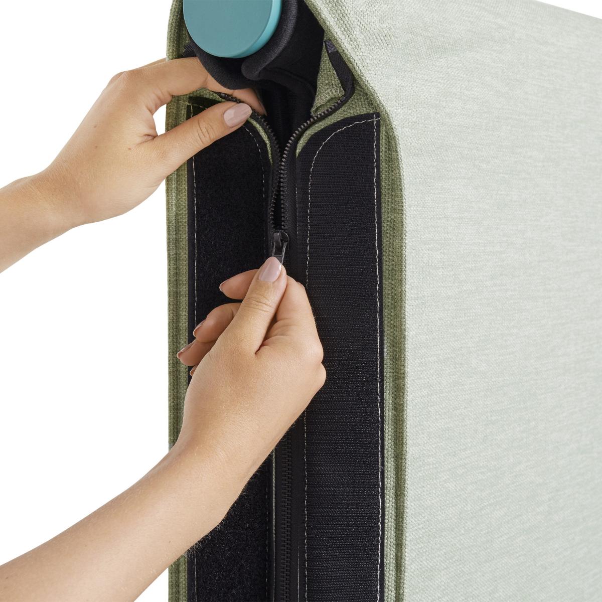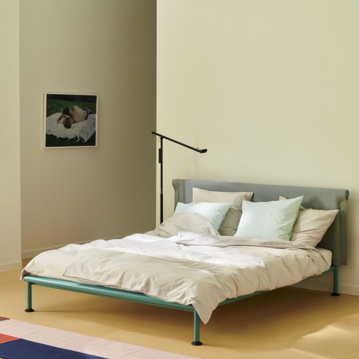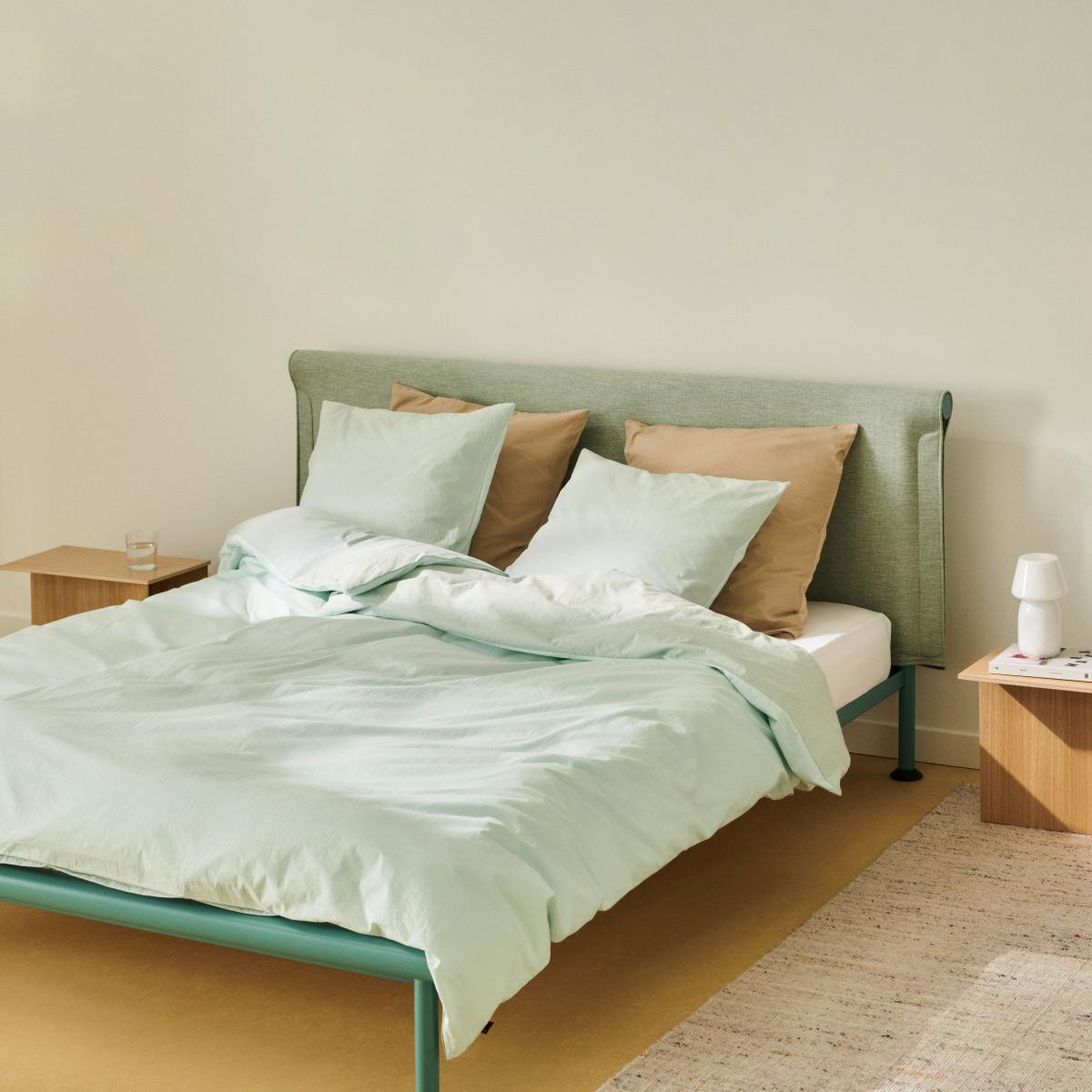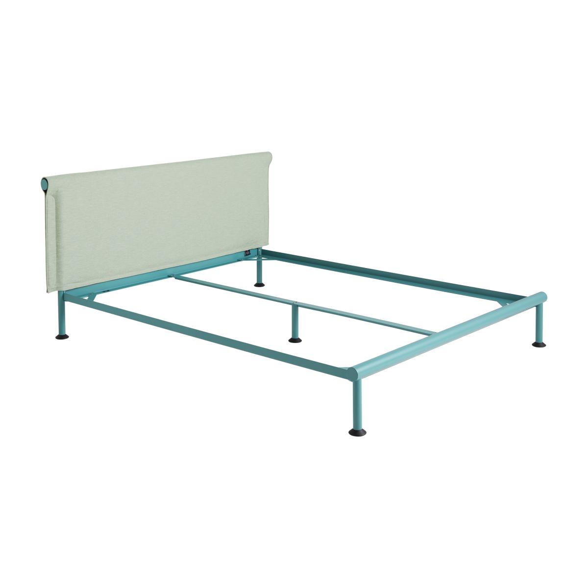 A simple, modern style for this bed created by American designer Shane Schneck. Tamoto combines quality materials and impeccable finishes. It stands out with its soft, fresh mint / turquoise hue. This bed harmoniously combines a sleek, thin steel frame with a headboard covered in high-end fabric. The padded headboard offers perfect support and maximum comfort. This double bed is suitable for a 160 x 200 cm mattress (mattress not included). The bed base is not included. This 160 x 200 cm bed requires two 80 x 200 cm bed bases (set of 2 bed bases sold separately). Based in Sweden, American designer Shane Schneck has received international recognition, winning Red Dot, i. F and Wallpaper design awards. His simple creations often contain an element of surprise in their design: it can be their colour, shape or use of materials.
