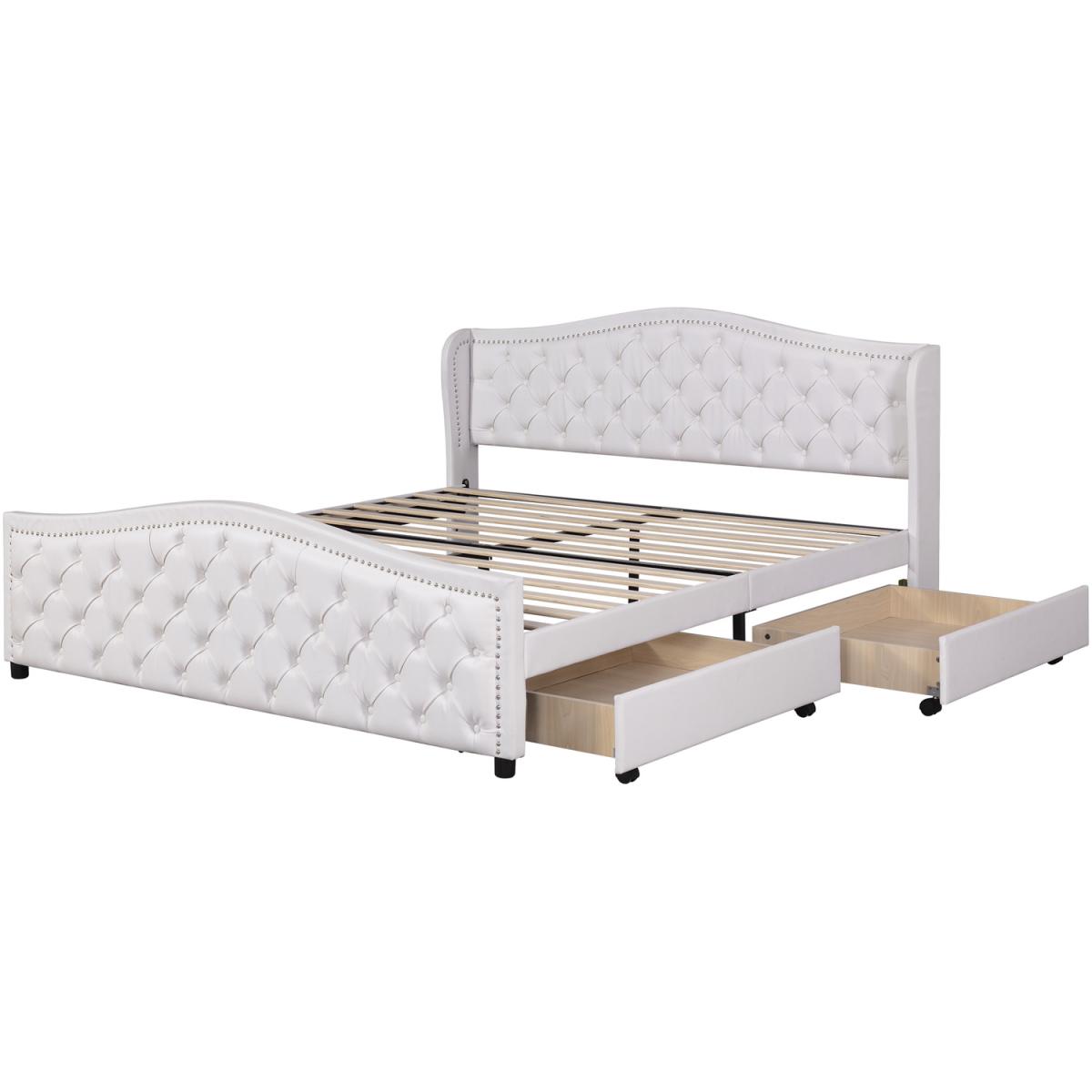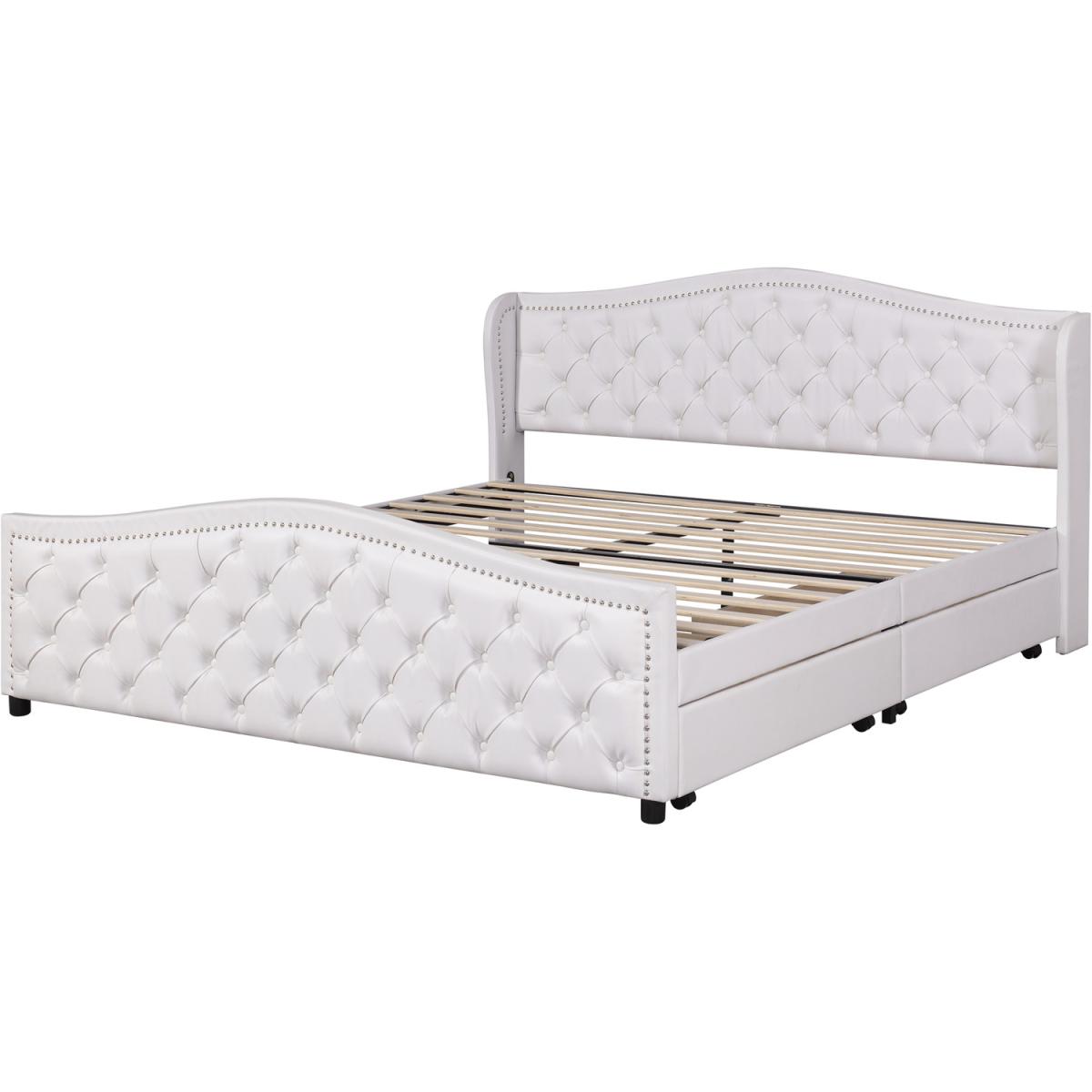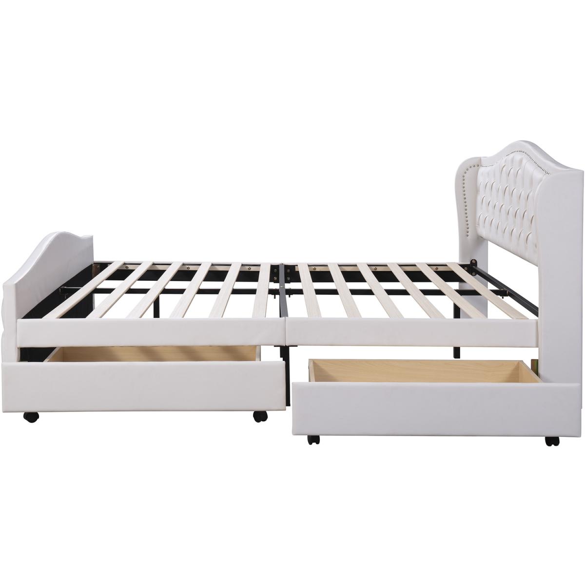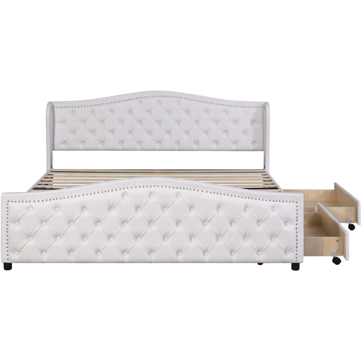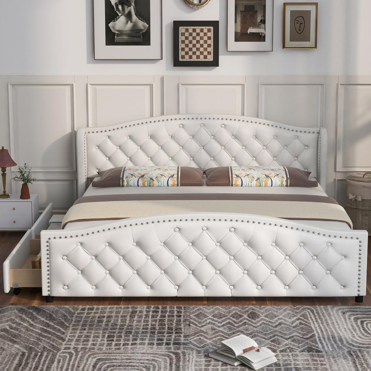 Style design. Designed in Chesterfield style for a luxurious and classic look. The higher headboard (100cm) offers you a more stable and more comfortable head and back support. The upholstered bed is made of soft leather fabric.smooth and soft and offers you a perfect sleep experience. The leather tissue make cleaning easier. Beautiful appearance. The beautifully padded bed looks stunning.the footrest is much higher than the bed. elegant and luxurious.as well as the headboard. all with characteristic diamond stipping and large button strips. The top of the headboard and footrests are corrugated.which gives the upholstered bed a feeling of change and river. Pagant storage function. Two large drawers to be opened on the side enable easy storage of pillows. blankets. clothing for the off season. Offer more storage space in the bedroom. The drawers can be repositioned and you can choose whether you want to place you on the left or right. Extended configuration. The headboard is high and the interior is full of sponge. which gives you a more comfortable neck and headrest and gives the upholstered bed an elegant look. The bed frame is made of high quality wood. The base is solid. made of solid pine and a steel middle bar. Falter slats offer optimal support for your own mattress. Scope of delivery upholstery bed: bed frame. slatted frame.assembly instructions. It's not included in the mattress. Installation method. It has to be installed. The delivered product contains detailed instructions and the required installation tools. It is recommended that two people install it together. It is expected that it will be completed in 1 hour. Dimensions Details Headboard height:100cm Height bed part:33 cm. Applicable mattress:140 x 200 cm. Inner dimensions of the drawer:77 x 57 x 12 cm Total dimensions:212.5 x 146 x 100 cm. Thickness of the headboard:7cm Reference material:leatheretteColor:White Latters rust quantity:12. Max. Weight capacity:300 kg Net weight and gross weight:47kg and 52.8 kg