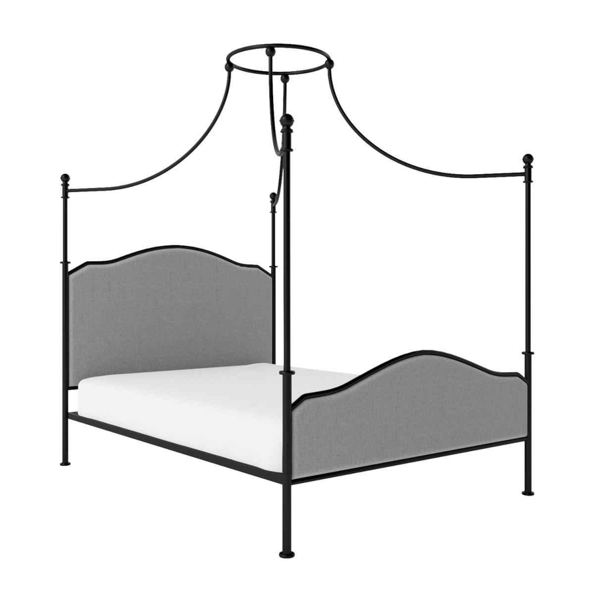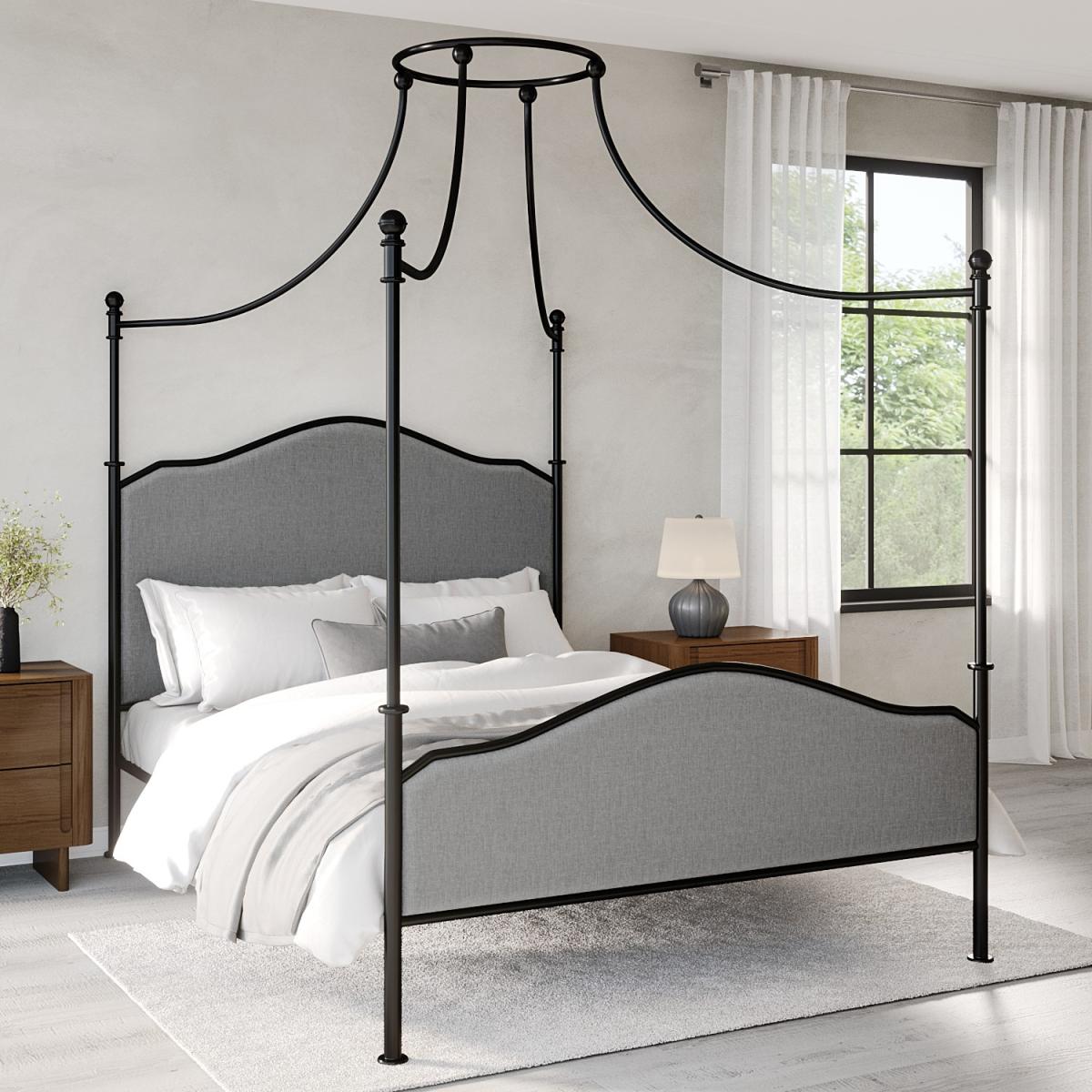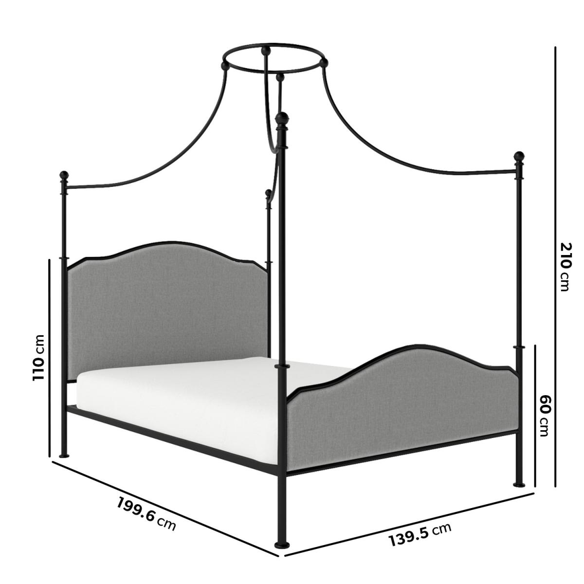 Features we love Enchanting French-inspired double canopy bed A modern take on the classic 4-poster bed frame Upholstered in a chic light grey woven fabric Black frame contrasts beautifully with the upholstery Receive 10% off your perfect mattress with this bed All about me Add a sense of classical elegance with this French-inspired four-poster canopy bed with an integrated padded headboard and footboard. With its slender silhouette and crown-like central feature, it would perfectly adorn any master bedroom. It can be dressed with sheer voile drapes to add a dramatic effect. It's sturdy, too, thanks to the metal frame and wooden sprung-slatted base, so you'll have assured mattress support, and there's even space beneath to add under-bed storage. It fits a UK standard double mattress that isn't included, so you can choose one that's perfect for you. Need to know Dimensions:W140 x D200 x H210 cm Finish: Upholstered Material:Woven fabric Colour: Grey and black Frame: Metal Base: Sprung-slatted Assembly Required:Yes Mattress Included: No Mattress Size Required: UK double (4ft6/135x190cm) Packaging Dimensions: Box 1: W127 x D150 x H15 cm. Box 2: W19 x D203 x H13 cm