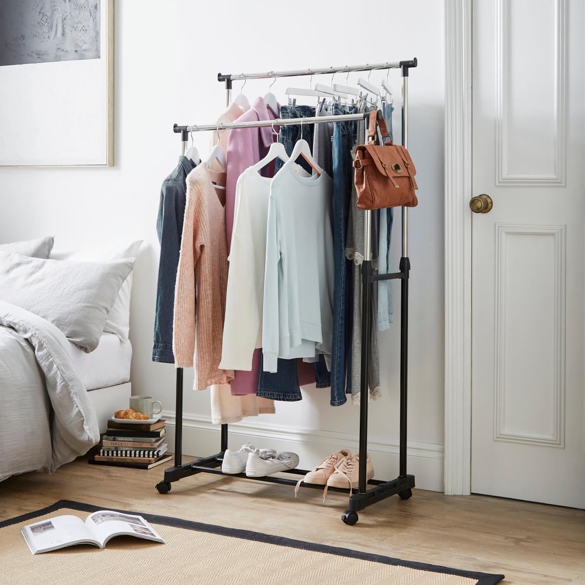 The double clothes rail in black is a practical addition to both modern and industrial-inspired interiors. Its clean, streamlined look makes it versatile, fitting well in bedrooms, dressing areas, or utility spaces where functionality is key. I love how it maximises vertical storage, keeping things organised and accessible without taking up too much space. Style tip: pair it with mixed textiles or statement hangers to add a personalised touch, or use it as a backdrop for colourful or patterned clothing to create a layered, curated effect. It’s a great piece for those needing flexible storage that’s both functional and stylish.