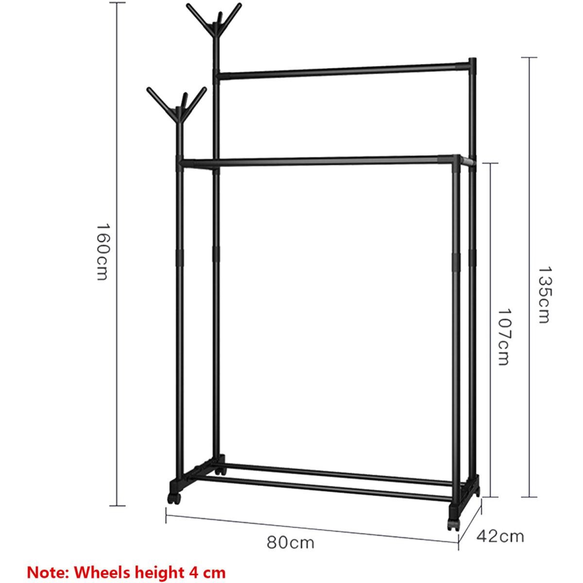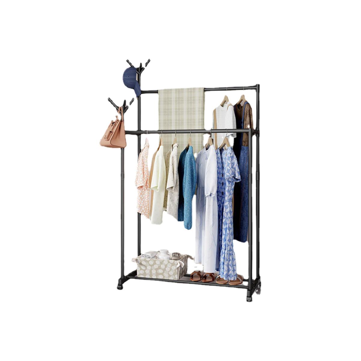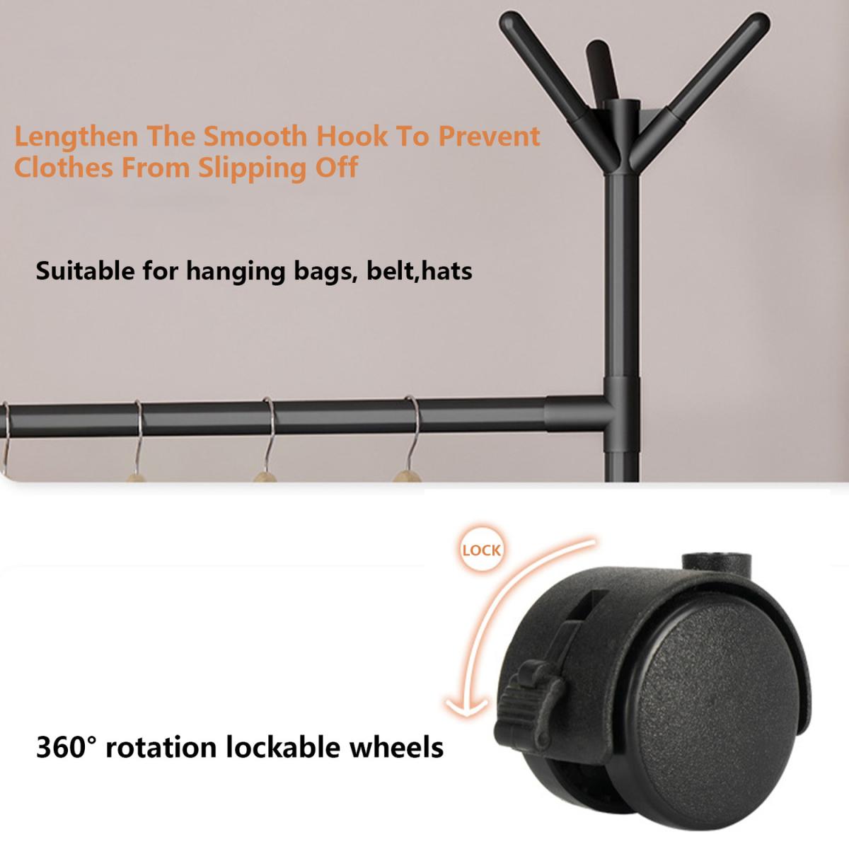 Double clothes rail clothing rack stand with 6 top hooks and bottom shelf. The top of the metal garment rack with double hanging rods for hanging shirts, clothes, dresses, pants, T-shirt, coats, jackets etc. 6 hooks on the side of the tidy rail can be used to hang hats, bags or other thing you want. A double steel rod at the bottom can store your shoes and storage boxes. The clothes display is equipped with 4 wheels, rotate and lockable, easy to move the rack to anywhere you want. Perfectly fit for bedroom, boutique, showroom, hallway, balcony, laundries, photo studios, clothes shop and so on.