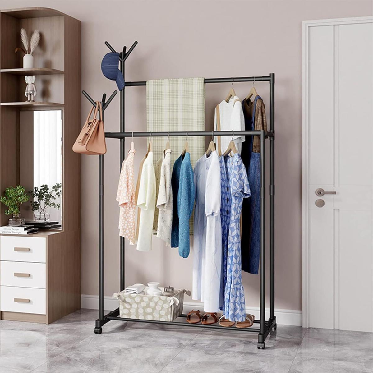 Double Clothes Rail Garment Rack Clothes Stand with Wheels - Black